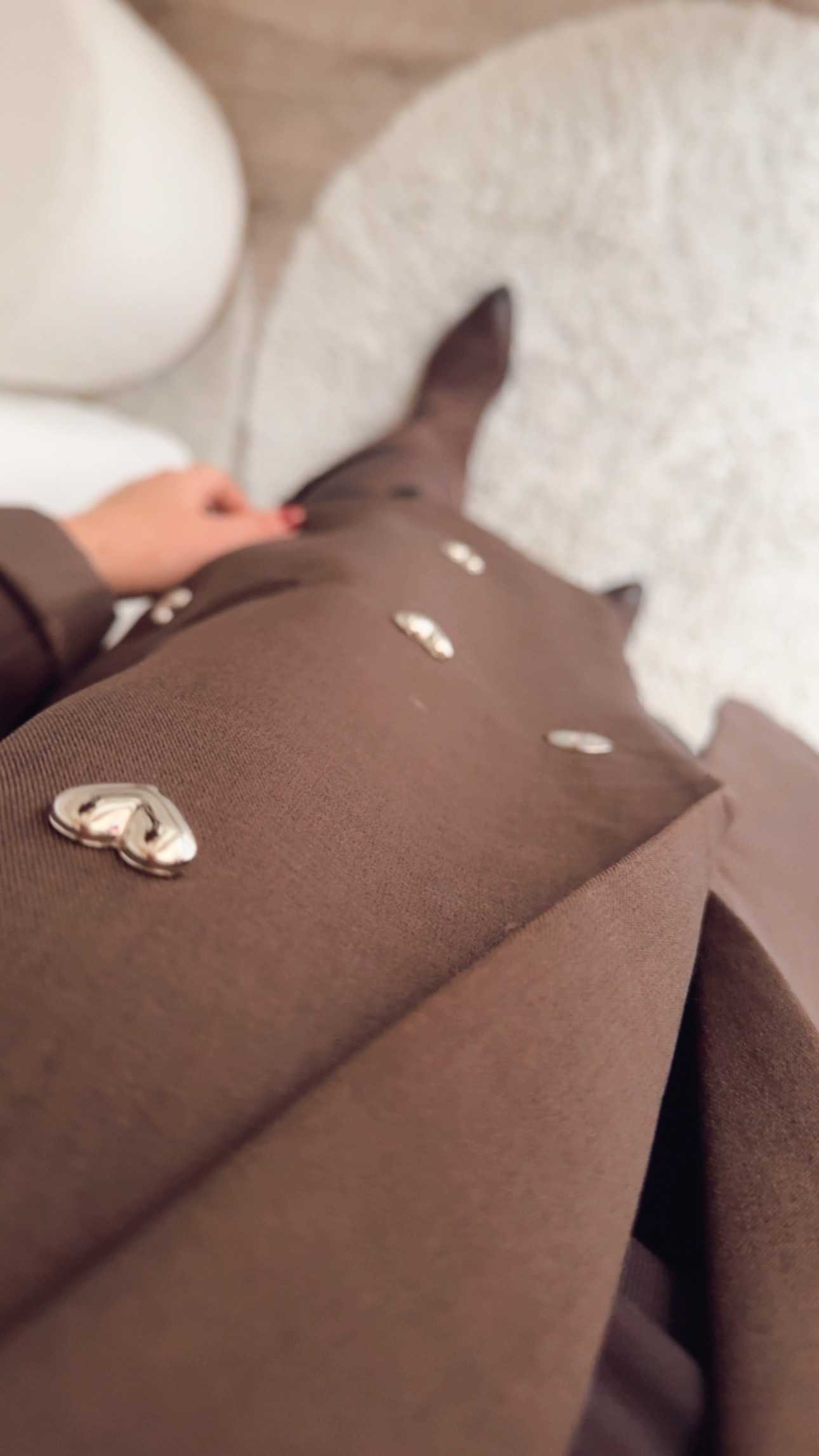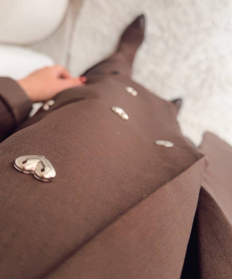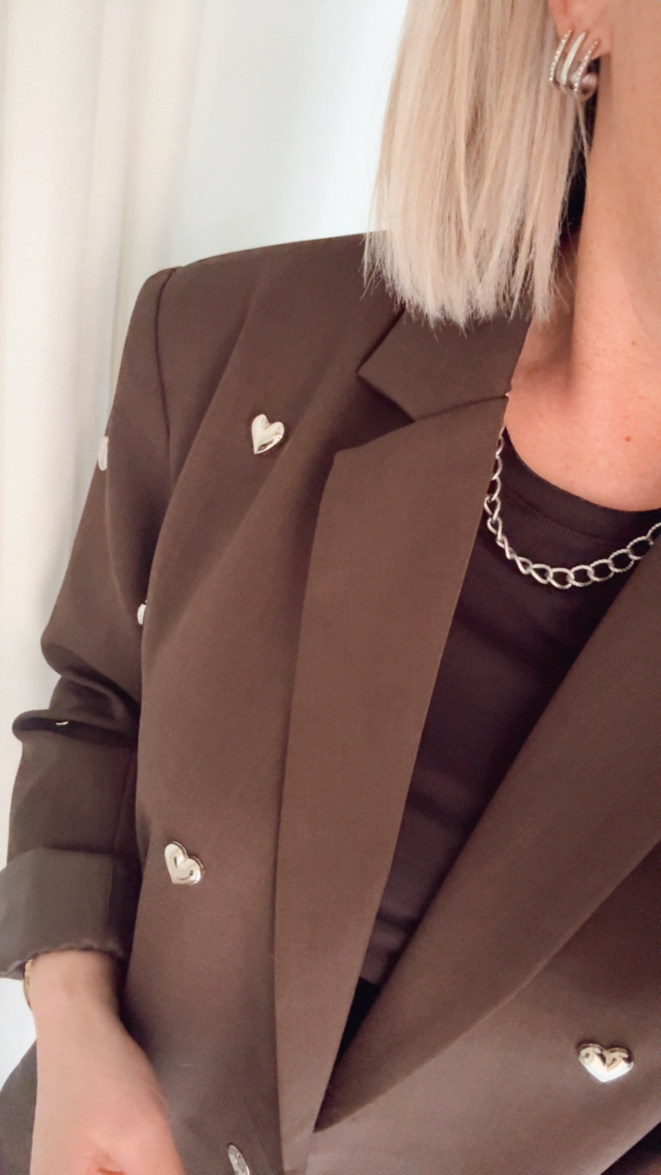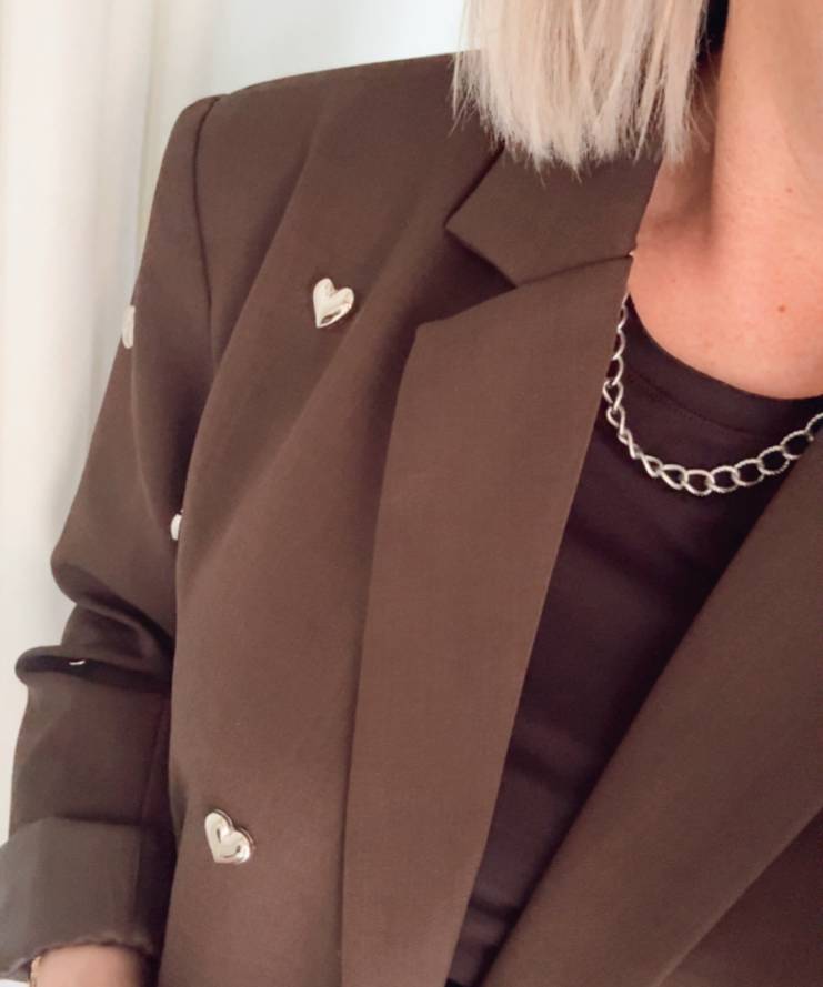 Een klassieke, chique, perfect getailleerde snit… verfraaid met kleine metallic hartjes die een speelse en vrouwelijke touch toevoegen. Een subtiele twist : gedurfd, zacht en een vleugje romantiek.