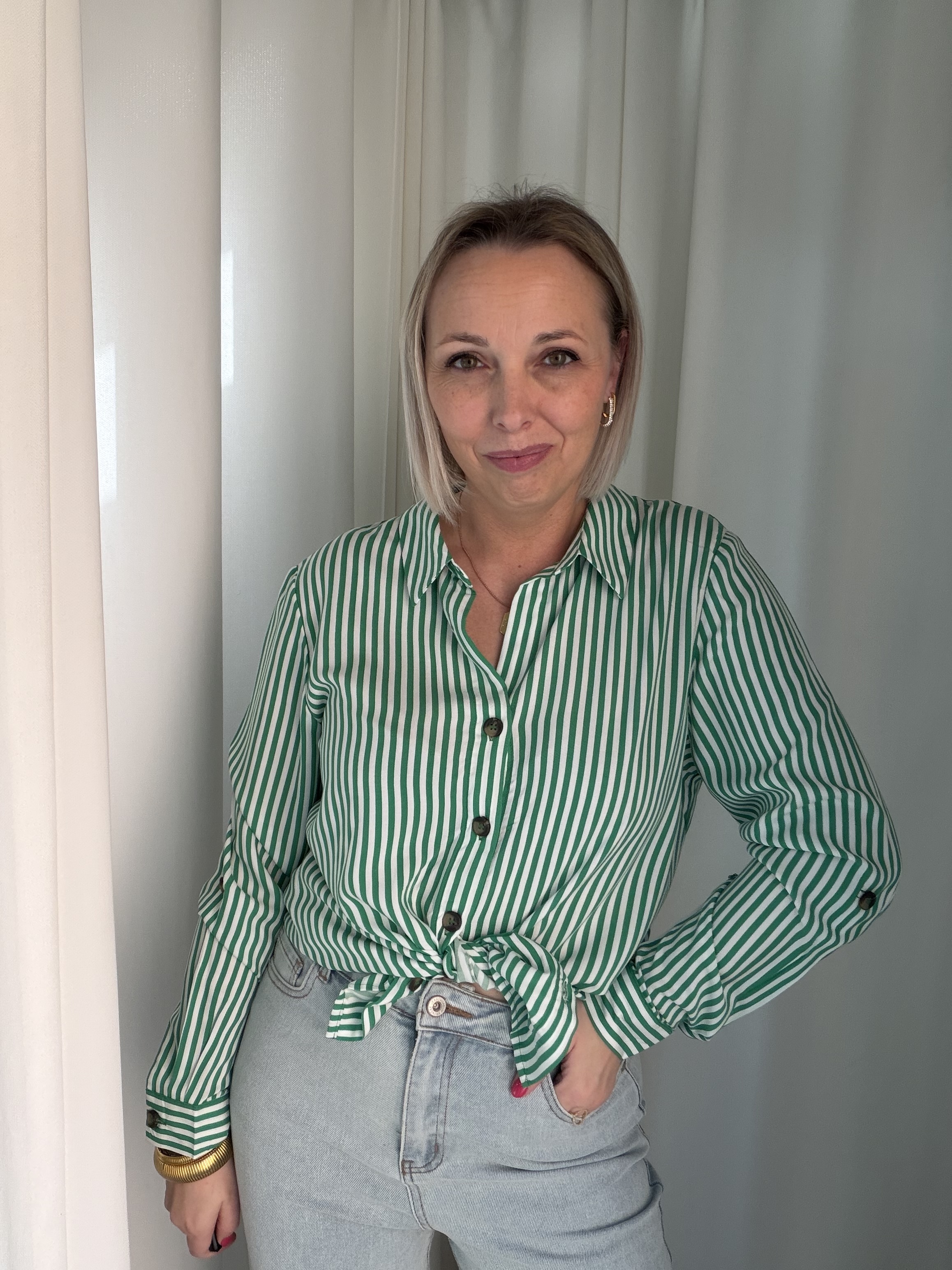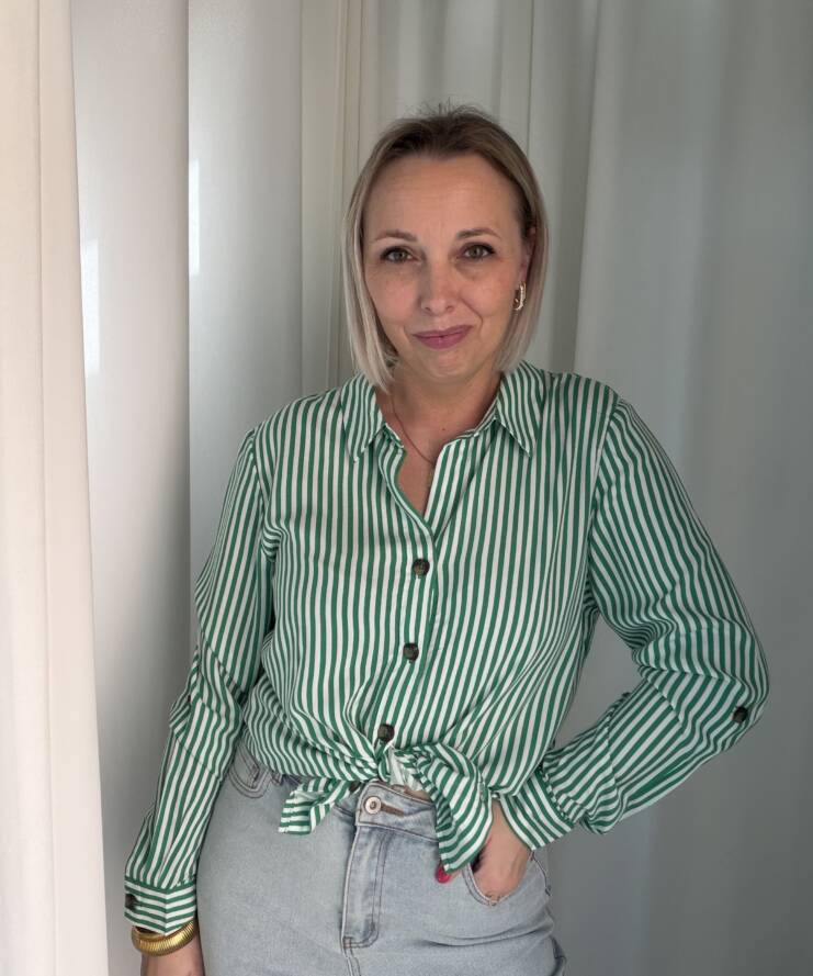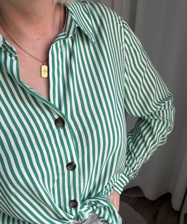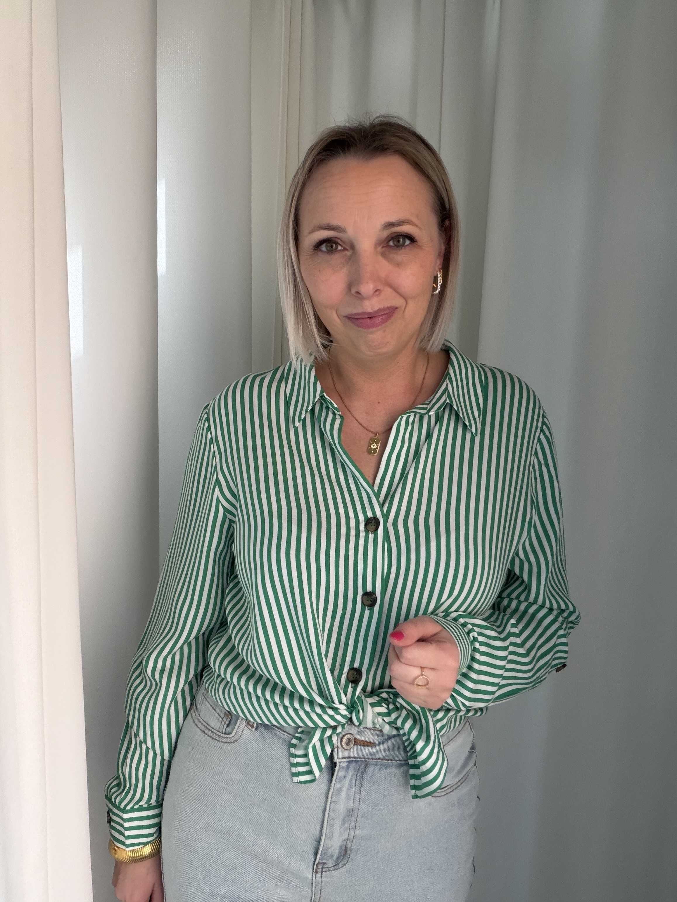 De Sienna Stripe Blouse is een tijdloze blouse met een frisse en stijlvolle uitstraling. Het klassieke groen-witte streeppatroon geeft de blouse een moderne, zomerse look die gemakkelijk te combineren is met verschillende outfits.