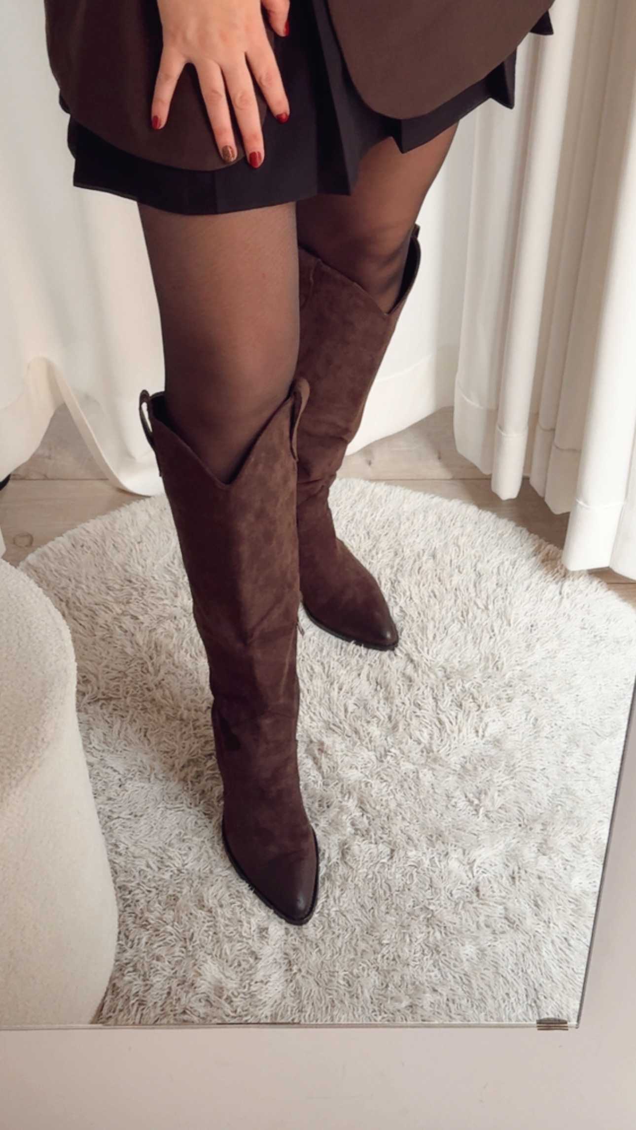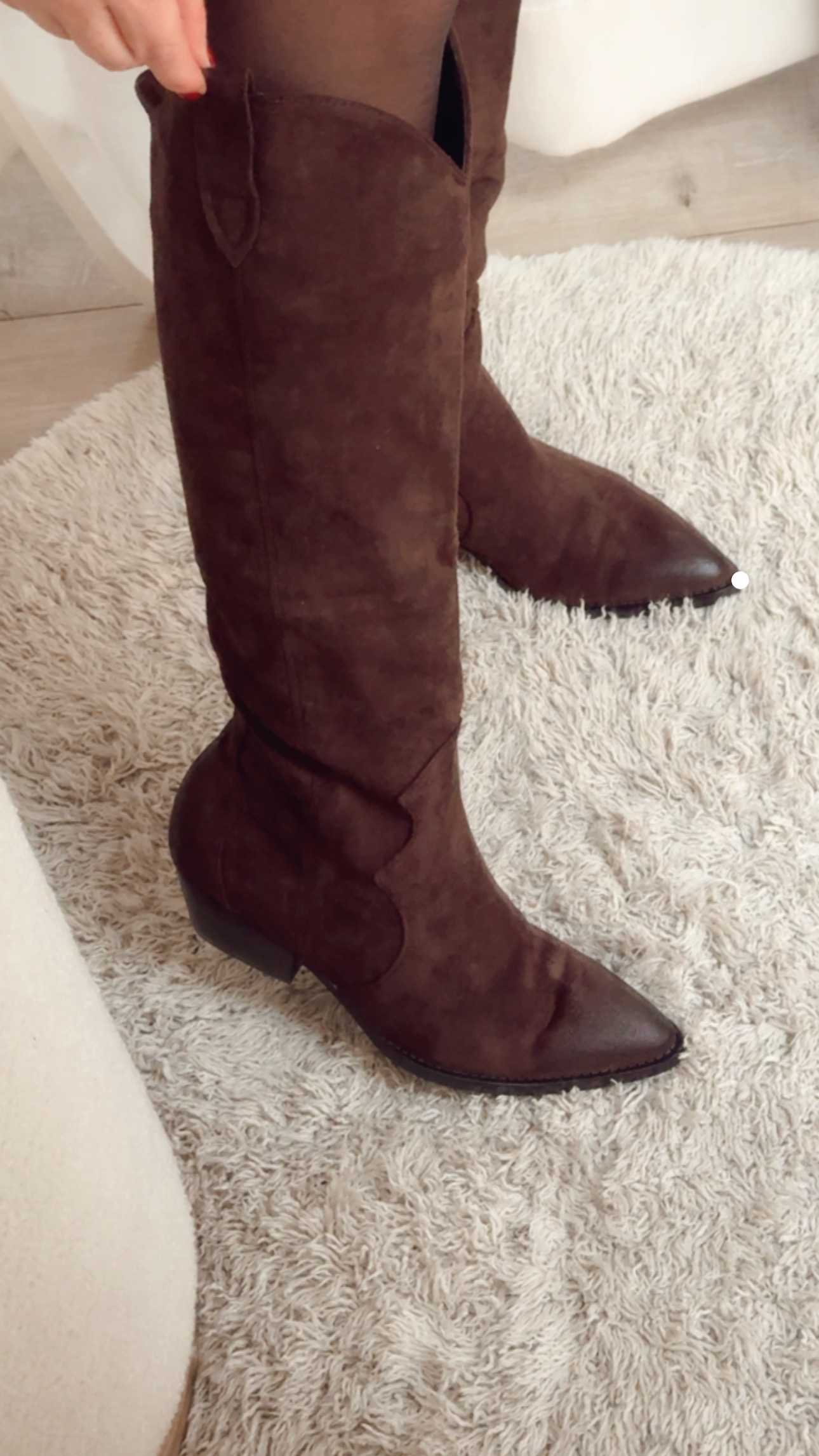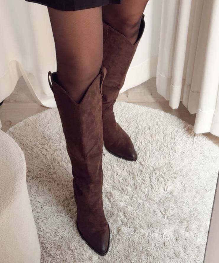 Terug naar de winkelDonkerbruine suède laarzen tot net onder de knie, met een elegant design met een kleine hak, Het cowboyboot design geeft een strakke en verfijnde look, terwijl je dankzij de subtiel hogere hak toch elegantie en een vrouwelijke touch toevoegt.