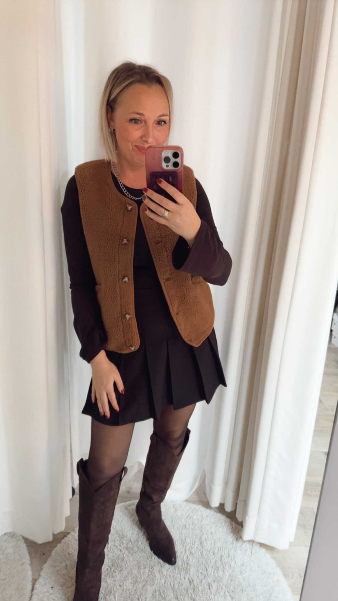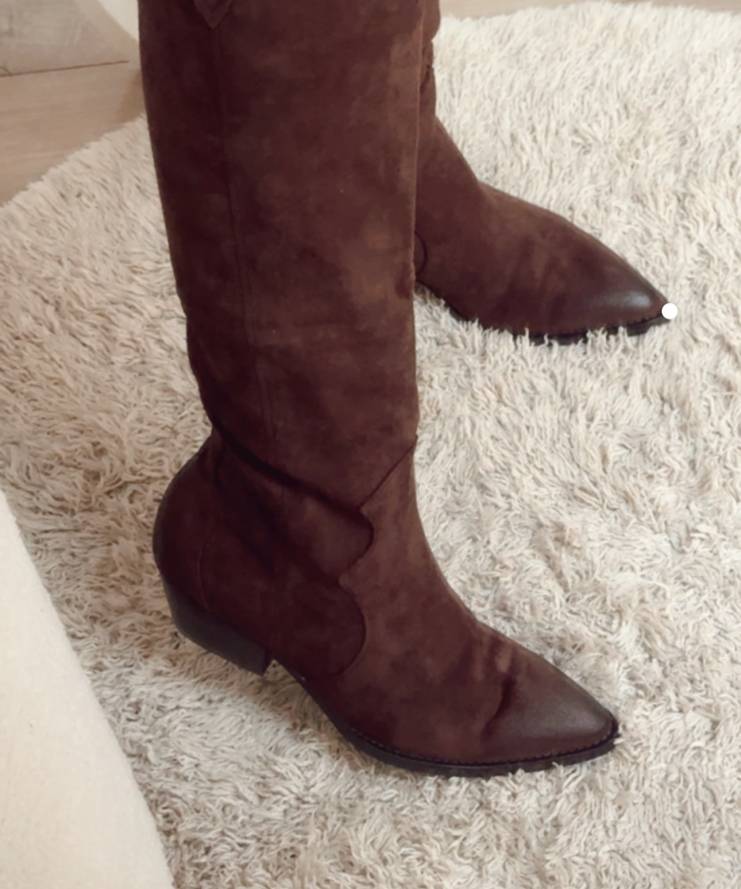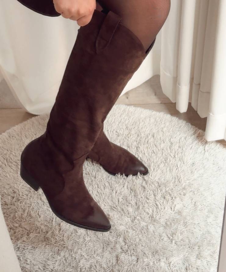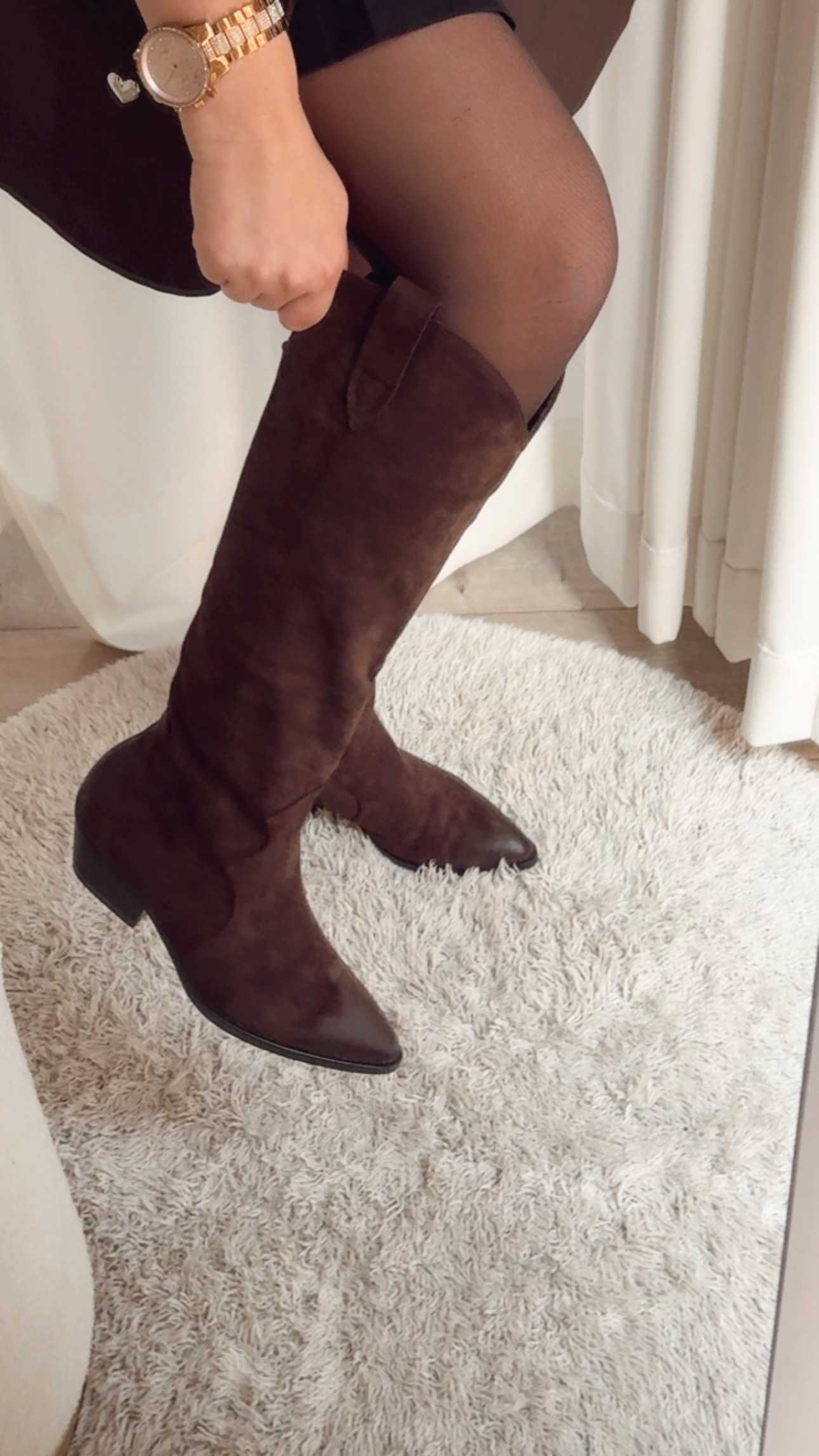 Terug naar de winkelDonkerbruine suède laarzen tot net onder de knie, met een elegant design met een kleine hak, Het cowboyboot design geeft een strakke en verfijnde look, terwijl je dankzij de subtiel hogere hak toch elegantie en een vrouwelijke touch toevoegt.