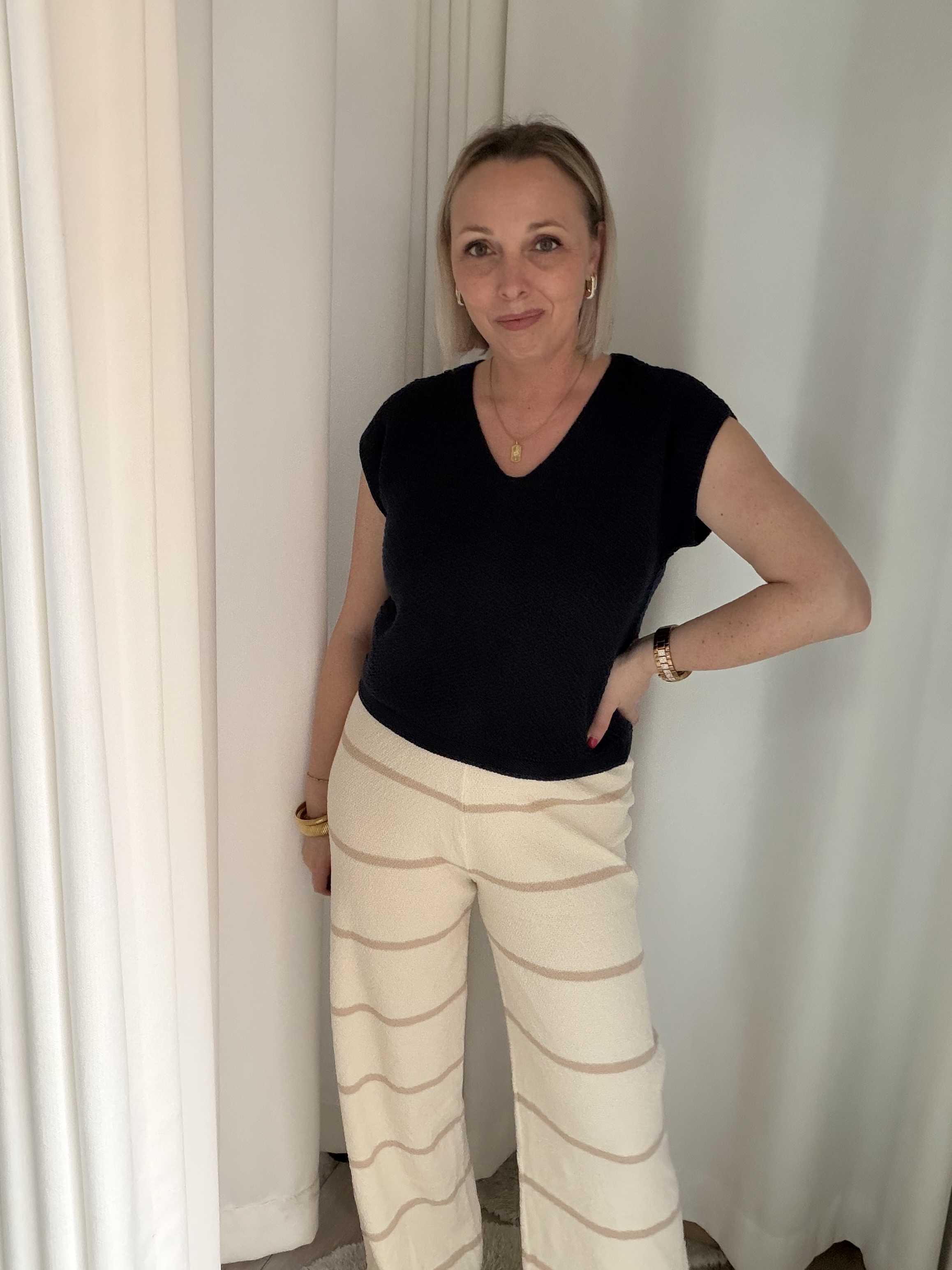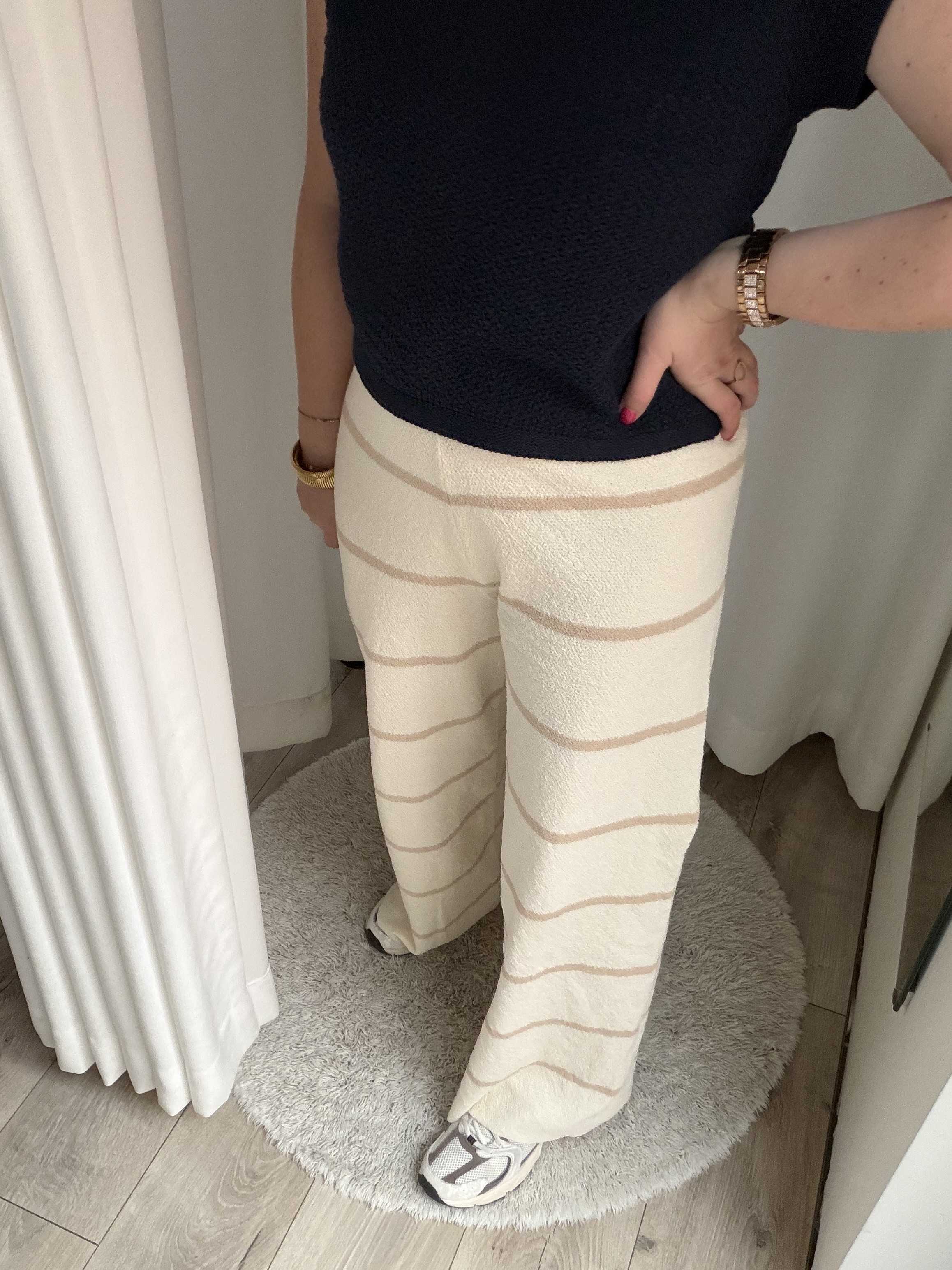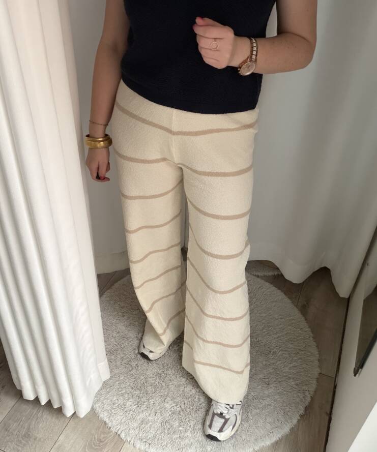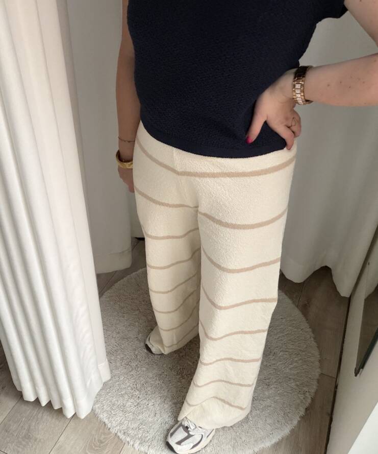 Deze stijlvolle wide leg broek combineert comfort met een moderne, minimalistische uitstraling. De off-white basis met contrasterende beige horizontale strepen zorgt voor een tijdloze en elegante look. Dankzij de soepele, licht gestructureerde stof valt de broek mooi langs het lichaam en creëert hij een flatterend silhouet met een nonchalante, luxe uitstraling.