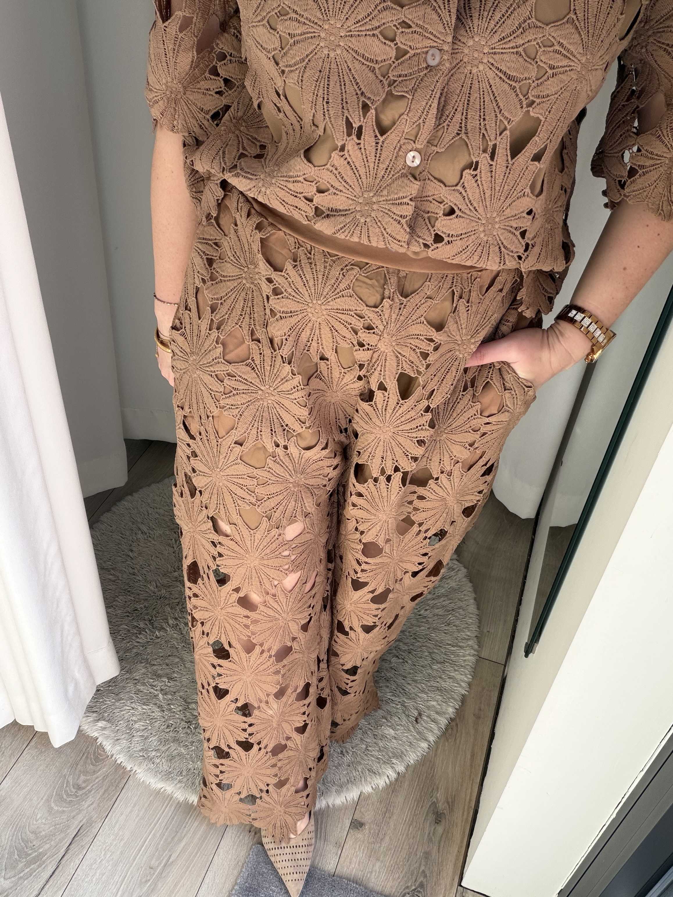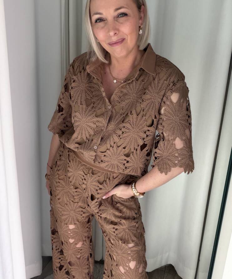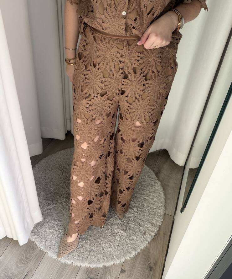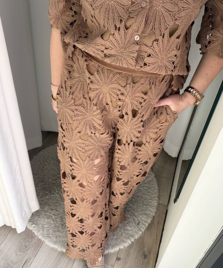 Terug naar de winkelGa voor een stijlvolle en zomerse look met deze kanten broek. Deze elegante broek is uitgevoerd in een prachtig bloemenkant met een verfijnd opengewerkt patroon, wat zorgt voor een luxe en vrouwelijke uitstraling. De warme zandkleur maakt deze broek perfect te combineren en geeft elke outfit een zachte, chique touch.