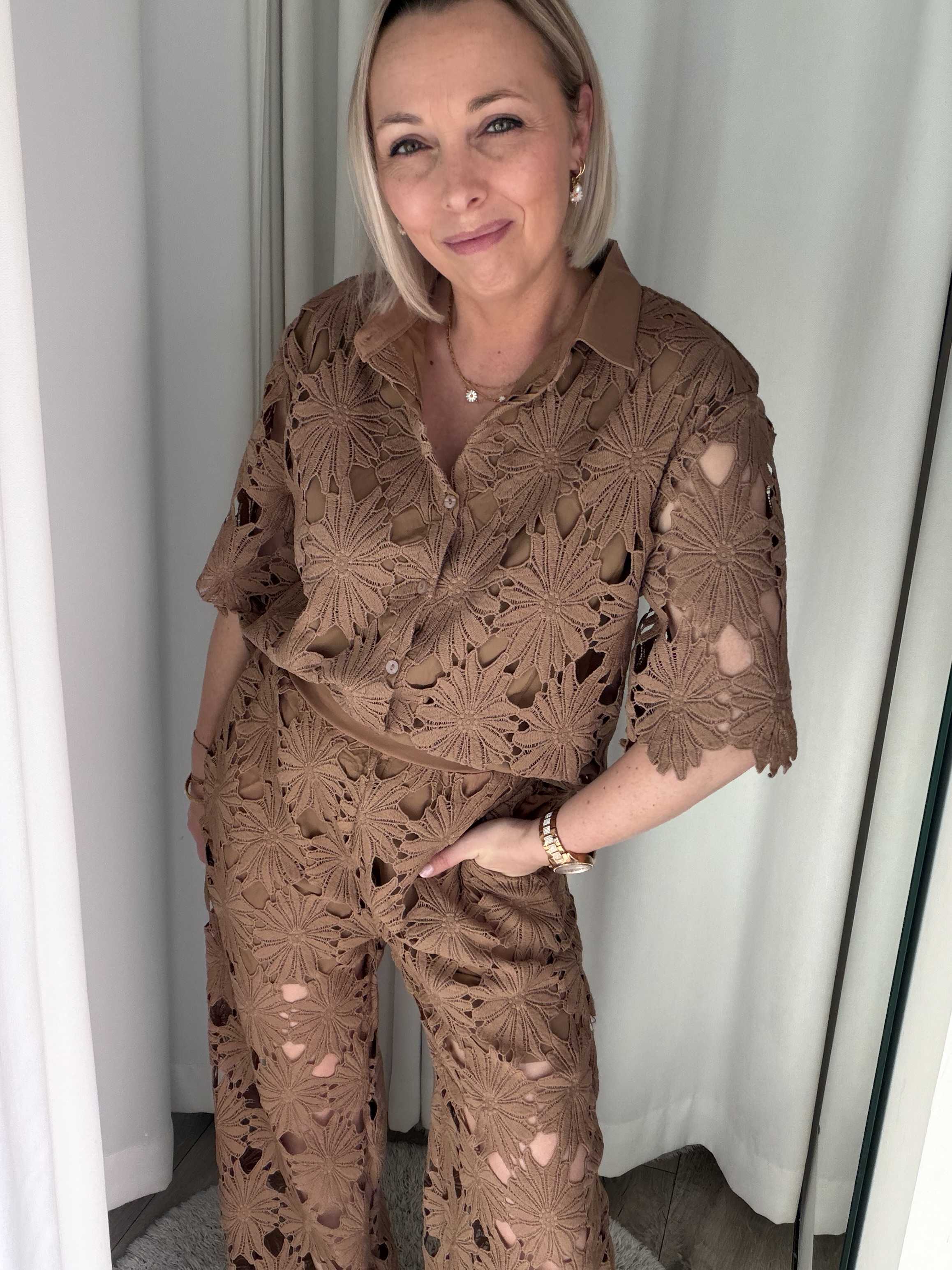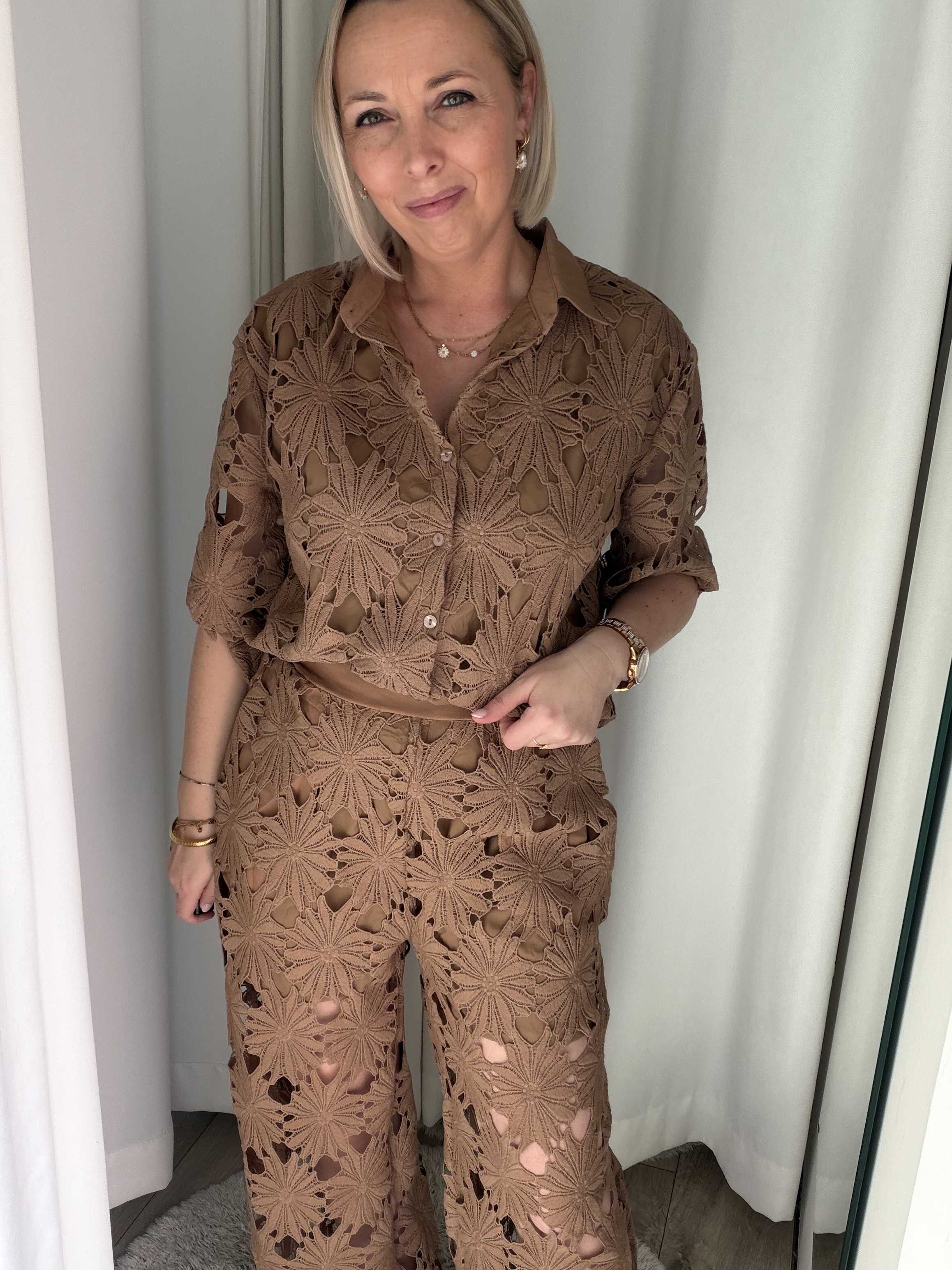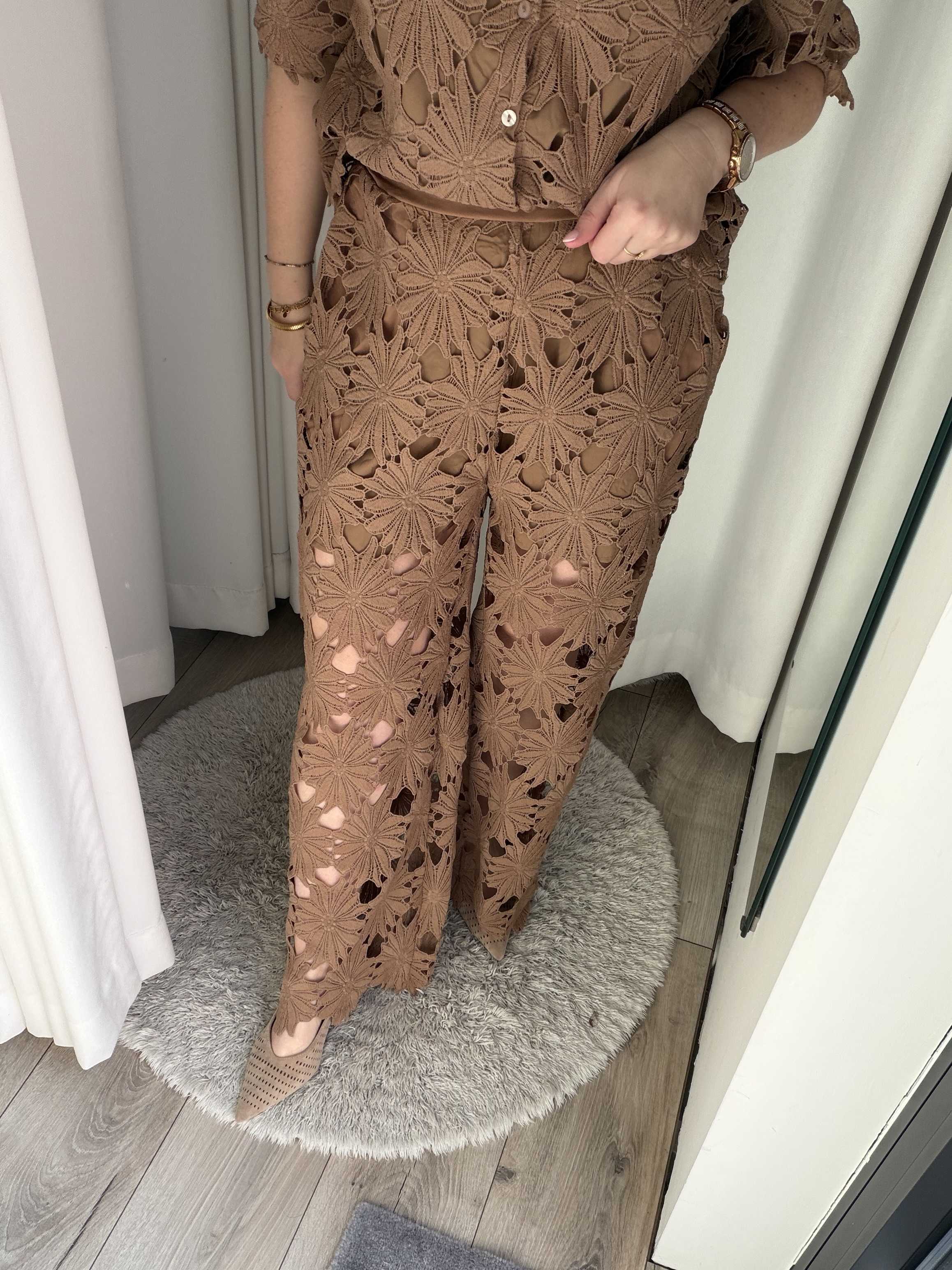 Terug naar de winkelGa voor een stijlvolle en zomerse look met deze kanten broek. Deze elegante broek is uitgevoerd in een prachtig bloemenkant met een verfijnd opengewerkt patroon, wat zorgt voor een luxe en vrouwelijke uitstraling. De warme zandkleur maakt deze broek perfect te combineren en geeft elke outfit een zachte, chique touch.