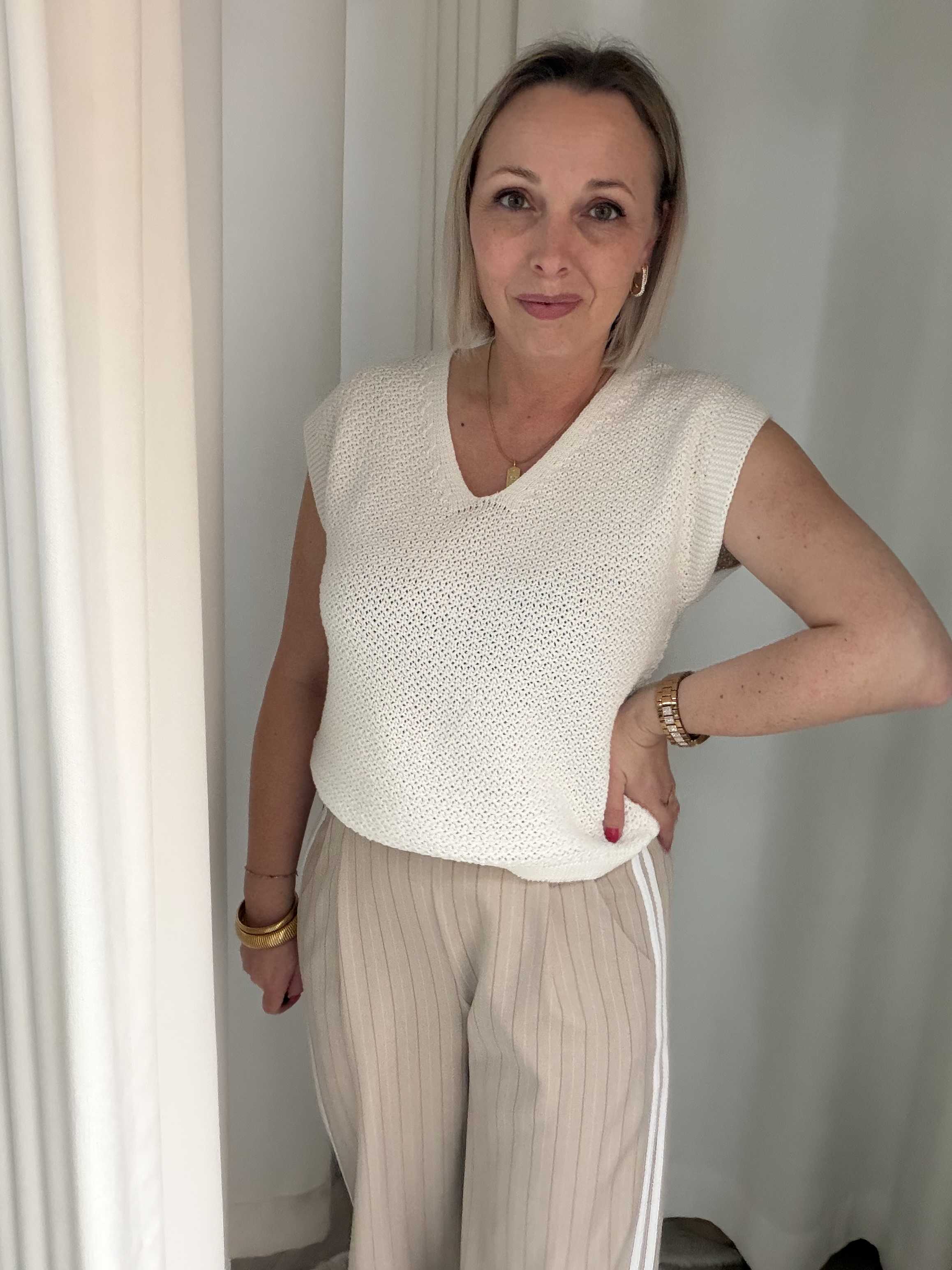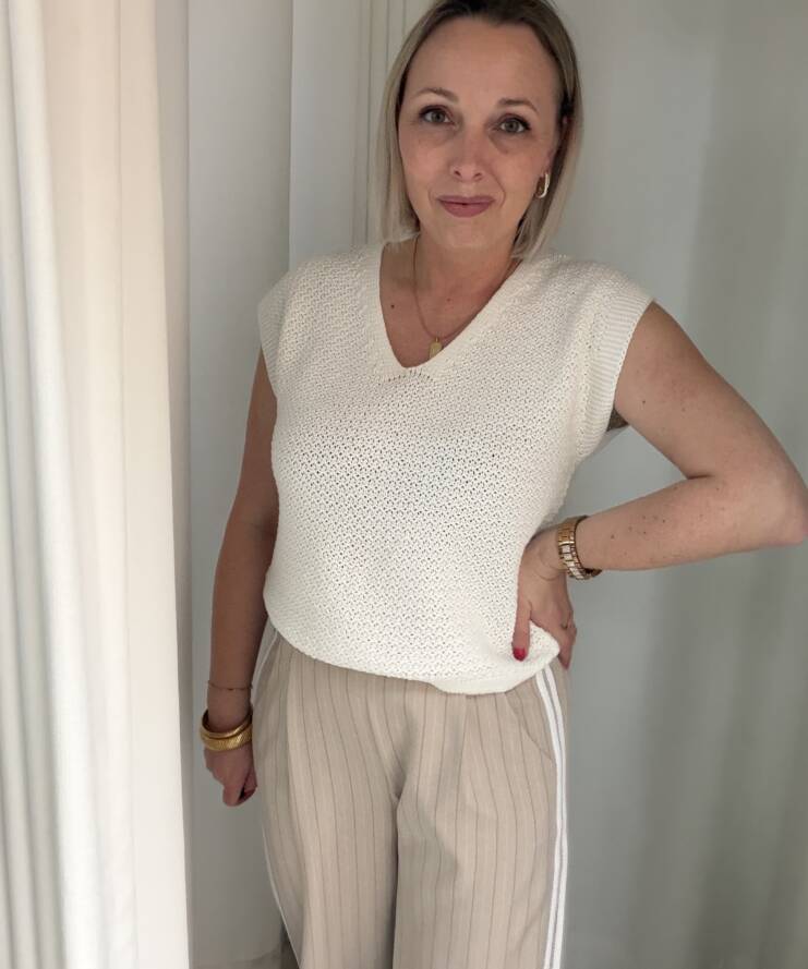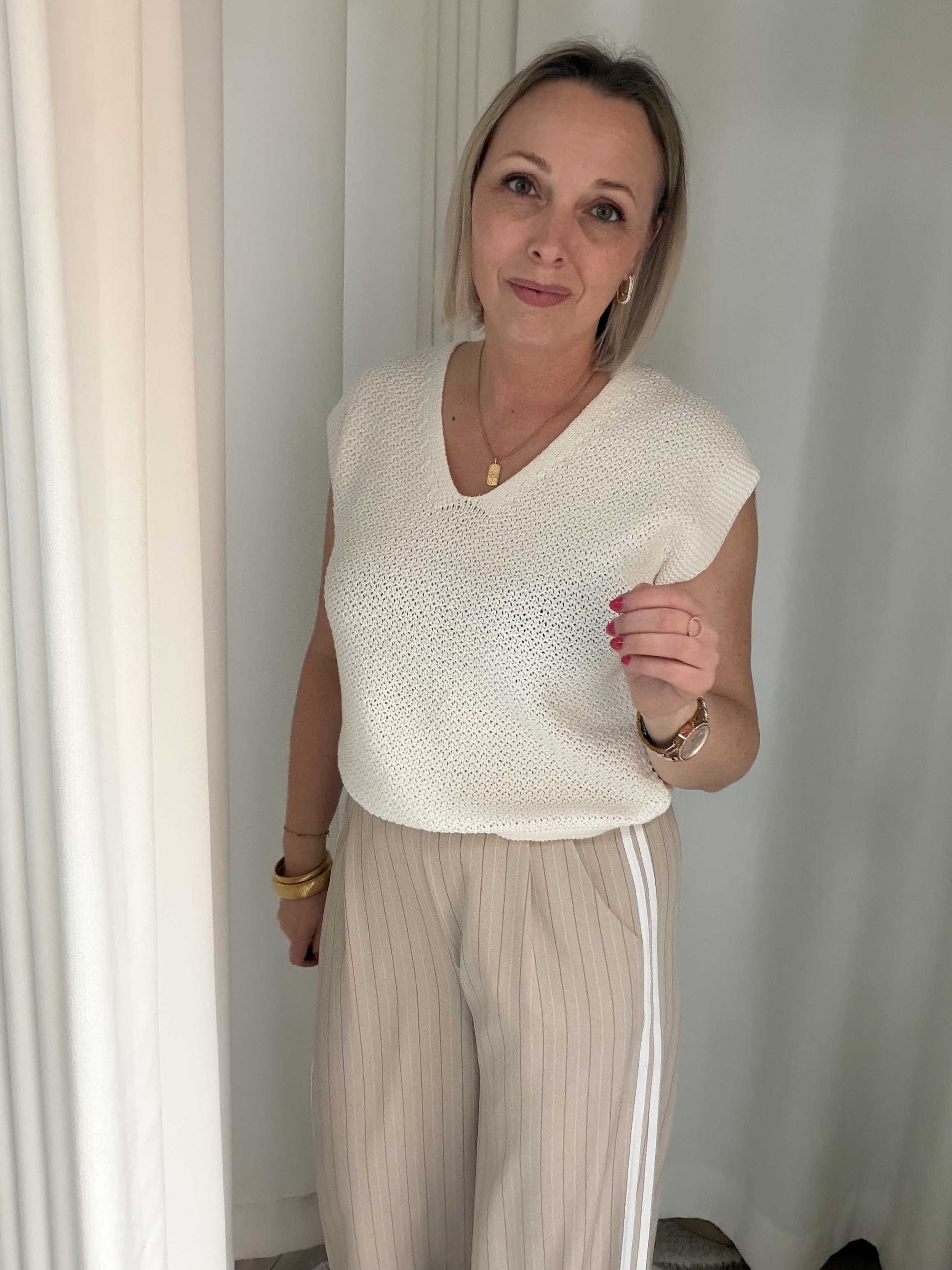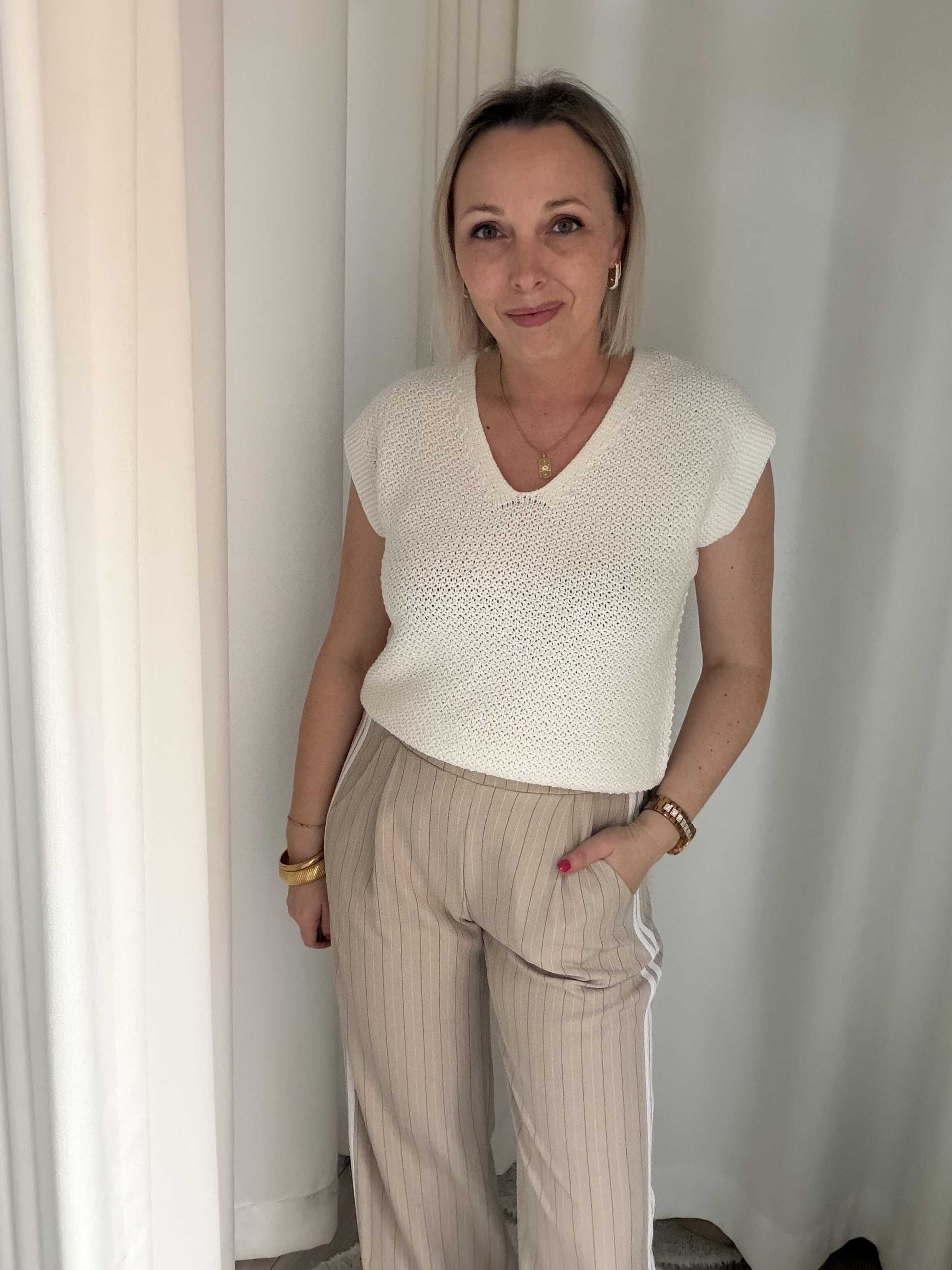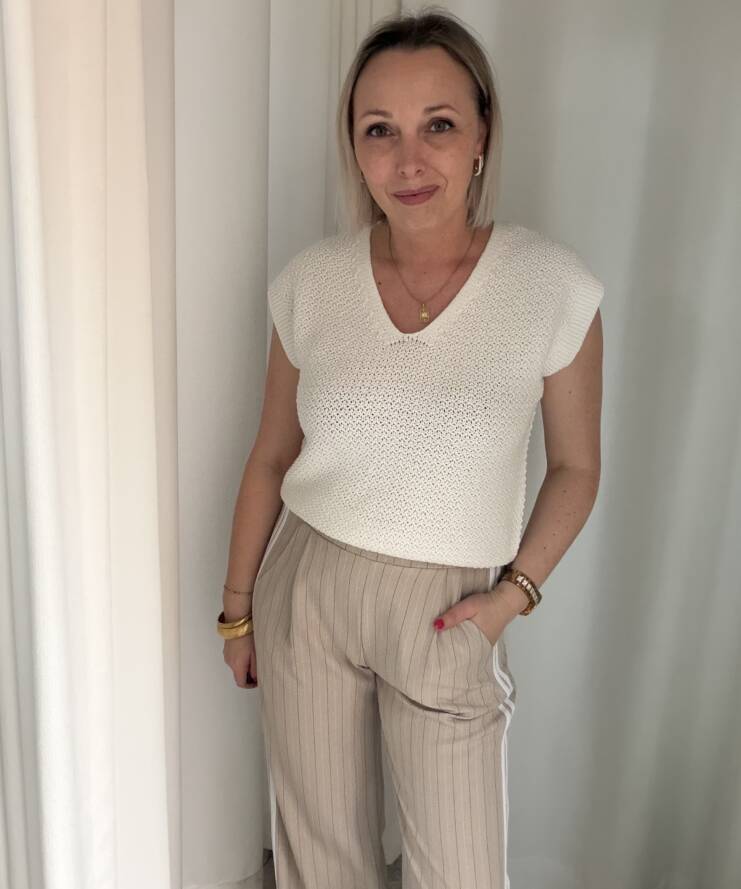 Terug naar de winkelDeze stijlvolle beige broek is een perfecte mix van comfort en elegantie. De fijne strepen geven de broek een tijdloze uitstraling, terwijl de sierstrepen aan de zijkant zorgen voor een subtiele, sportieve touch.