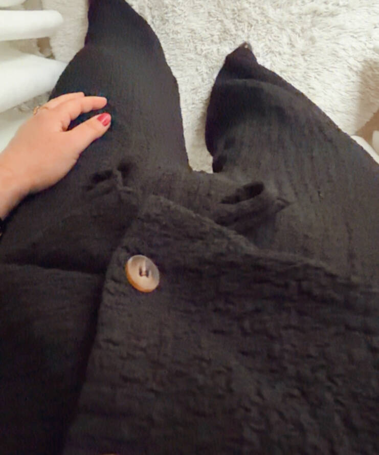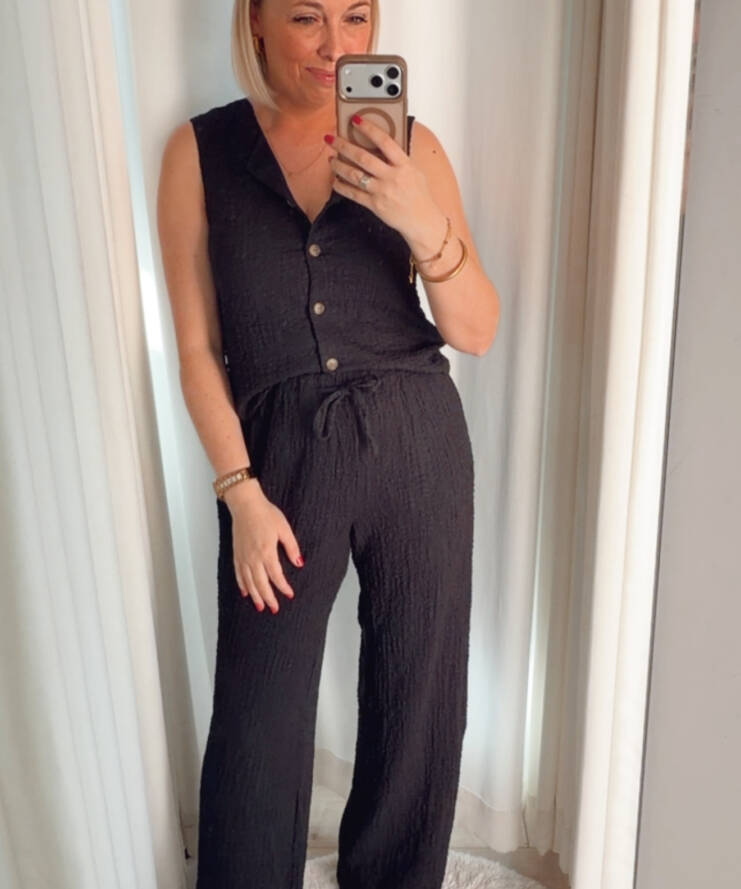 Terug naar de winkelDeze stijlvolle zwarte broek is een perfecte combinatie van comfort en elegantie. Gemaakt van een luxe, licht gestructureerde stof met een subtiele glans, geeft dit model je outfit direct een verfijnde uitstraling. De rechte, wijde pijpen zorgen voor een moderne en flatterende fit, terwijl de elastische tailleband met striksluiting extra draagcomfort en een mooie pasvorm biedt.