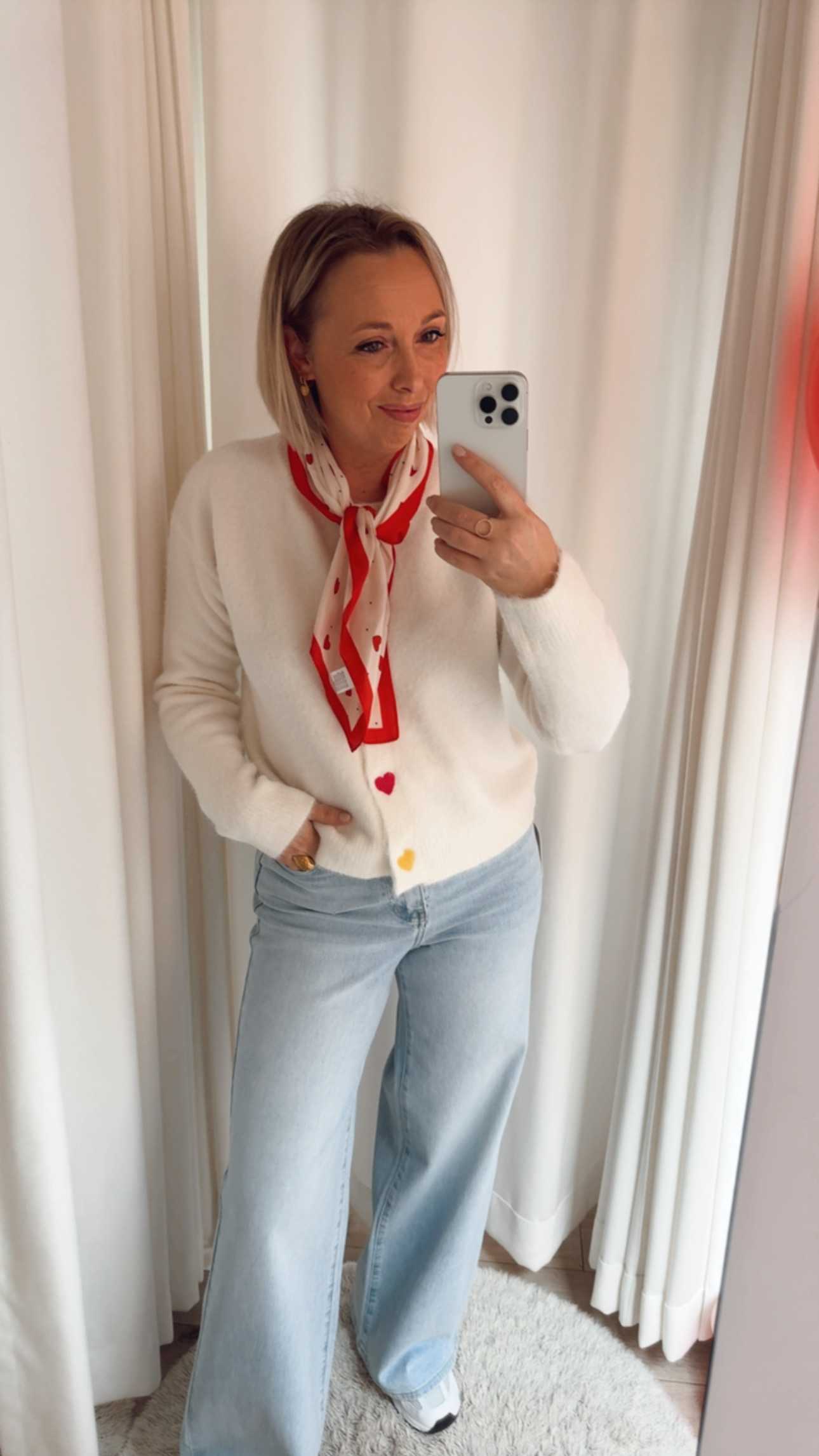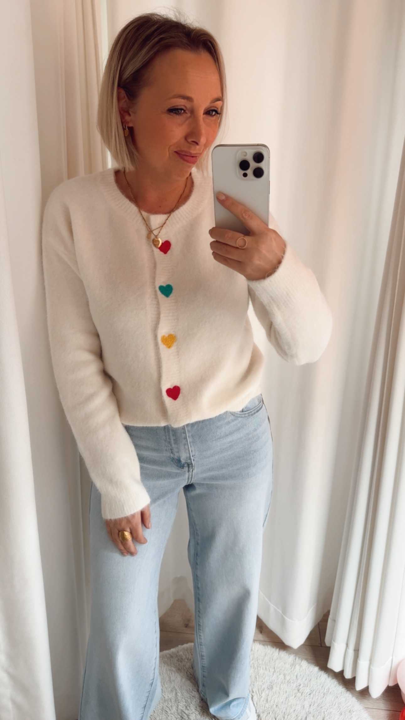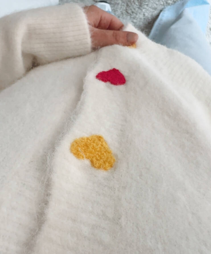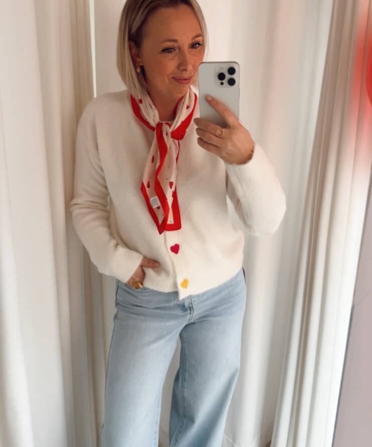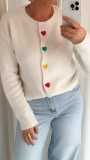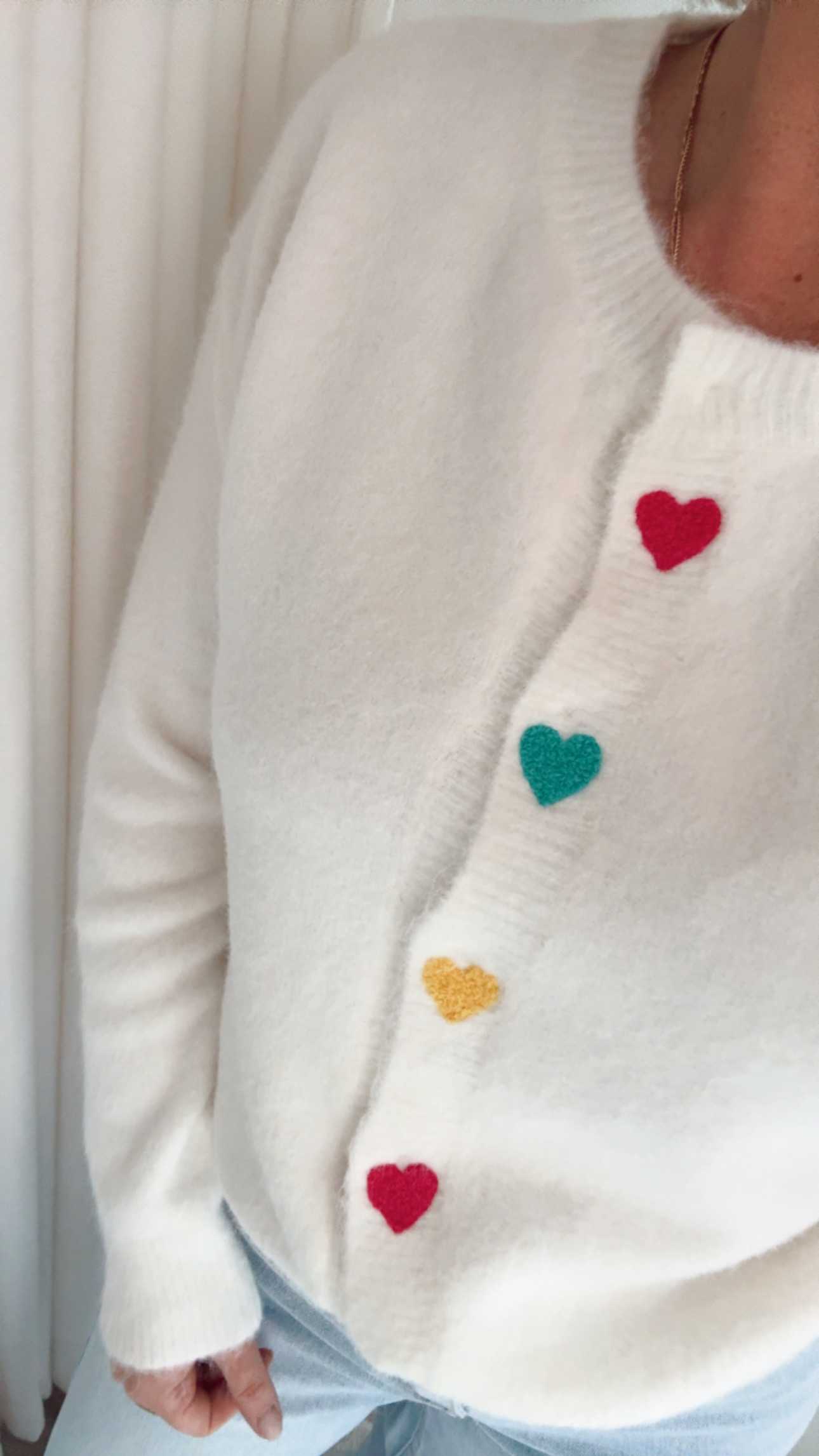 Ontdek onze crèmekleurige cardigan, versierd met vrolijke hartjesknopen die een speelse tint geven. 🌈 Deze luchtige, zachte knit voelt heerlijk aan en is perfect voor een comfortabele, vrouwelijke look op een speelse dag.