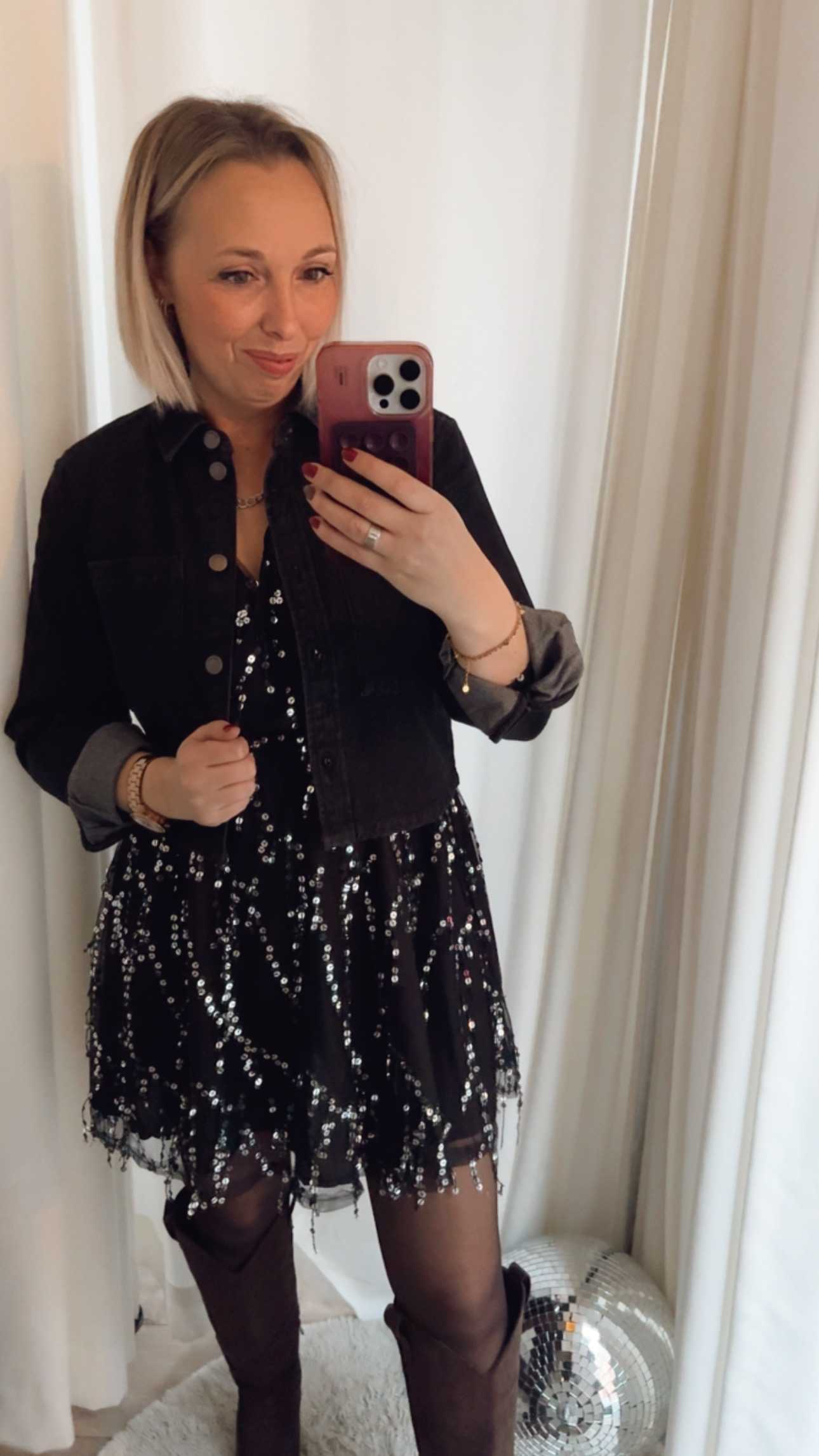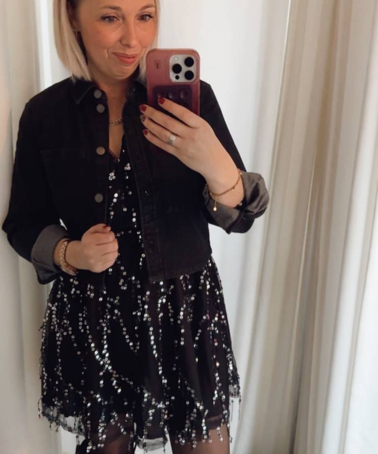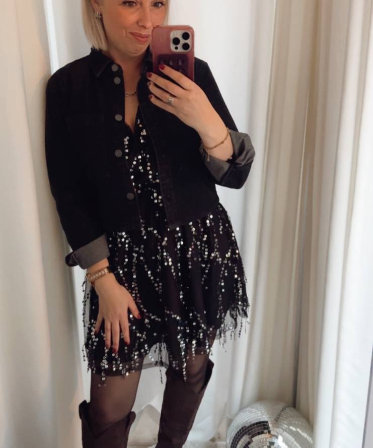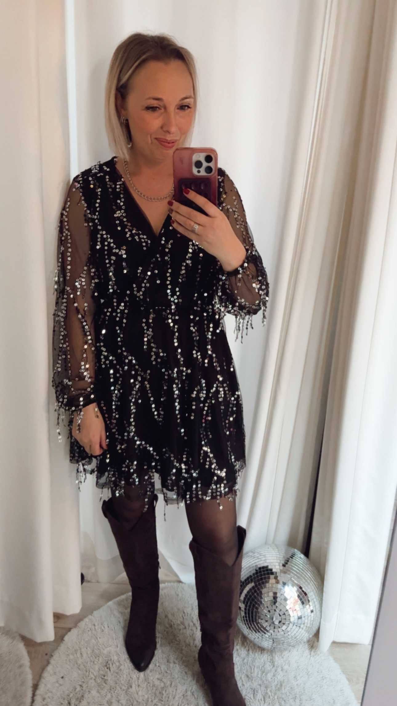 Dit jurkje is ideaal voor de feestdagen, maar ook perfect doordraagbaar voor andere gelegenheden. Het heeft een rekkerband in de taille voor een flatterende pasvorm en een subtiel drukknopje om het jurkje op zijn plaats te houden. Het materiaal bevat wat stretch en voelt comfortabel aan . Behoudt mooi zijn vorm. Het jurkje is afgewerkt met zachte, elegante details en de mooiste pailletten