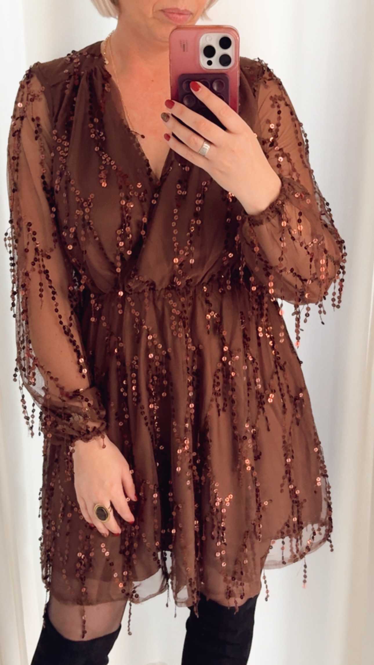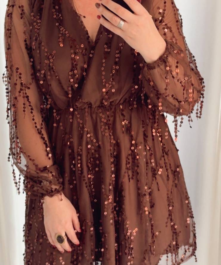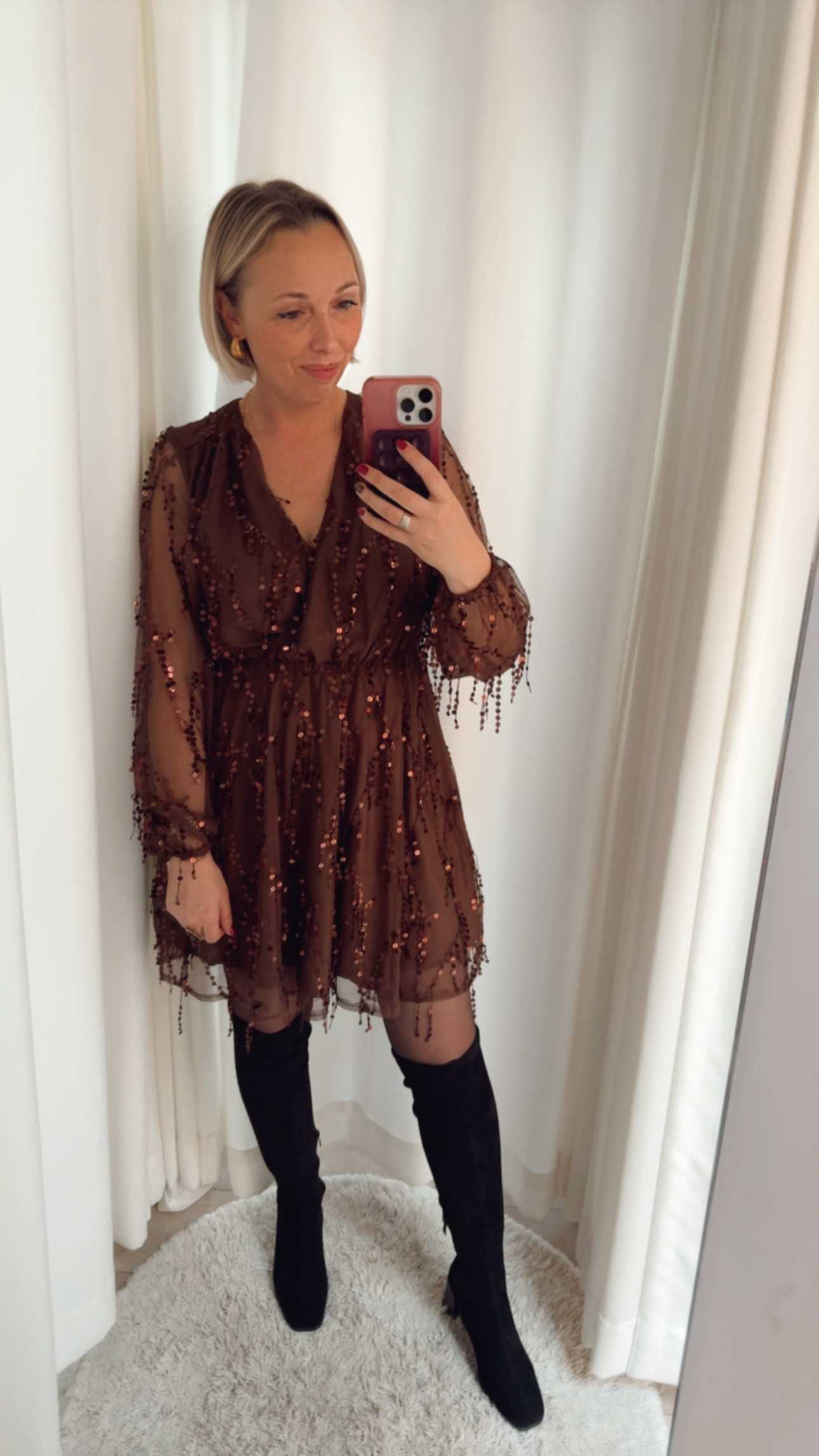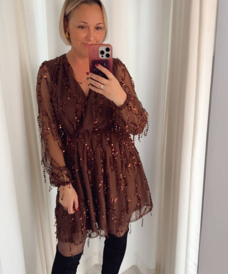 Dit jurkje is ideaal voor de feestdagen, maar ook perfect doordraagbaar voor andere gelegenheden. Het heeft een rekkerband in de taille voor een flatterende pasvorm en een subtiel drukknopje om het jurkje op zijn plaats te houden. Het materiaal bevat wat stretch en voelt comfortabel aan . Behoudt mooi zijn vorm. Het jurkje is afgewerkt met zachte, elegante details en de mooiste pailletten