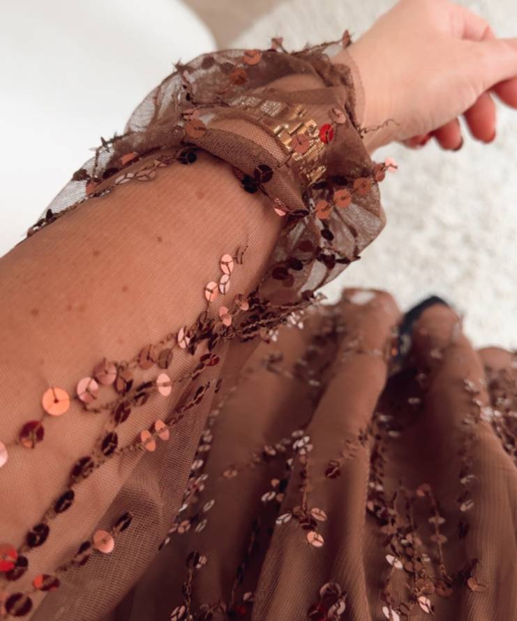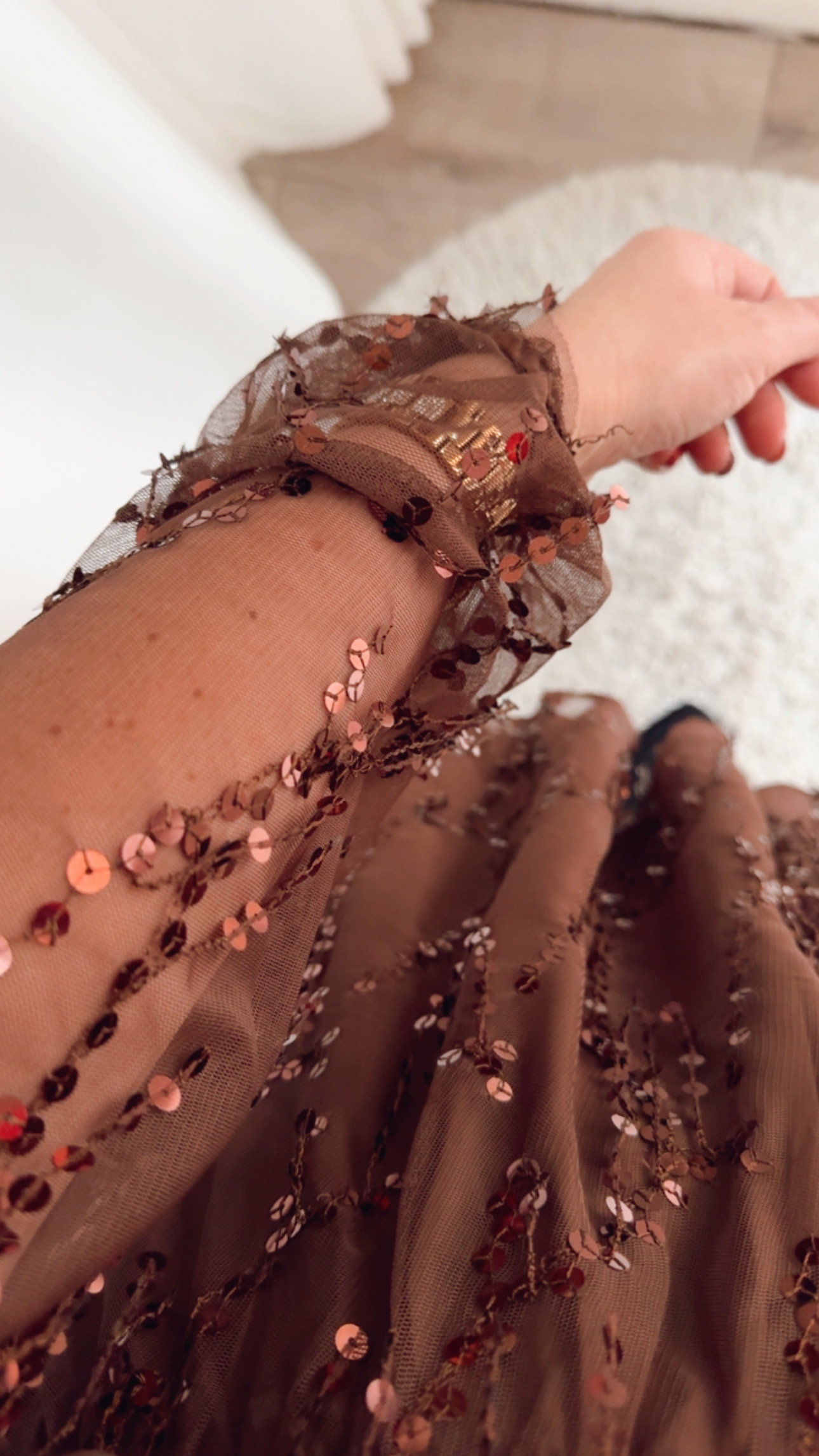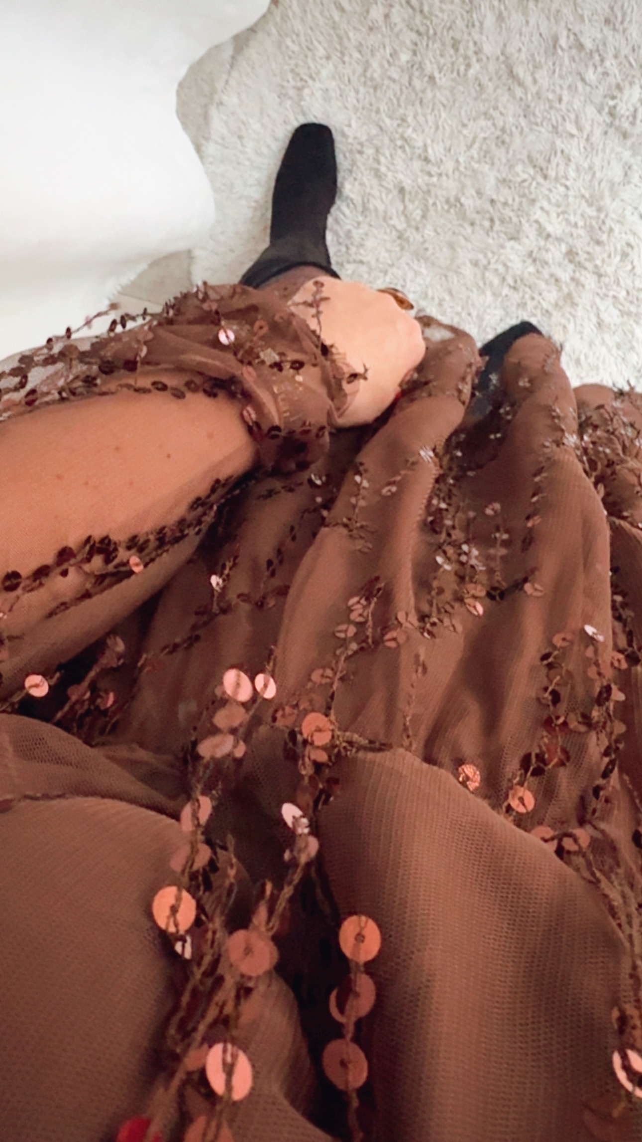 Dit jurkje is ideaal voor de feestdagen, maar ook perfect doordraagbaar voor andere gelegenheden. Het heeft een rekkerband in de taille voor een flatterende pasvorm en een subtiel drukknopje om het jurkje op zijn plaats te houden. Het materiaal bevat wat stretch en voelt comfortabel aan . Behoudt mooi zijn vorm. Het jurkje is afgewerkt met zachte, elegante details en de mooiste pailletten