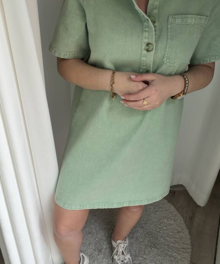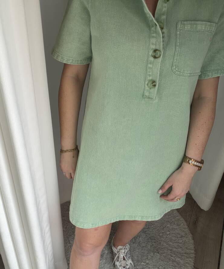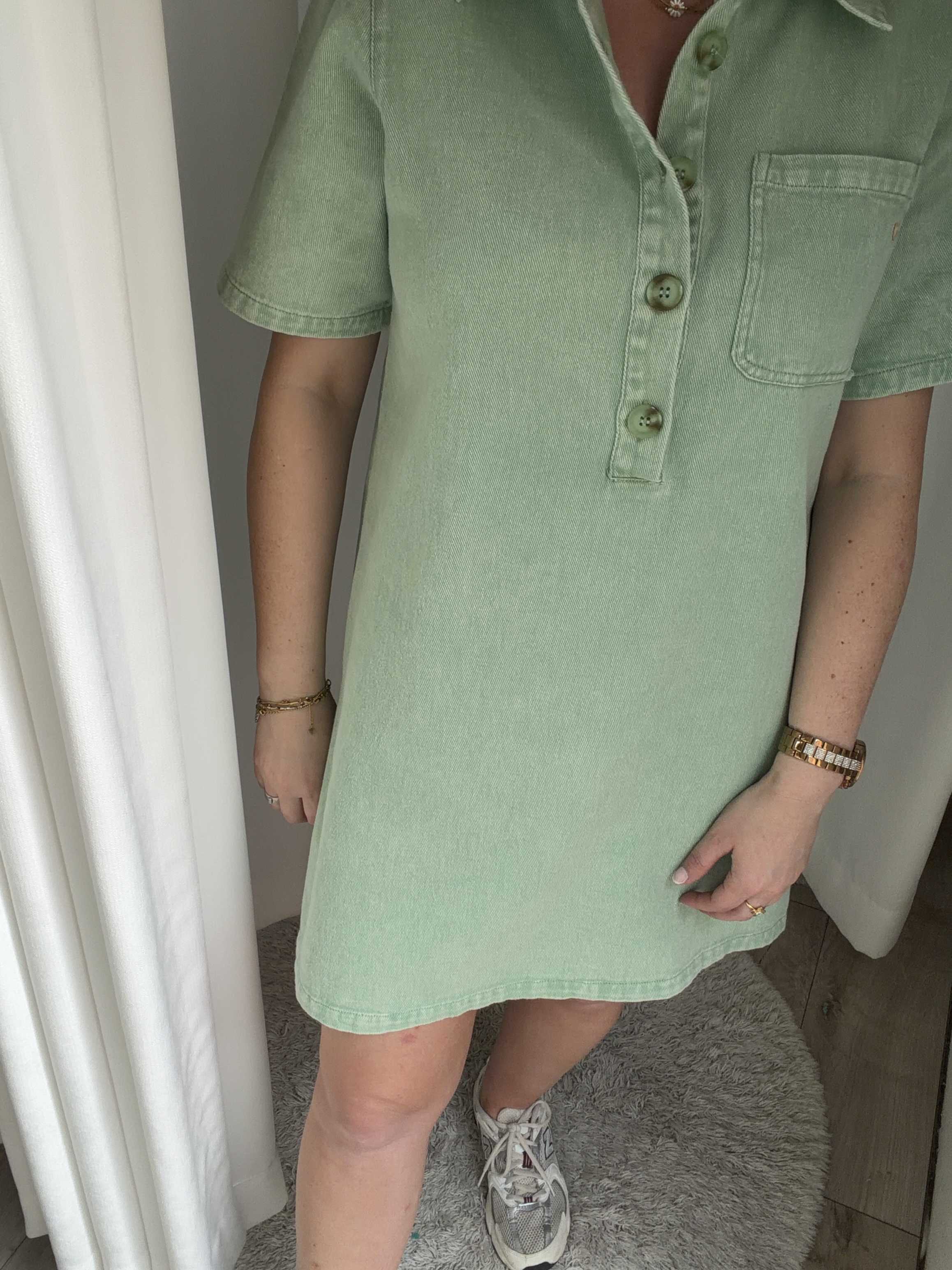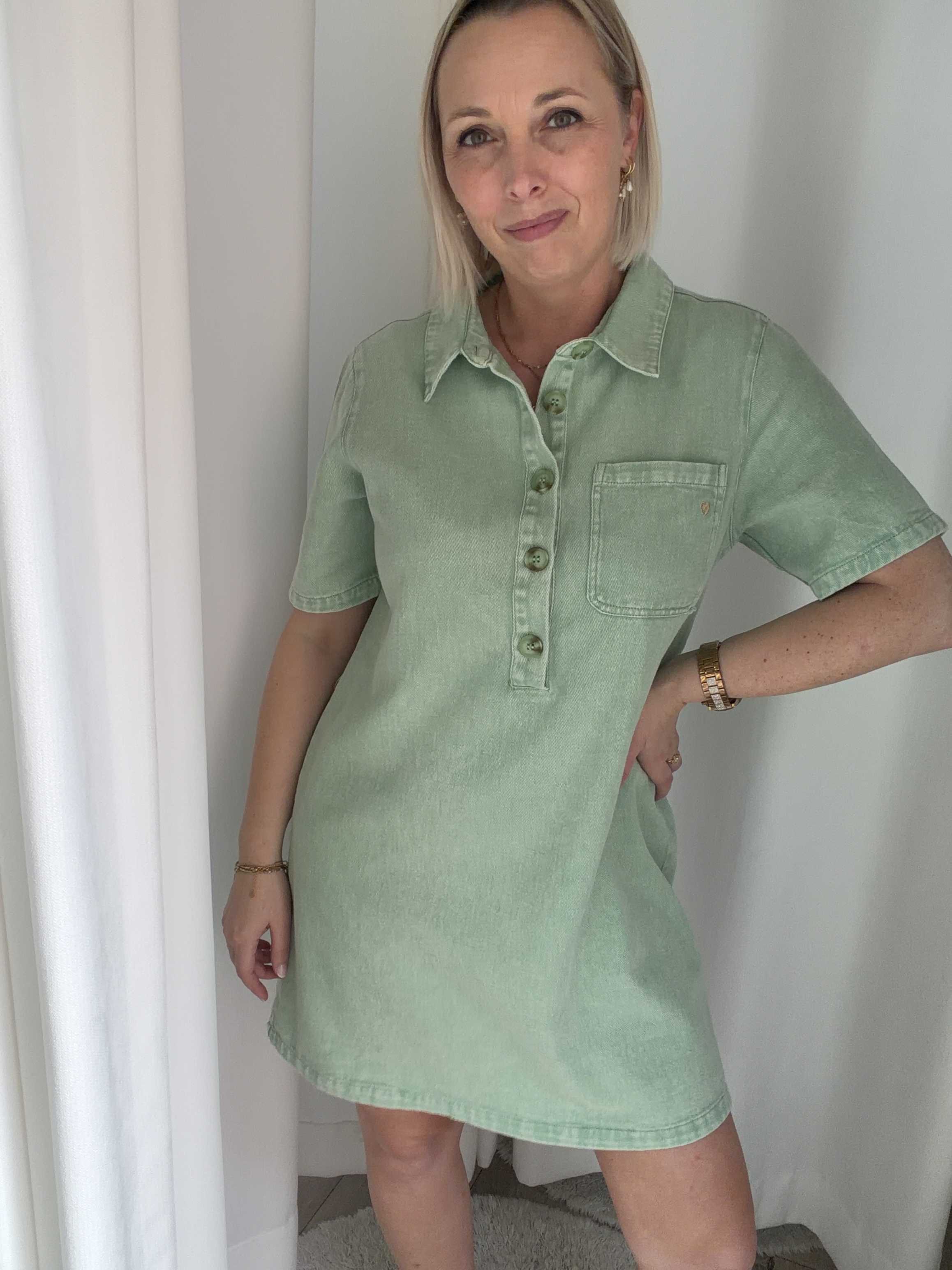 De Sage Denim Green Jurk is een stijlvolle en comfortabele denim jurk in een zachte groene tint. De jurk heeft een casual, maar vrouwelijke uitstraling en is perfect voor zowel een relaxte dag als een trendy outfit.