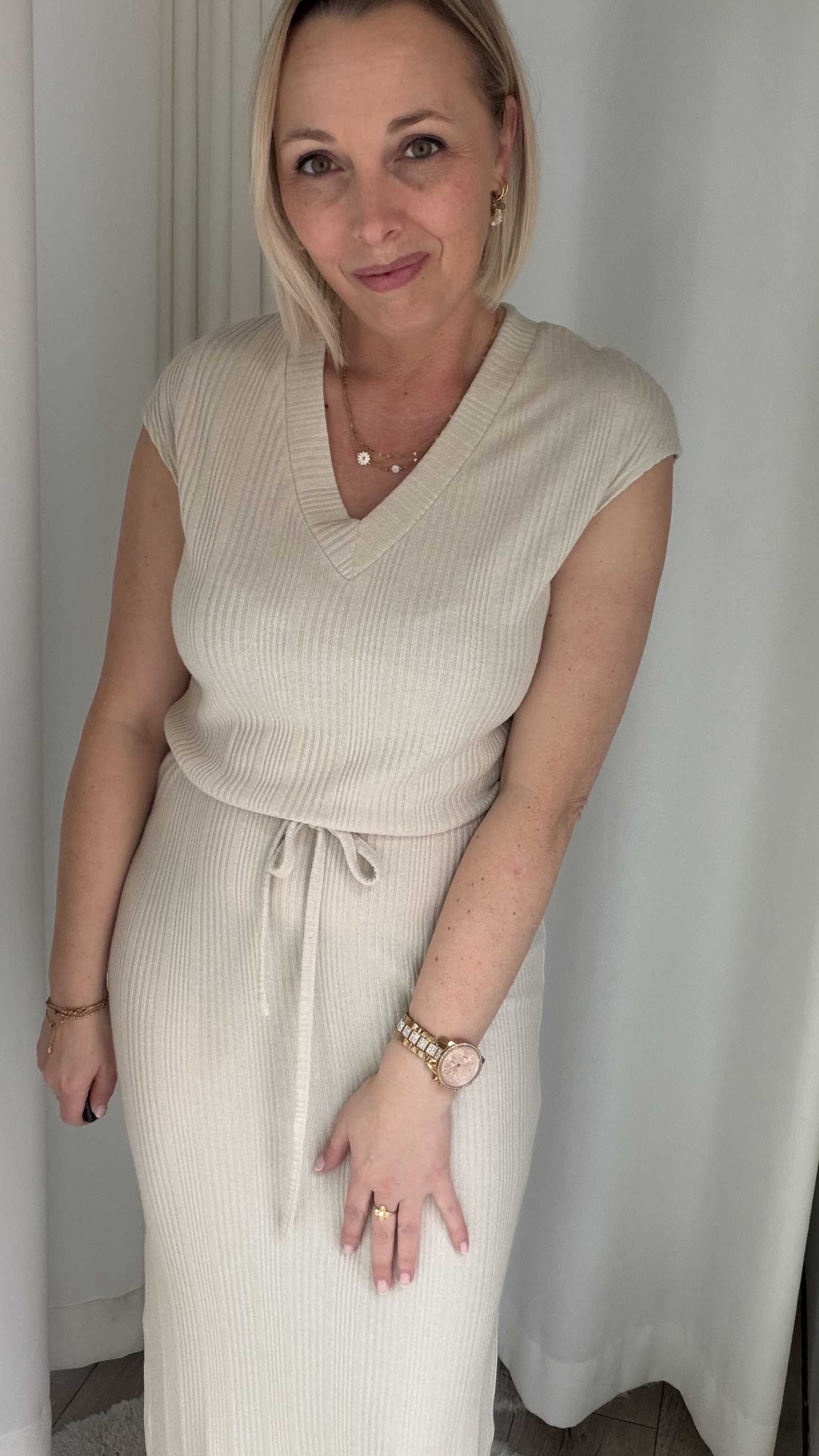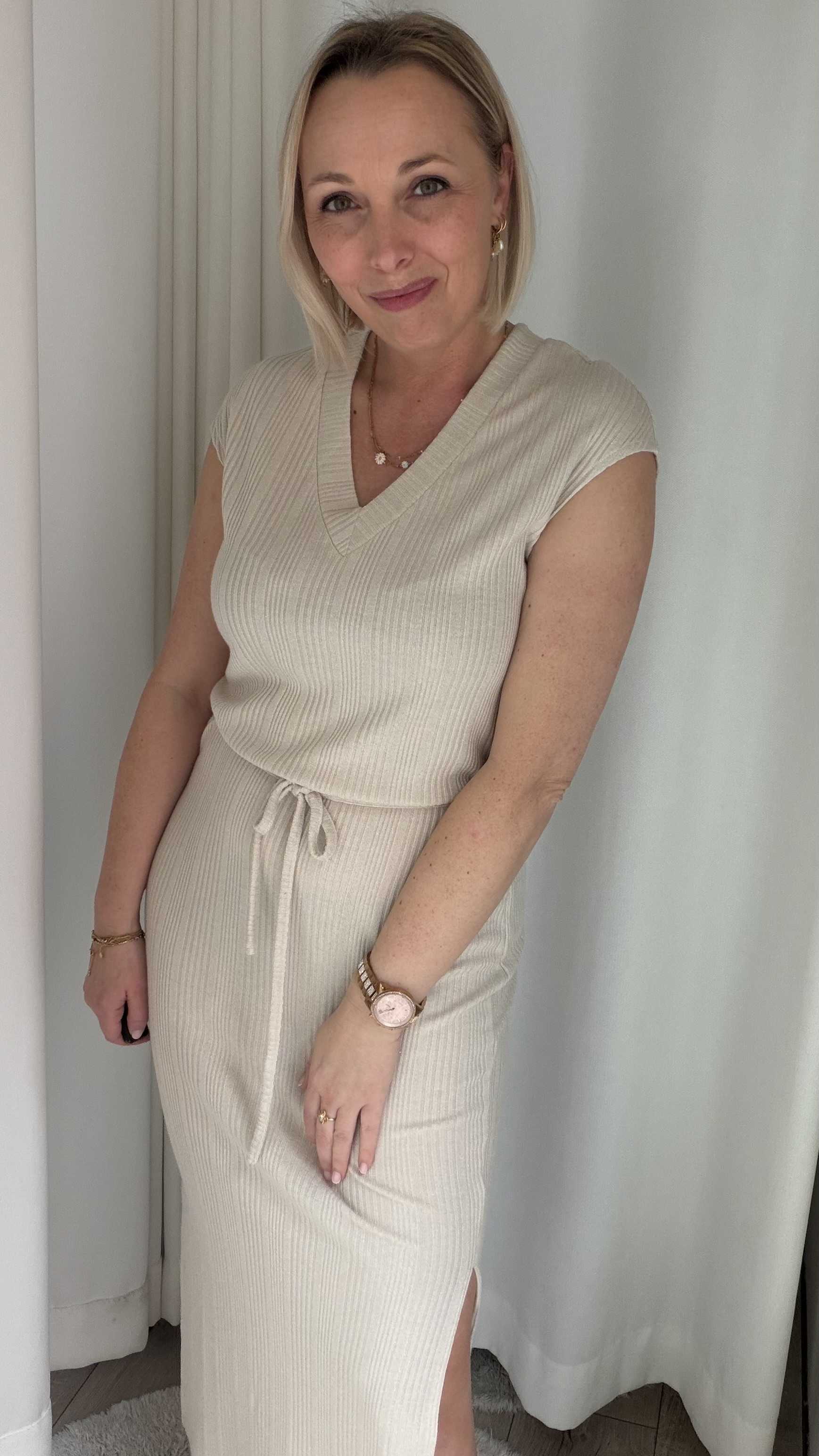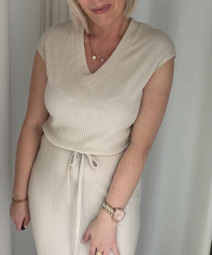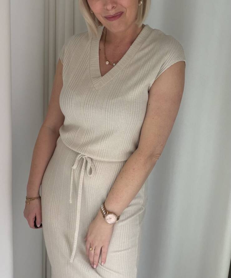 Deze tijdloze midi jurk is een perfecte combinatie van comfort en elegantie. Uitgevoerd in een zachte, neutrale beige tint straalt dit item rust en klasse uit. De subtiele ribstructuur zorgt voor een mooie, aansluitende pasvorm en geeft de jurk een verfijnde uitstraling.