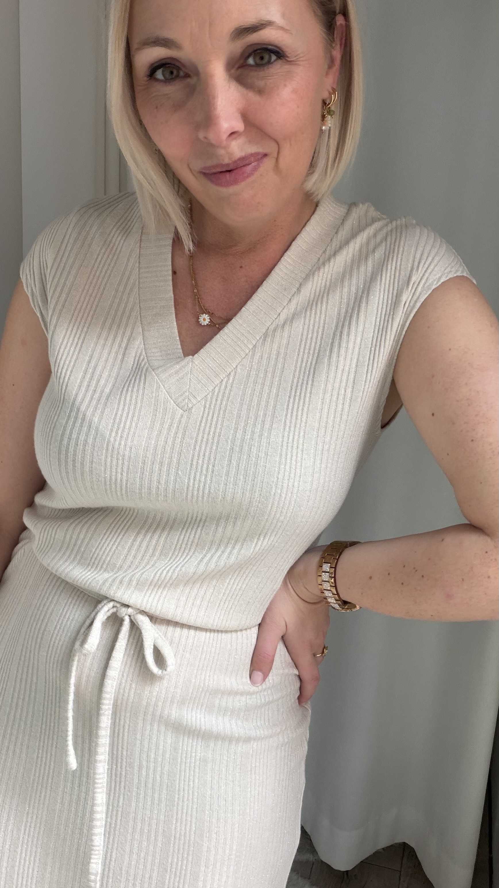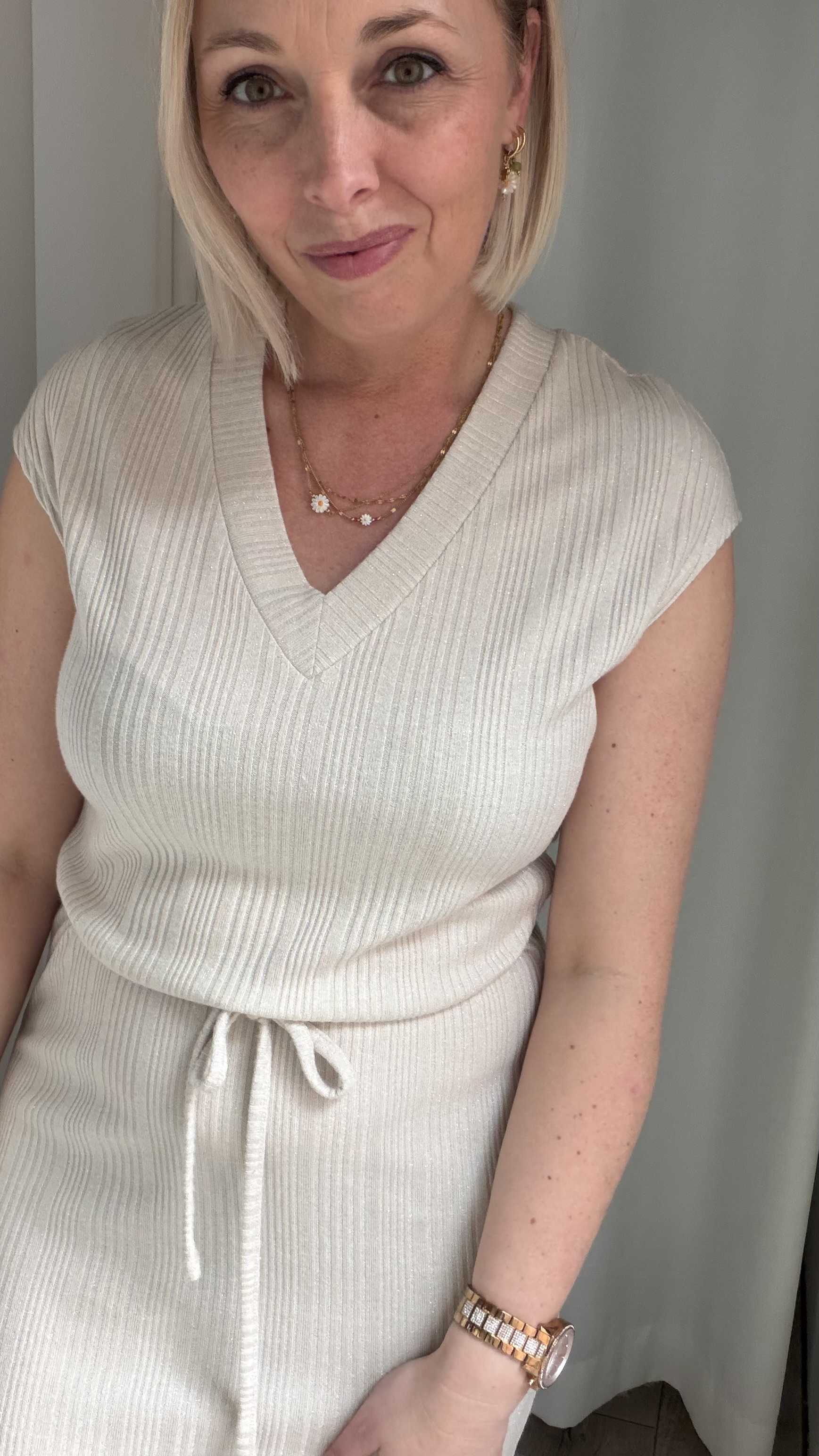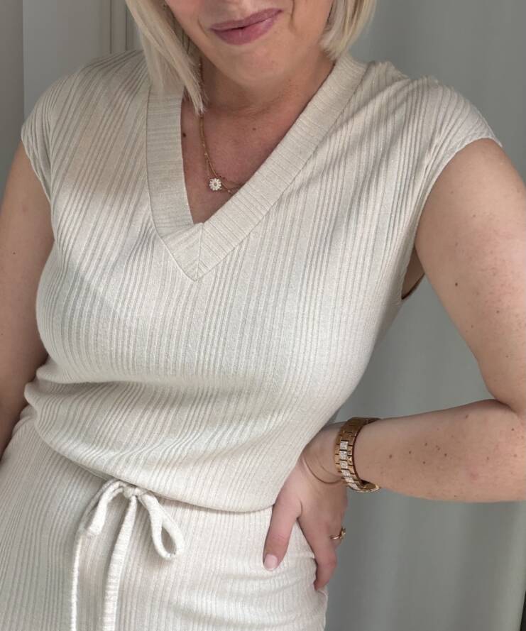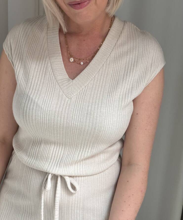 Deze tijdloze midi jurk is een perfecte combinatie van comfort en elegantie. Uitgevoerd in een zachte, neutrale beige tint straalt dit item rust en klasse uit. De subtiele ribstructuur zorgt voor een mooie, aansluitende pasvorm en geeft de jurk een verfijnde uitstraling.