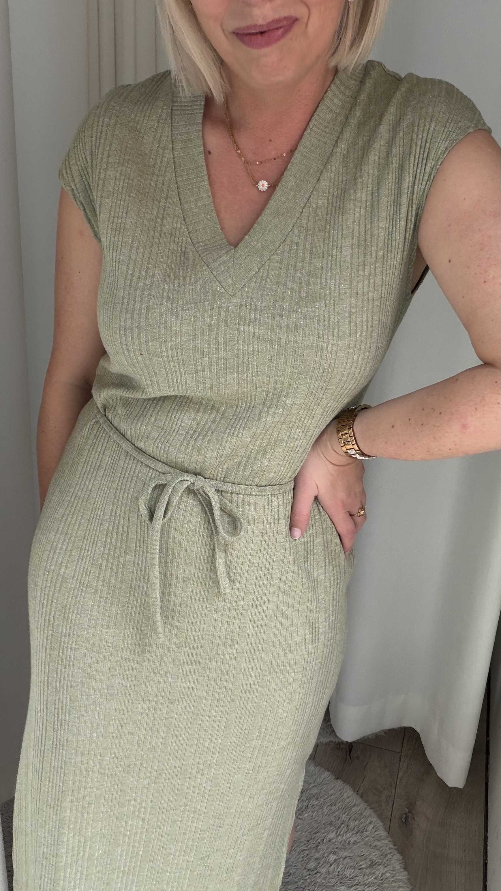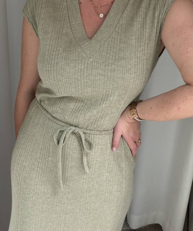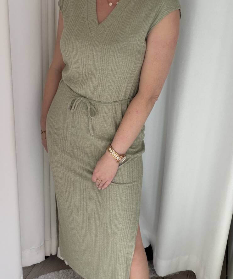 Deze elegante midi jurk combineert comfort met een verfijnde uitstraling. De jurk is uitgevoerd in een zachte groentint en heeft een subtiele ribstructuur die zorgt voor een flatterend silhouet. Dankzij de V-hals en kapmouwtjes krijgt het ontwerp een vrouwelijke en moderne look.