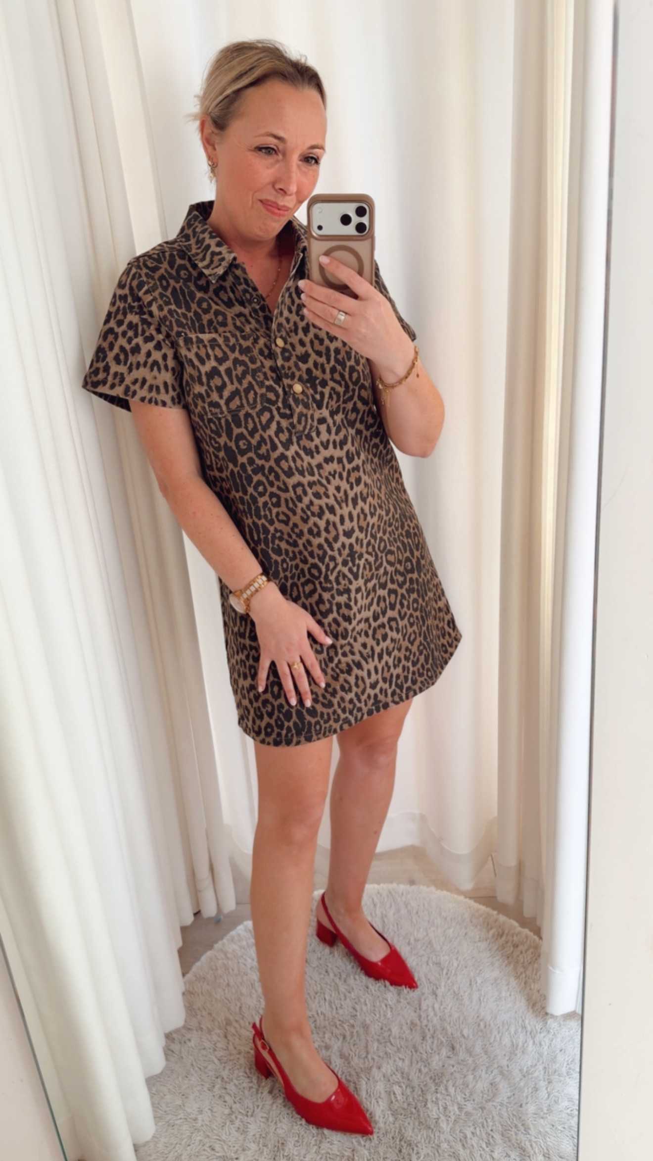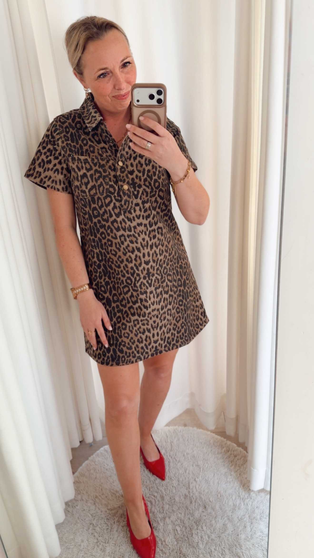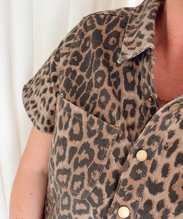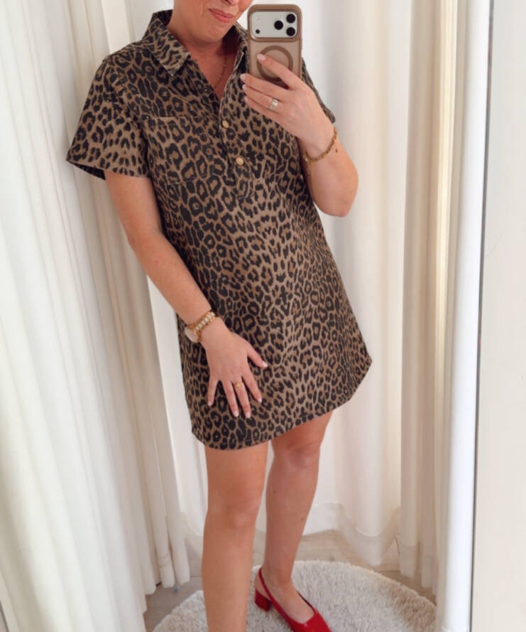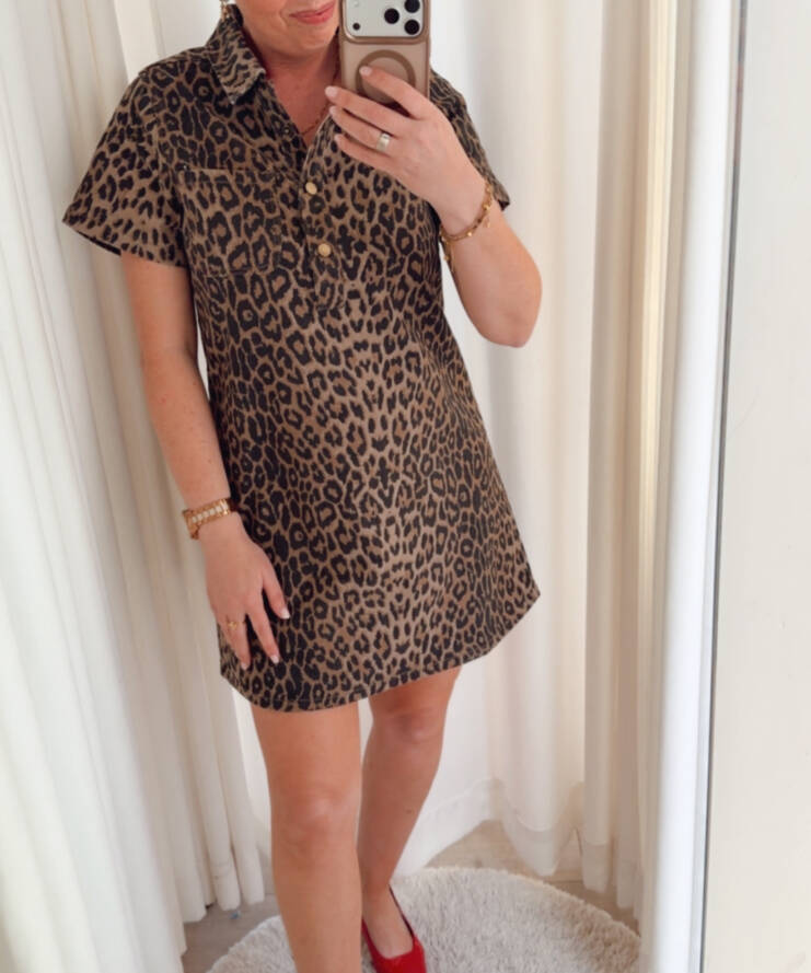 Ga voor een krachtige en stijlvolle look met de Wild Chic Leopard Shirt Dress. Deze trendy jurk met panterprint combineert moeiteloos comfort met een edgy uitstraling.