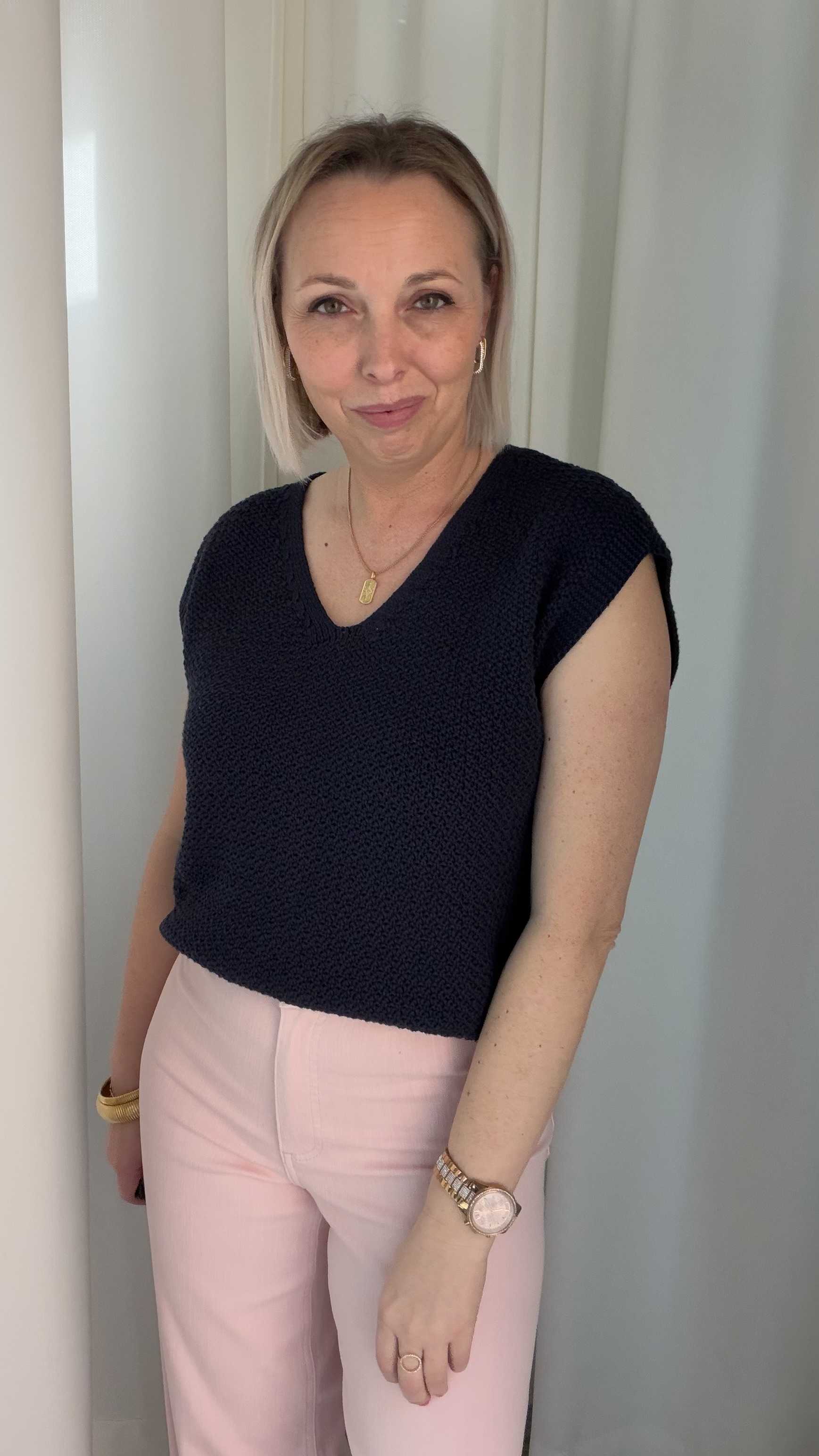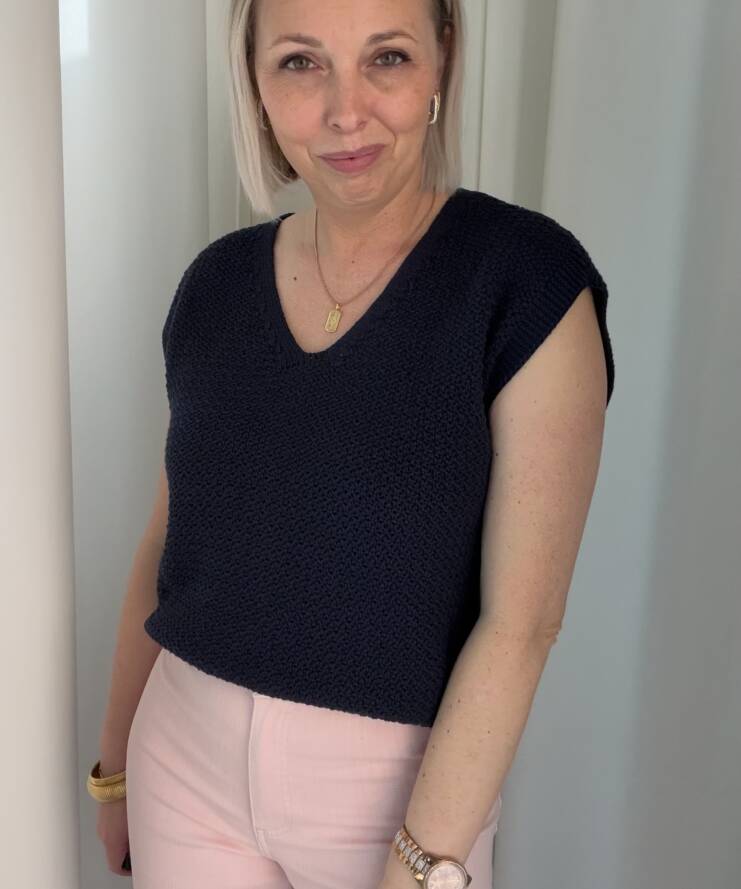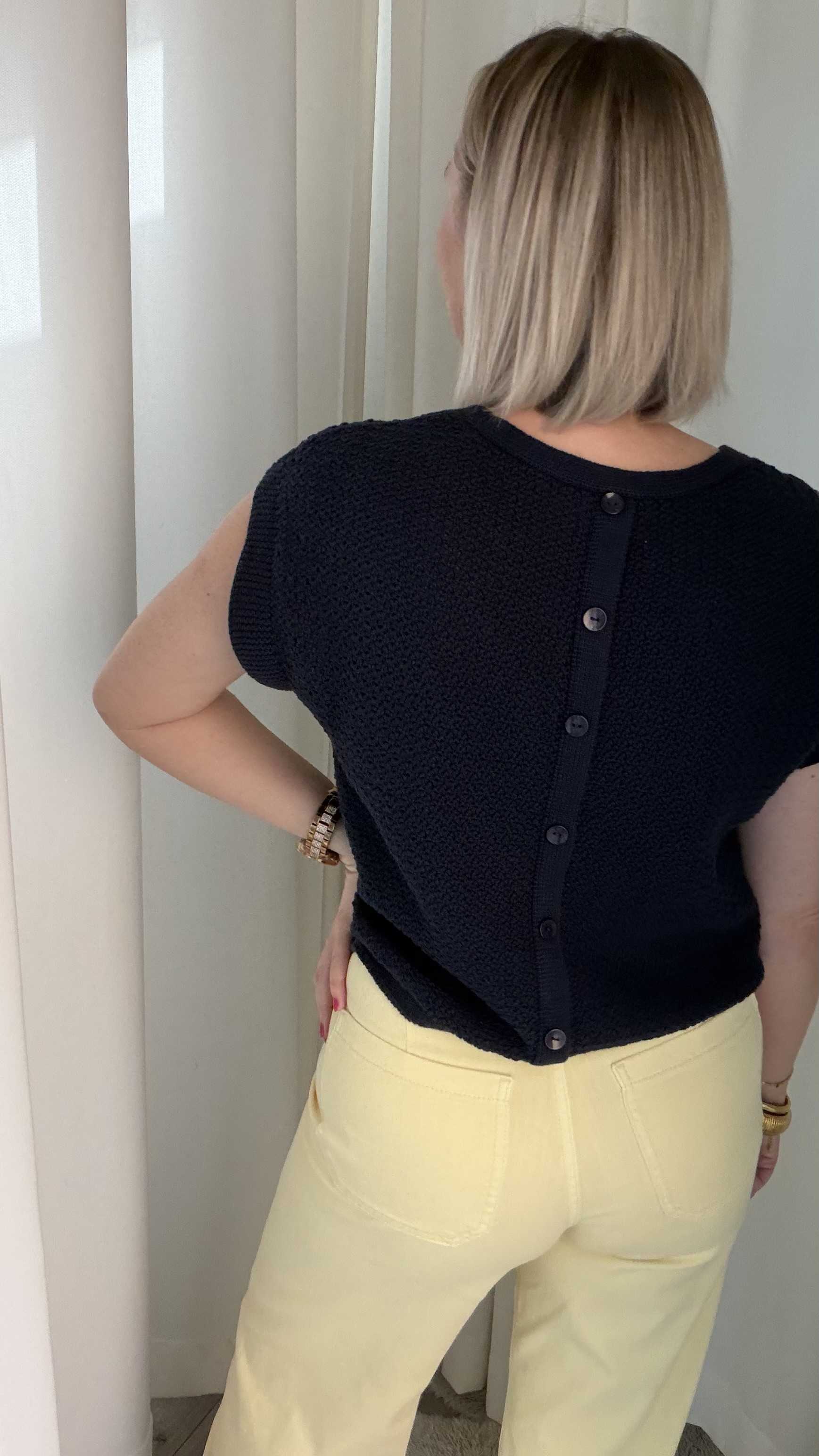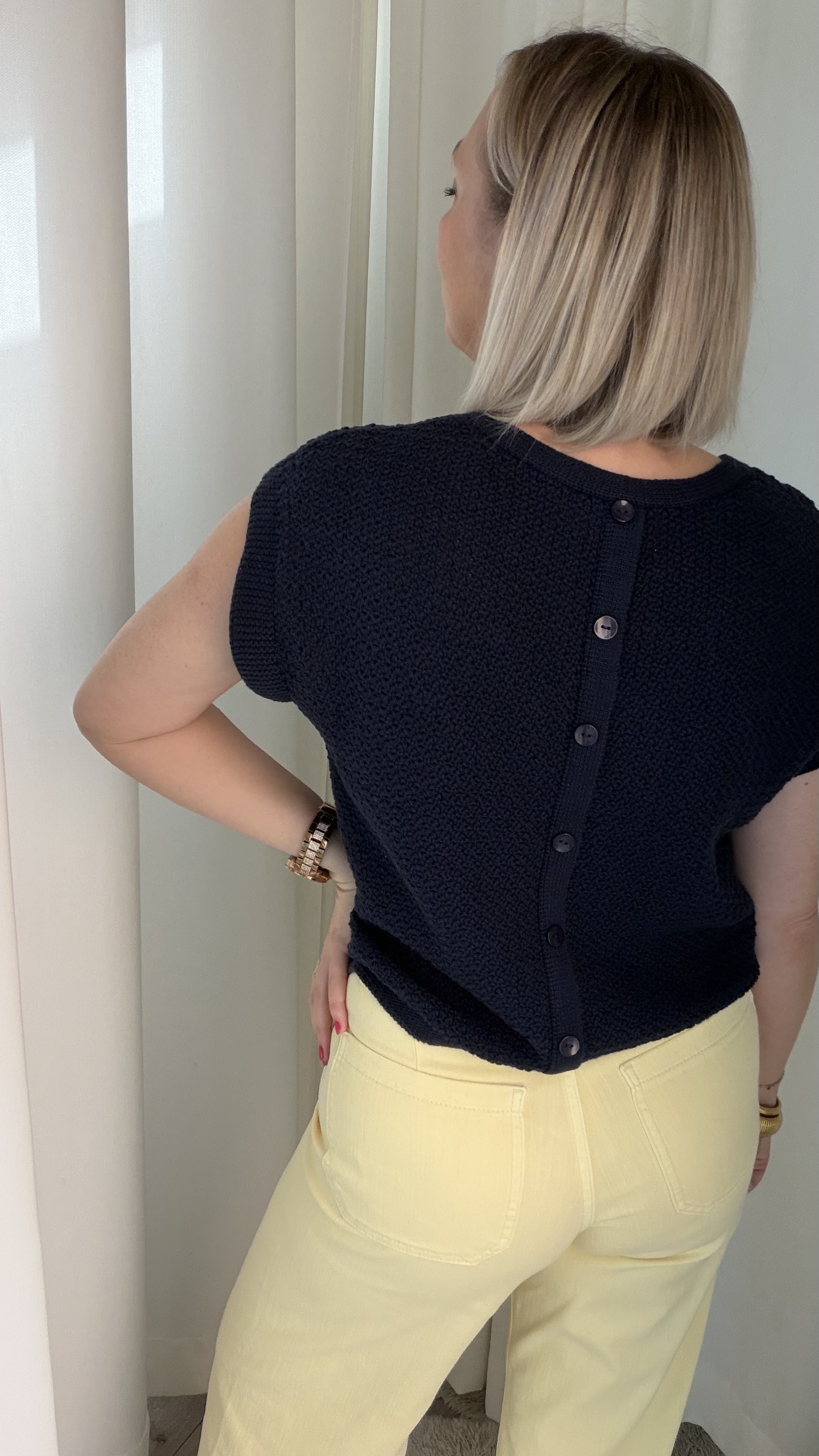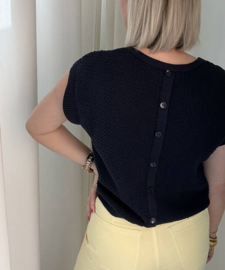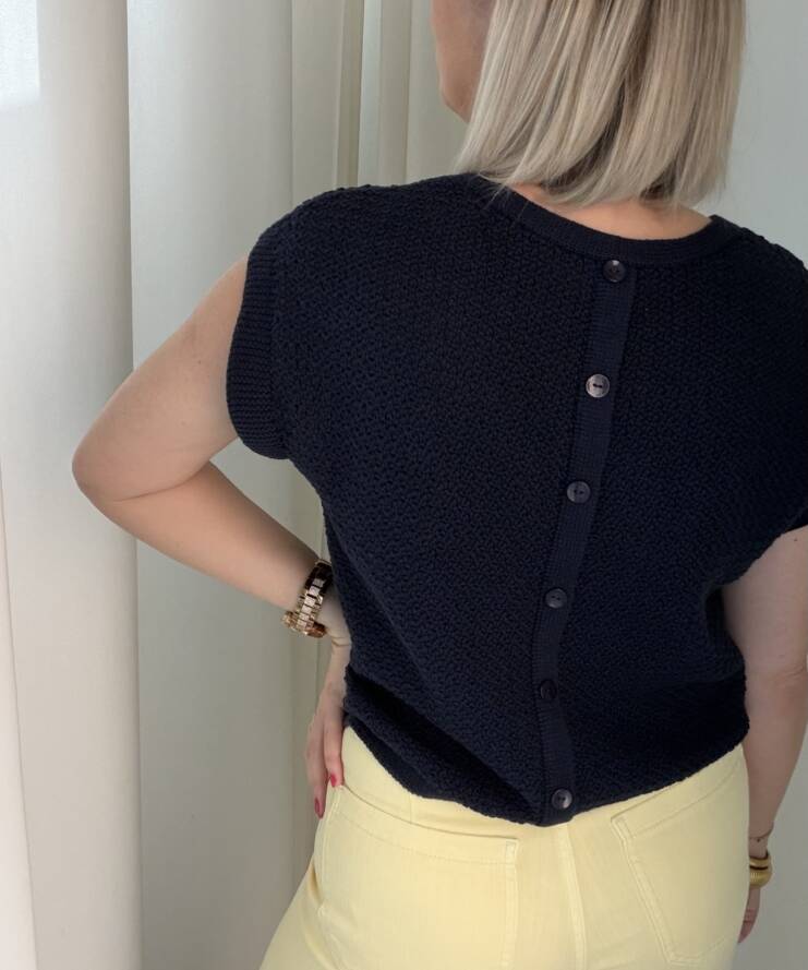 Terug naar de winkelDe Nora Knit Button Top is een stijlvolle en comfortabele knit top met een moderne twist. De diepe navy kleur geeft de top een tijdloze uitstraling, terwijl de luchtige gebreide structuur zorgt voor een speels en elegant effect.