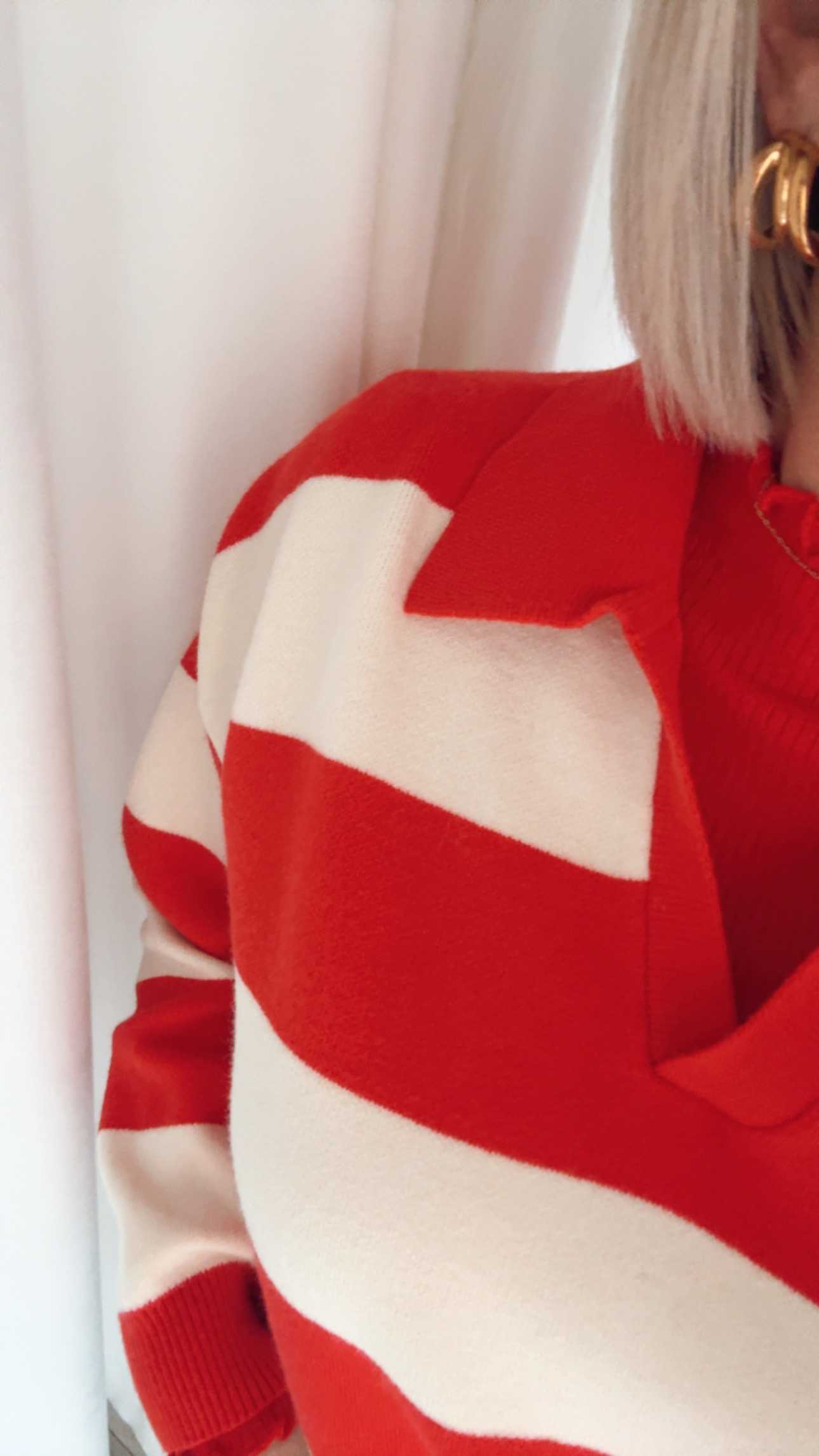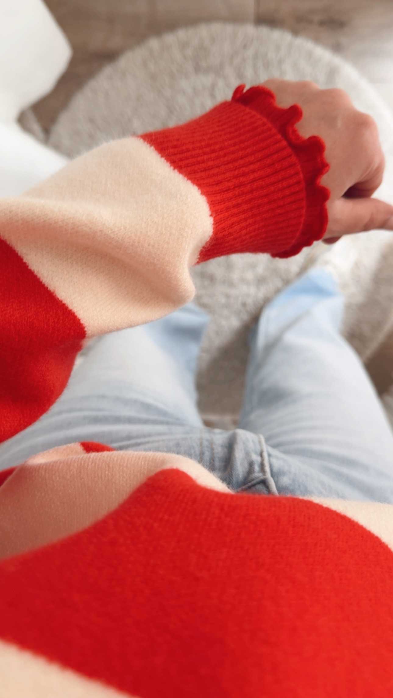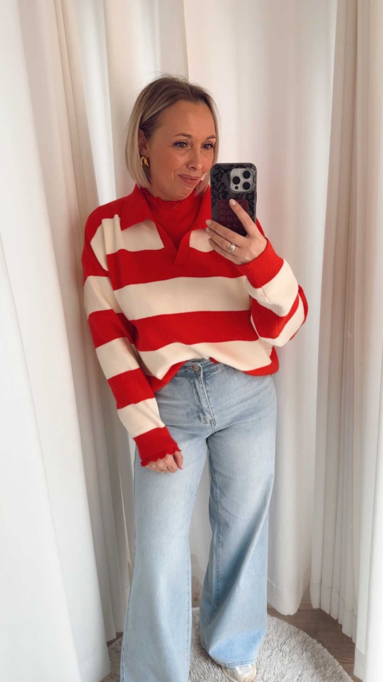 De brede strepen in rode en witte tinten geven de trui een speelse, retro uitstraling met een moderne twist. Het is een opvallend stuk dat toch makkelijk te combineren is en perfect past bij elke dag. Het heeft me een soort van Waar is Wally -gevoel 🙂