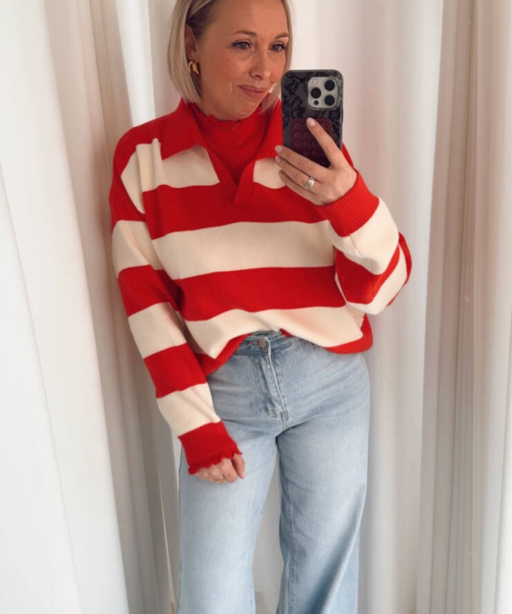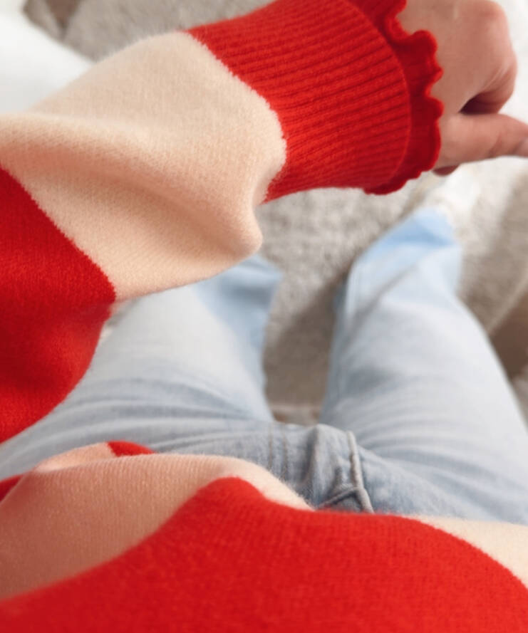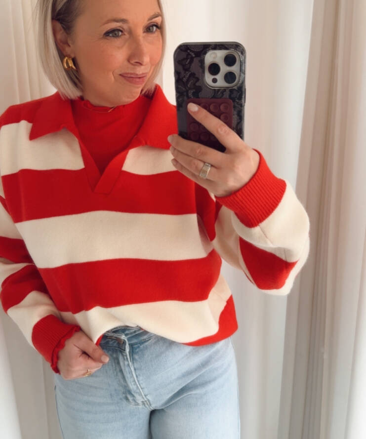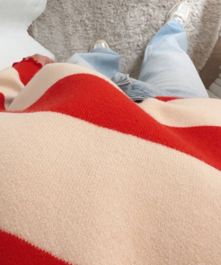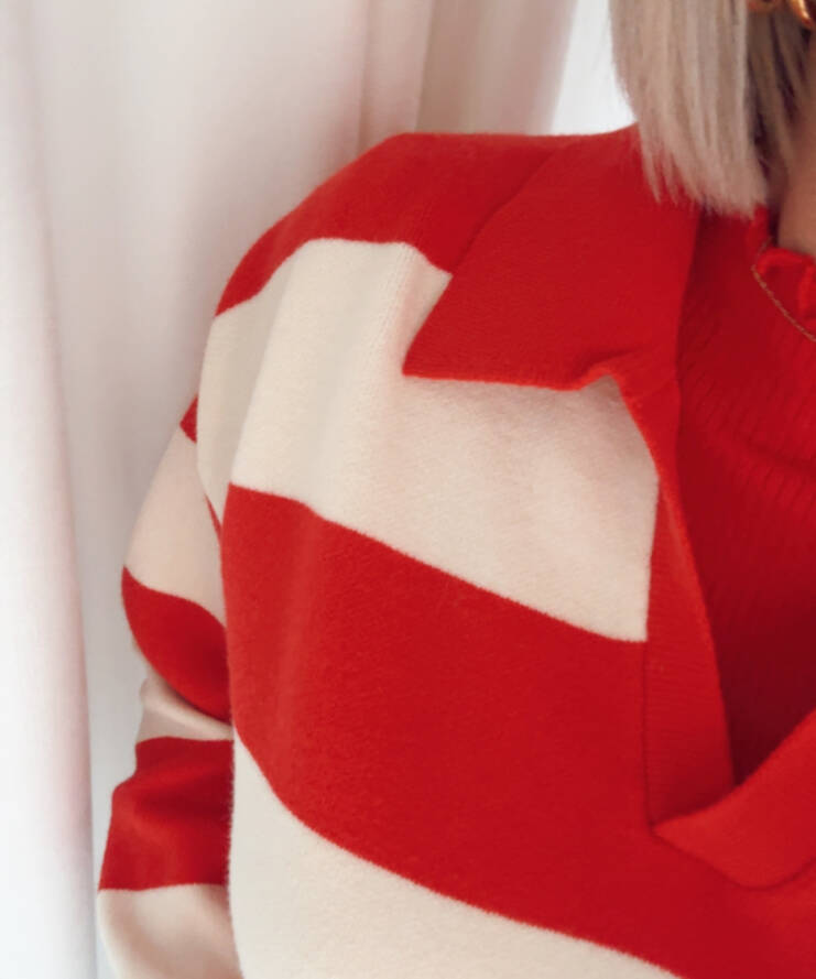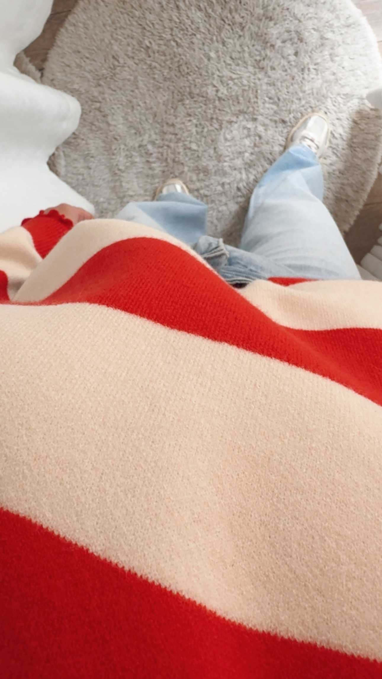 De brede strepen in rode en witte tinten geven de trui een speelse, retro uitstraling met een moderne twist. Het is een opvallend stuk dat toch makkelijk te combineren is en perfect past bij elke dag. Het heeft me een soort van Waar is Wally -gevoel 🙂