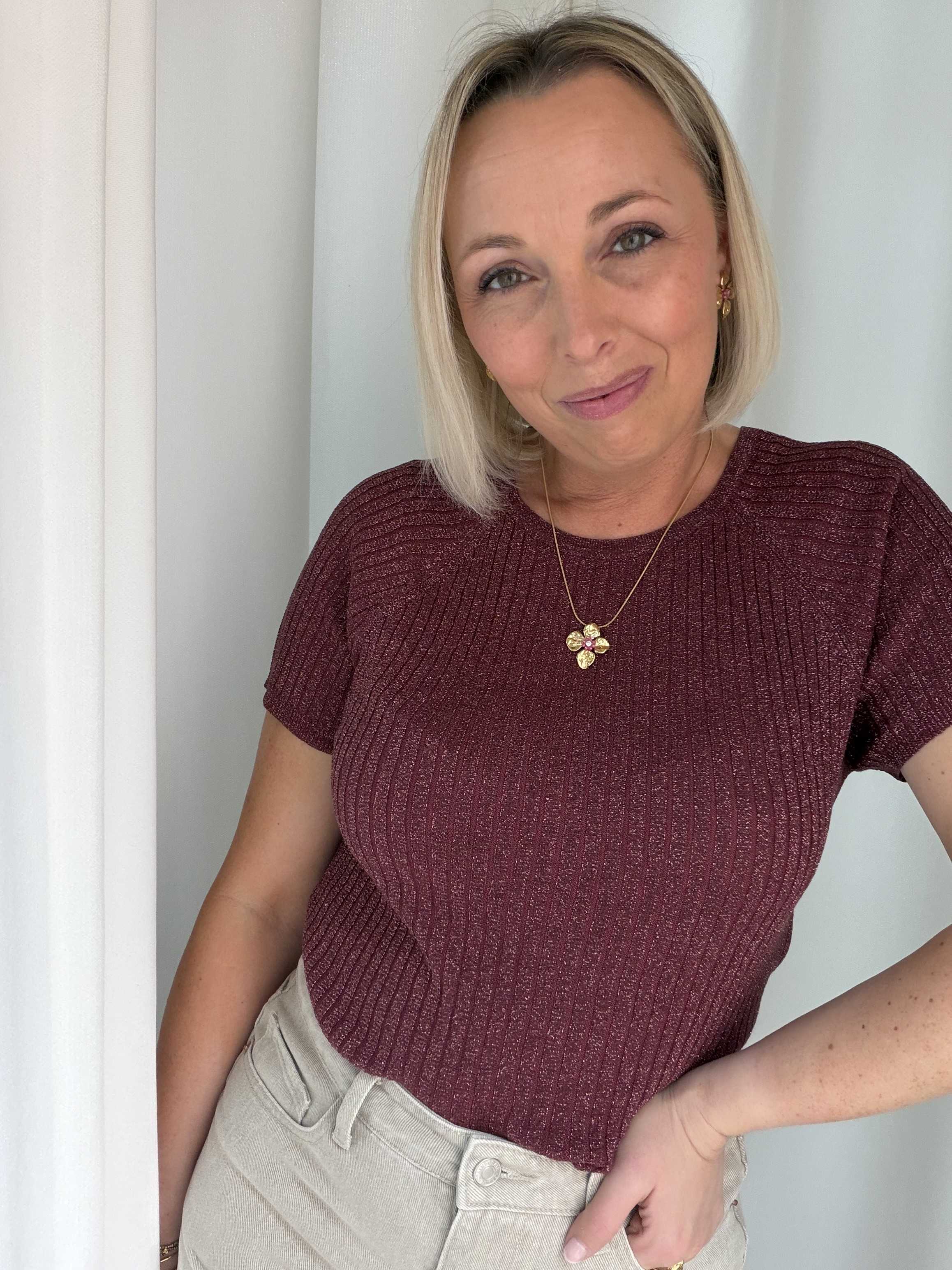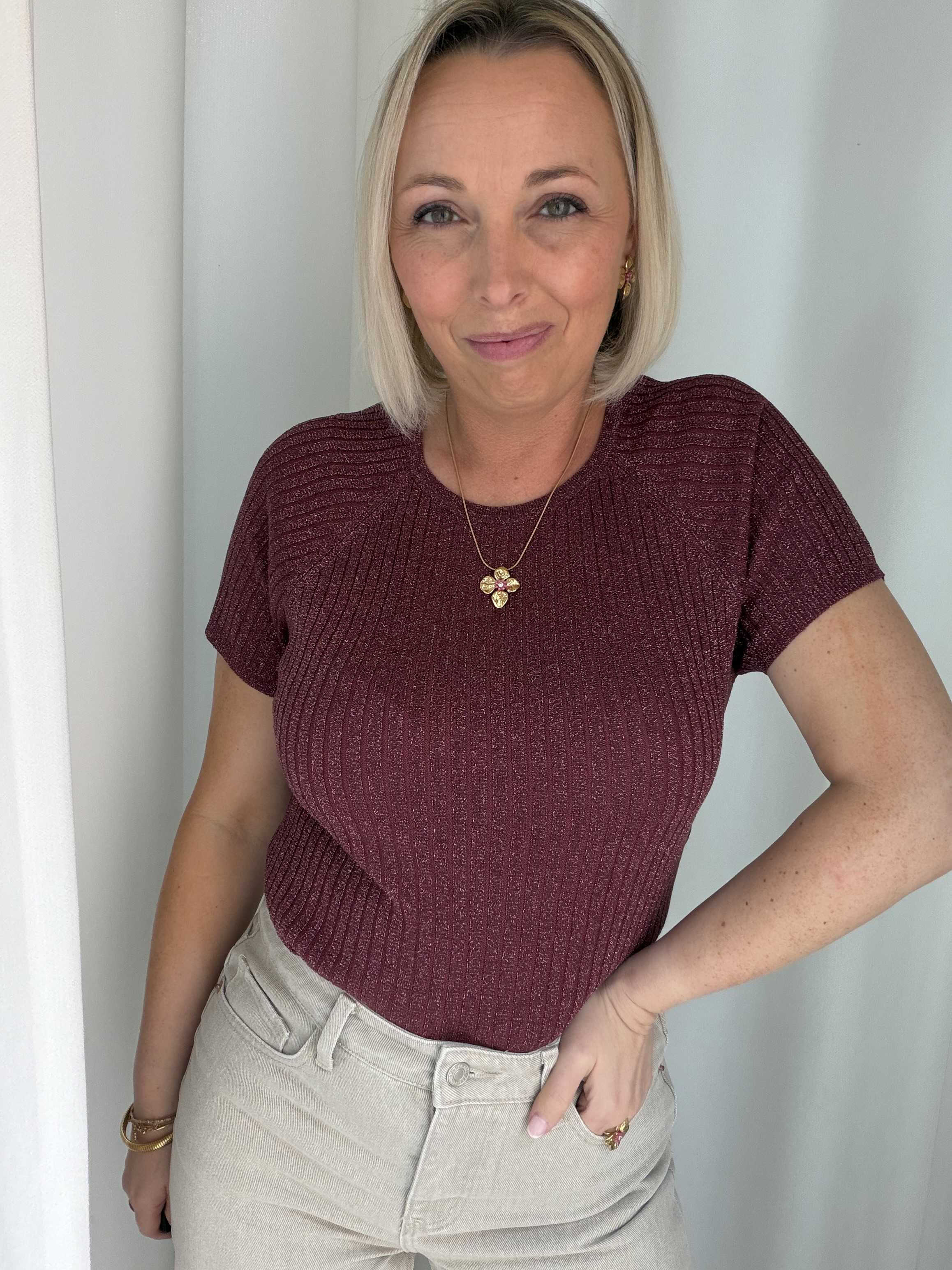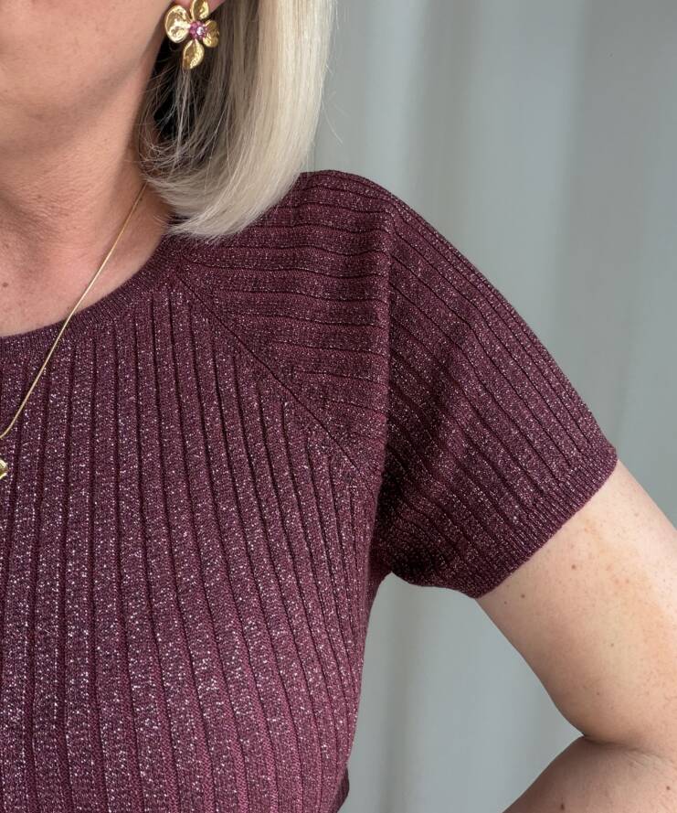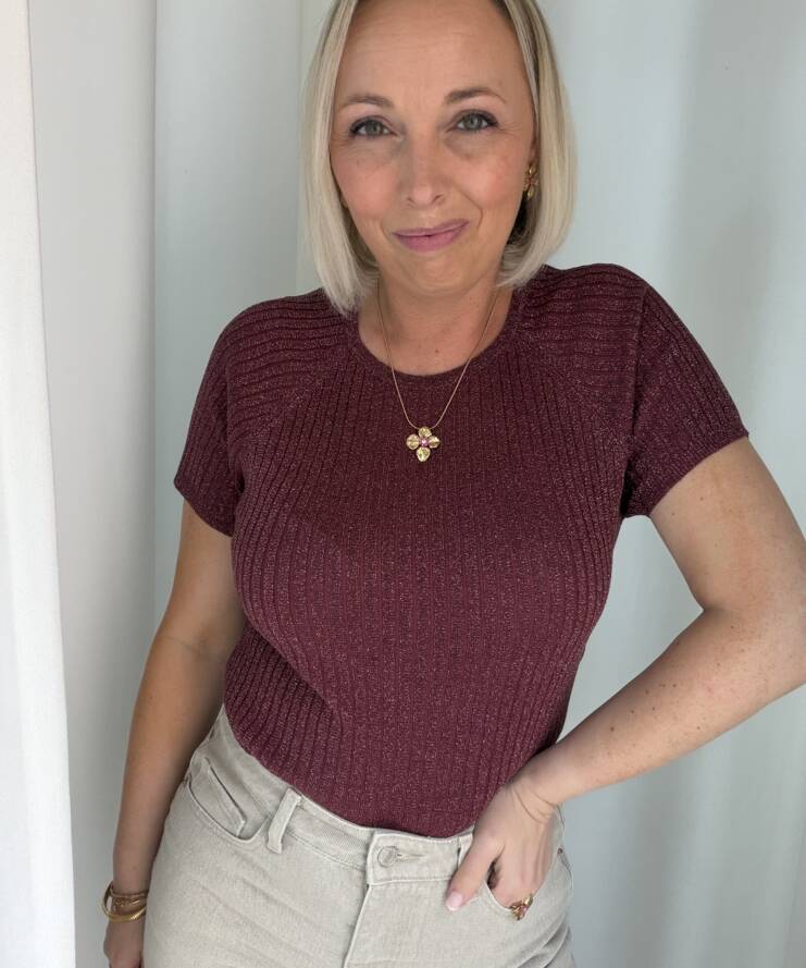 Voeg een vleugje glamour toe aan je outfit met deze stijlvolle glitter top. De top is uitgevoerd in een warme bordeauxkleur met subtiele glans, waardoor je moeiteloos een feestelijke look creëert. De fijne ribstructuur zorgt voor een flatterende pasvorm en geeft het geheel een moderne uitstraling.