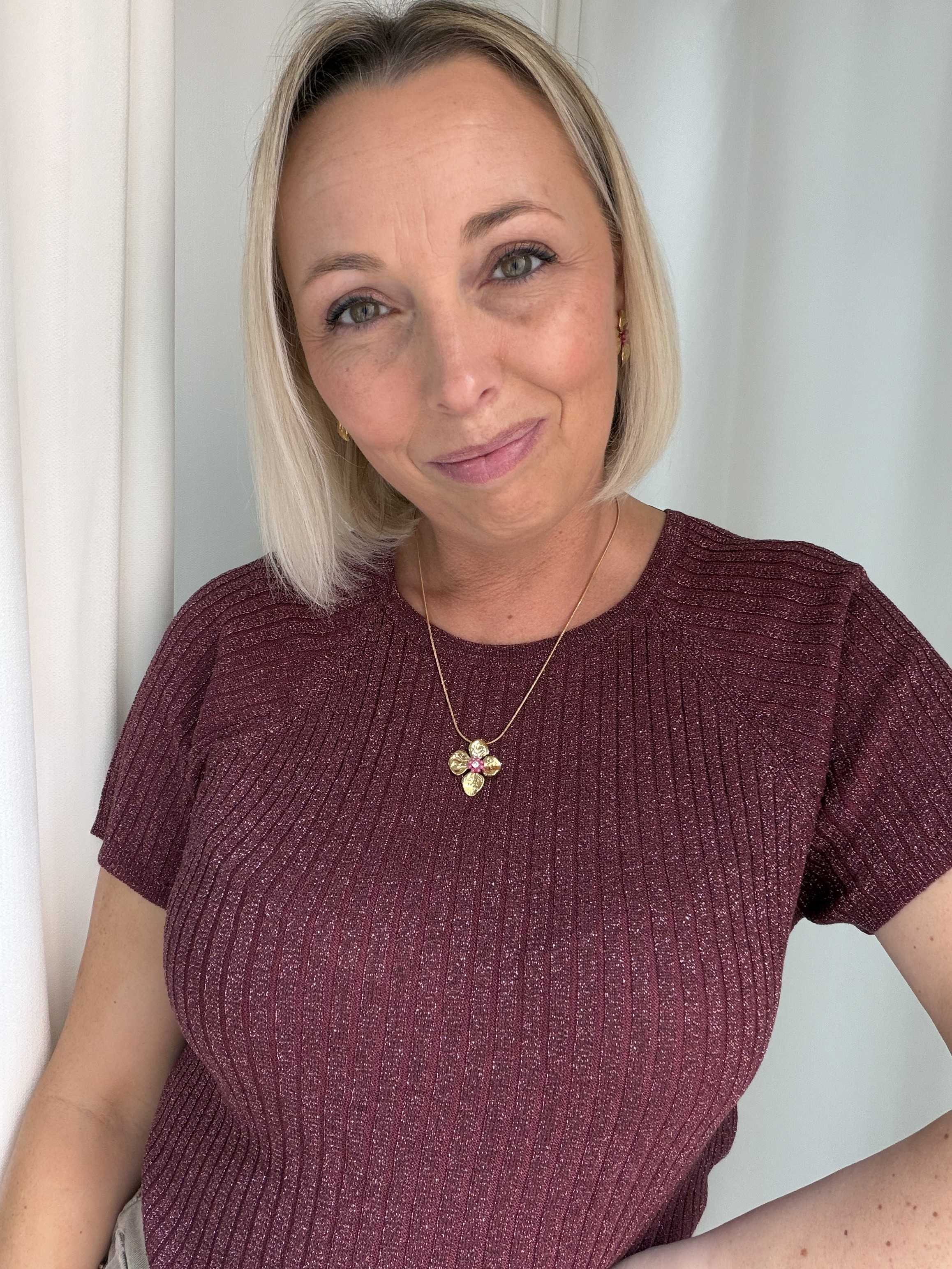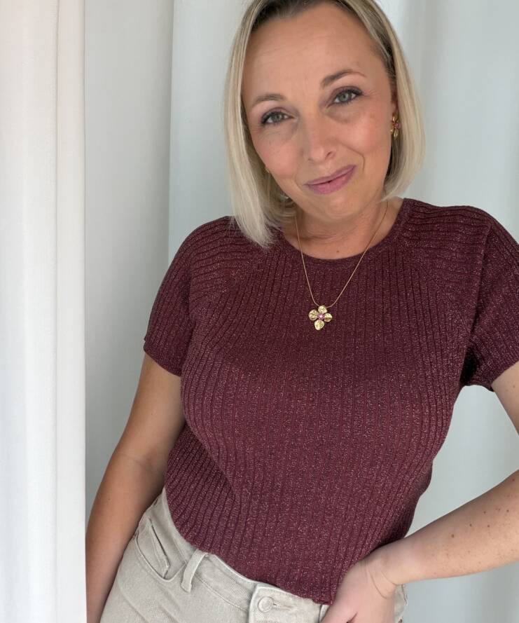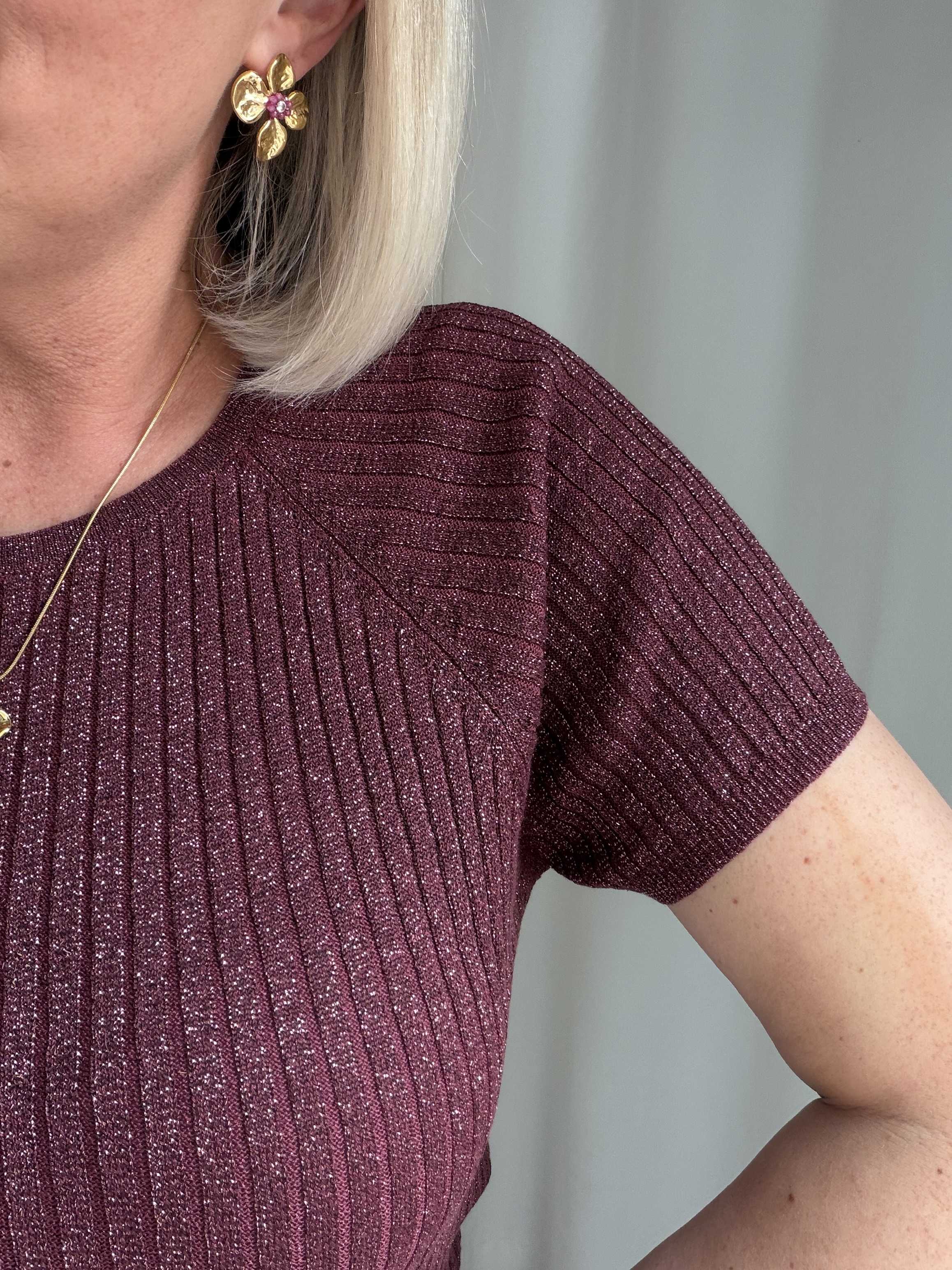 Voeg een vleugje glamour toe aan je outfit met deze stijlvolle glitter top. De top is uitgevoerd in een warme bordeauxkleur met subtiele glans, waardoor je moeiteloos een feestelijke look creëert. De fijne ribstructuur zorgt voor een flatterende pasvorm en geeft het geheel een moderne uitstraling.