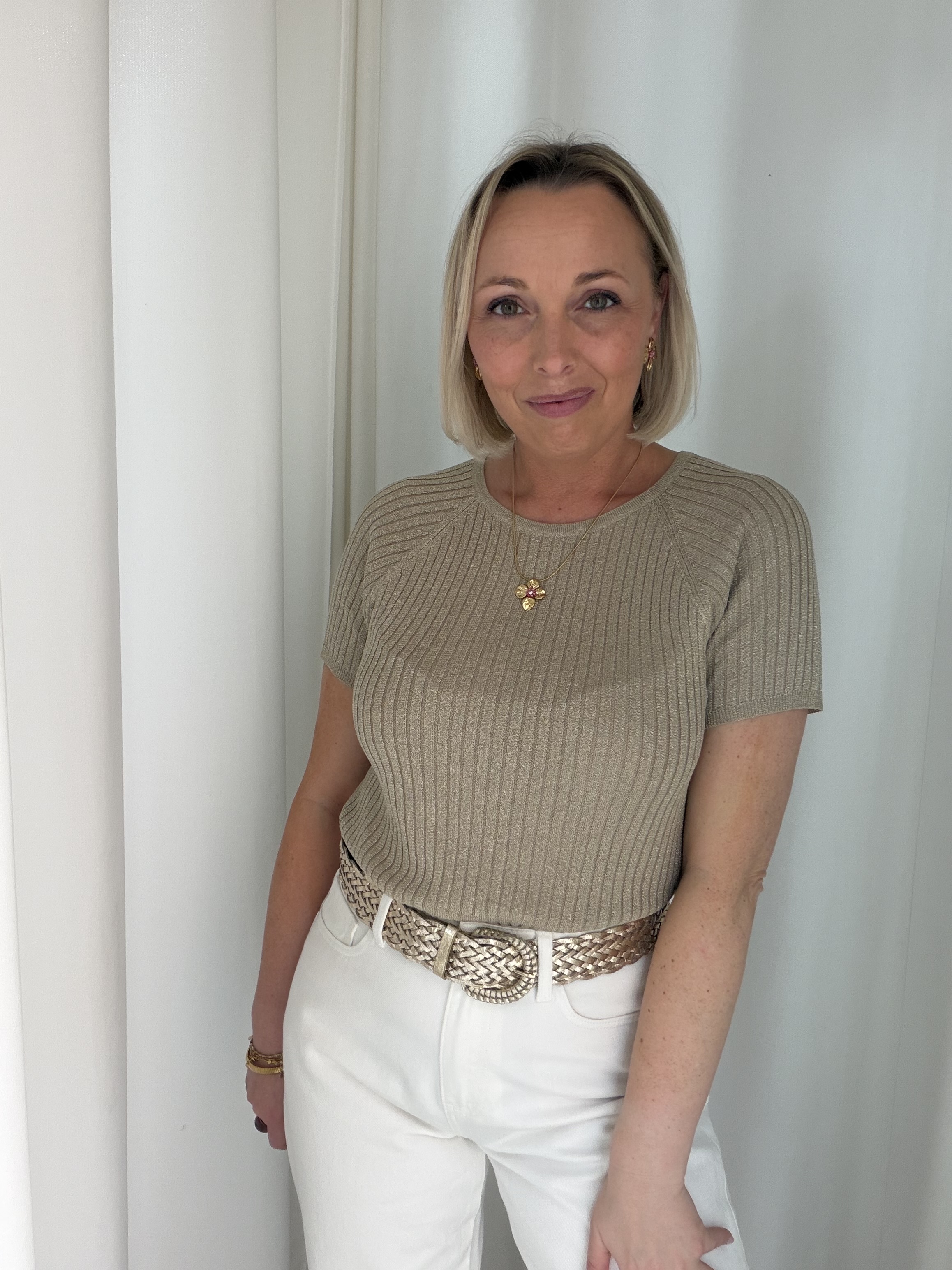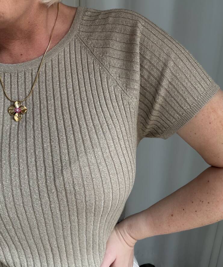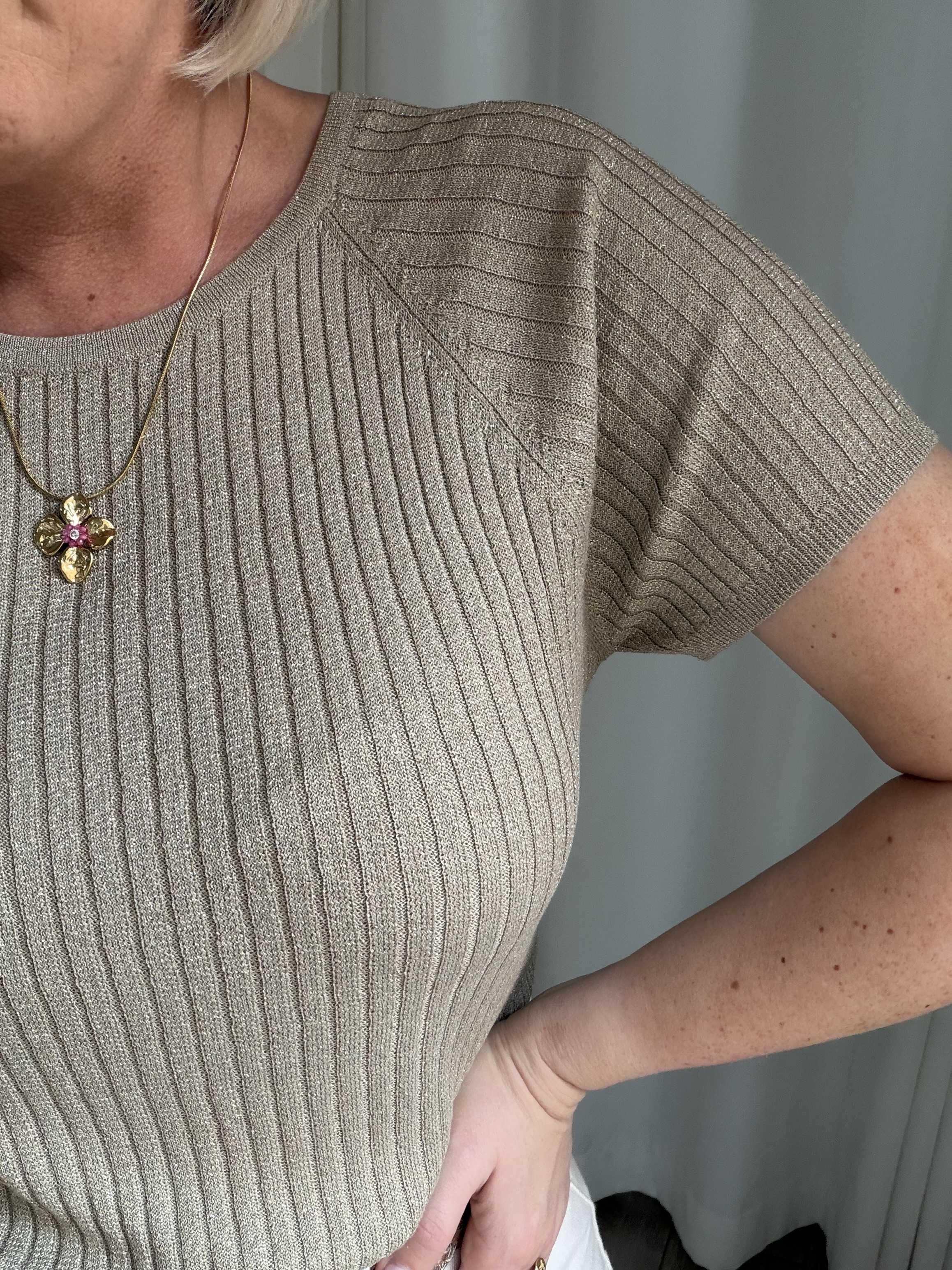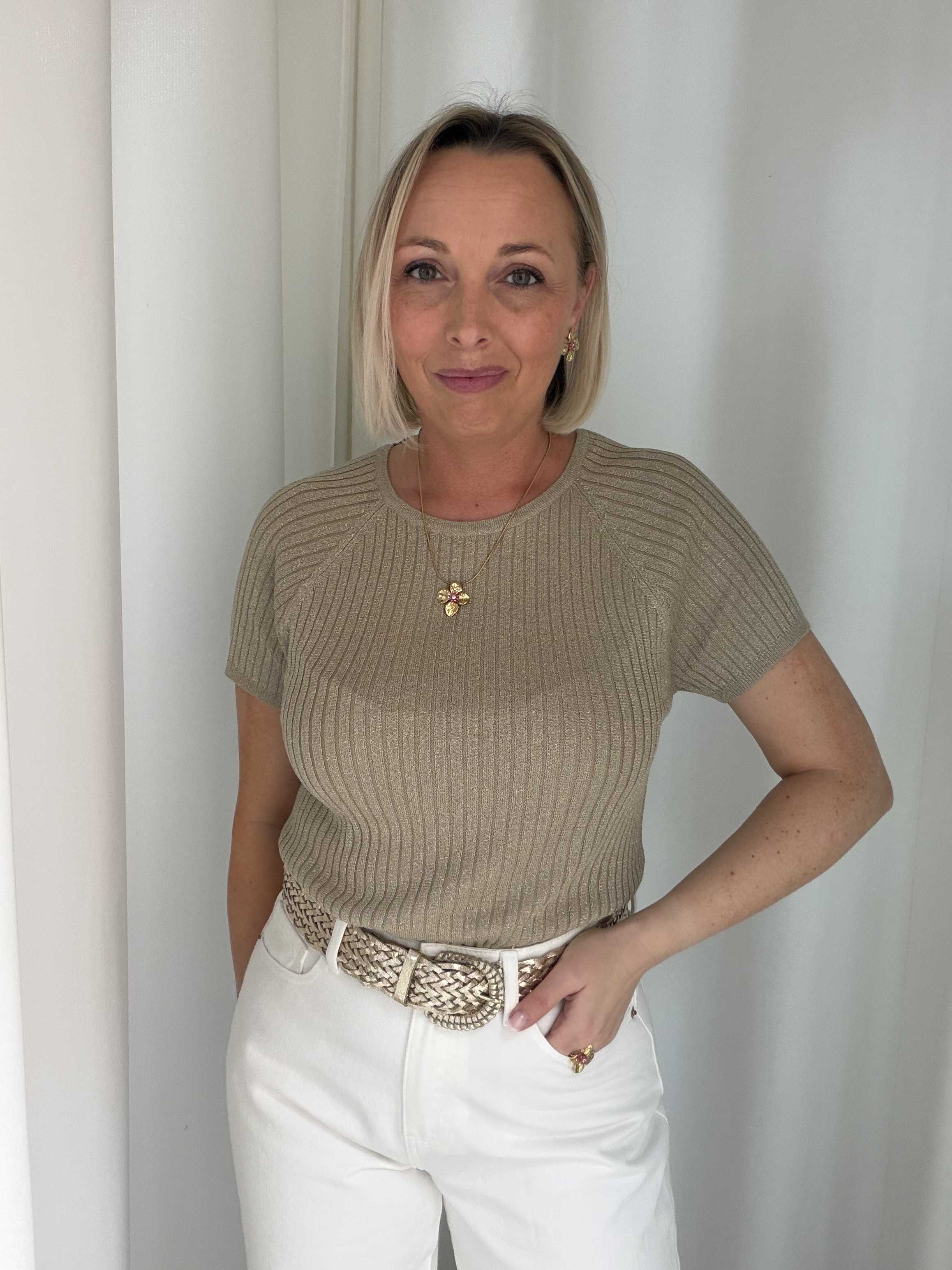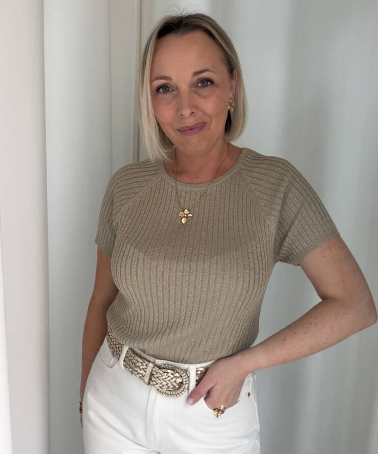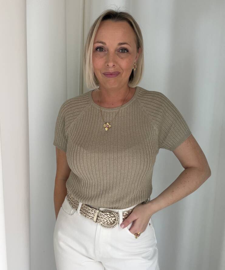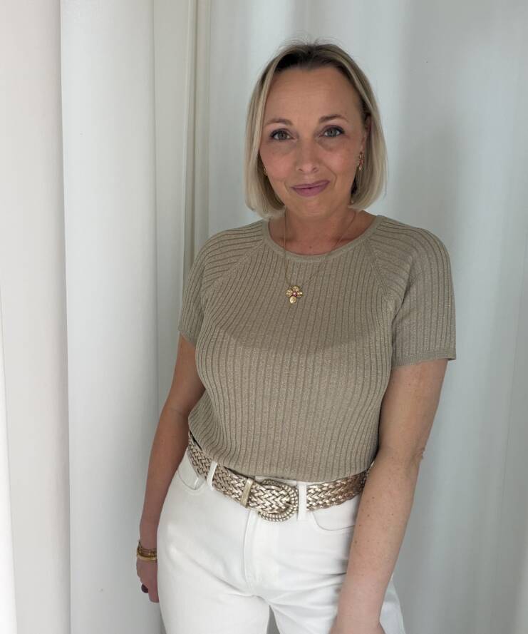 Voeg een vleugje glamour toe aan je outfit met deze stijlvolle glitter top. De top is uitgevoerd in een warme taupekleur met subtiele glans, waardoor je moeiteloos een feestelijke look creëert. De fijne ribstructuur zorgt voor een flatterende pasvorm en geeft het geheel een moderne uitstraling.