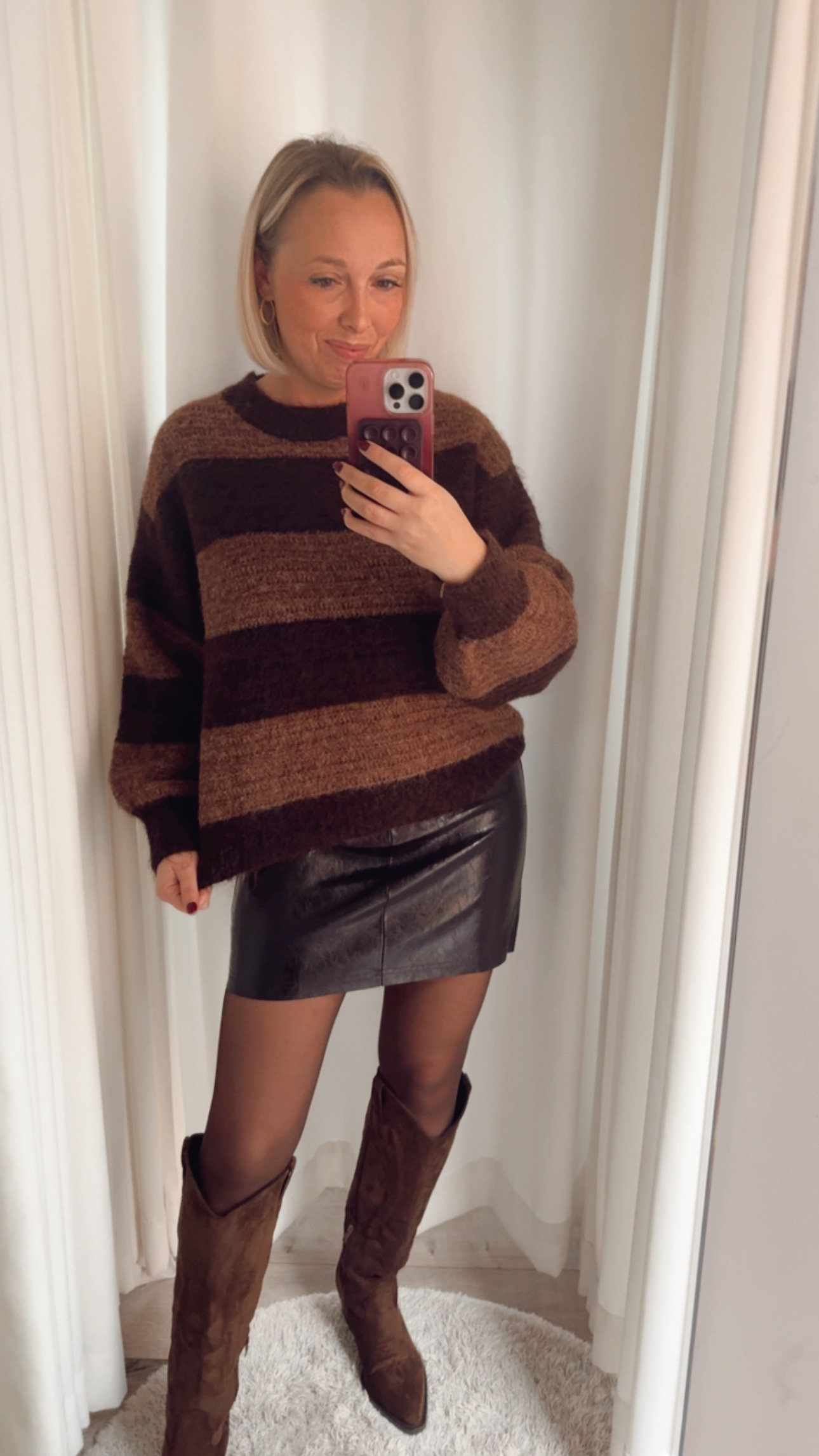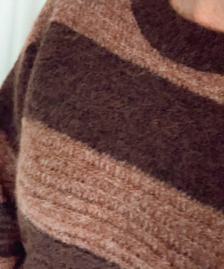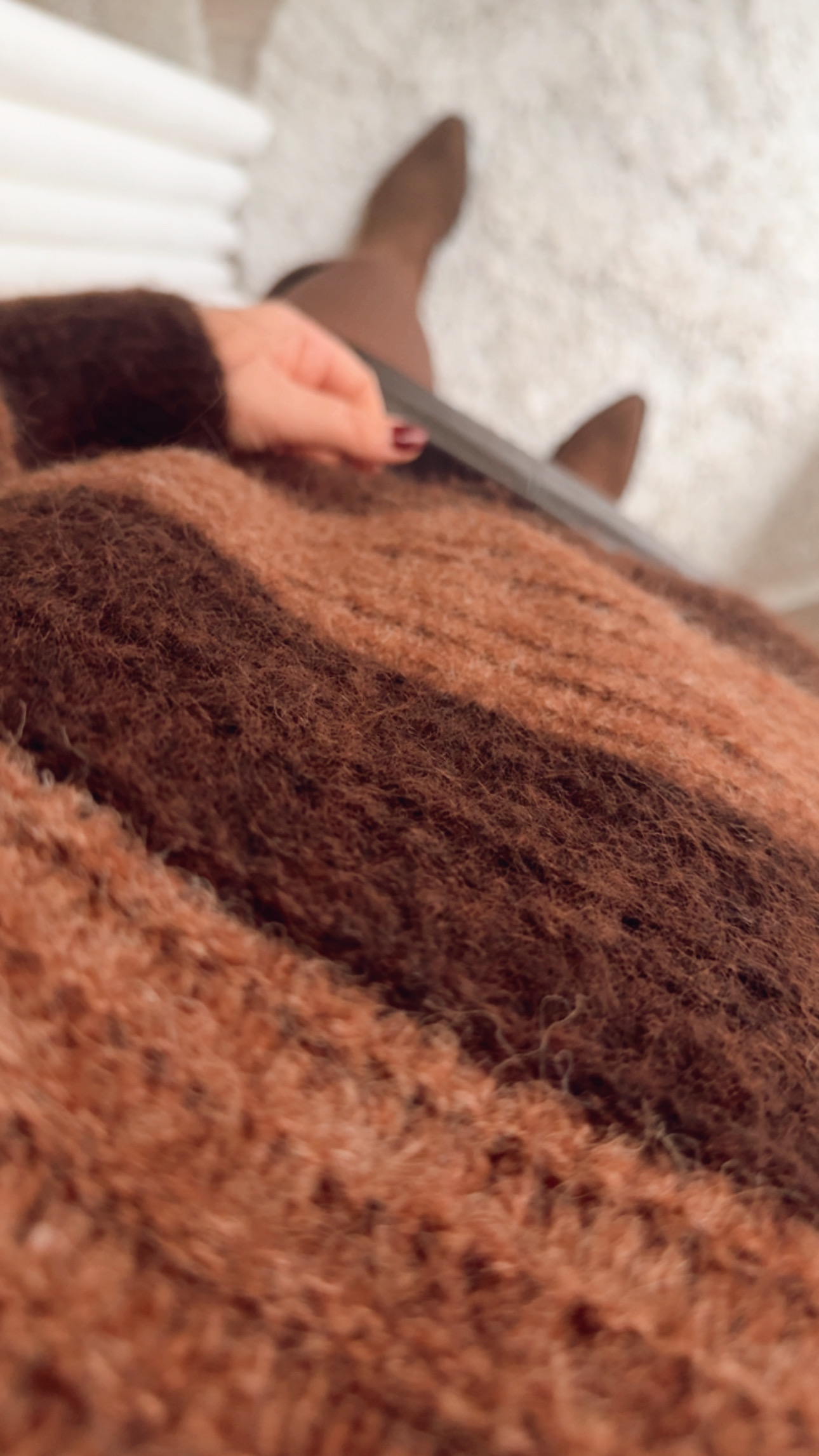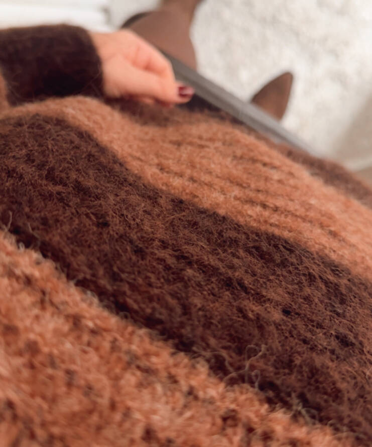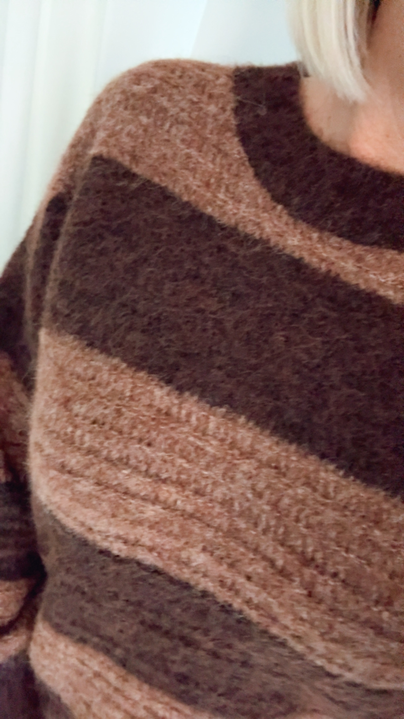 De brede strepen in chocoladekleurige tinten geven textuur aan je outfits, terwijl het zachte breisel je lichaam omhult met onweerstaanbaar comfort.