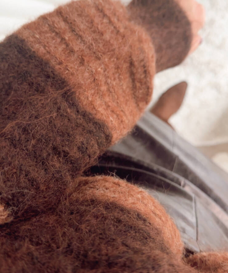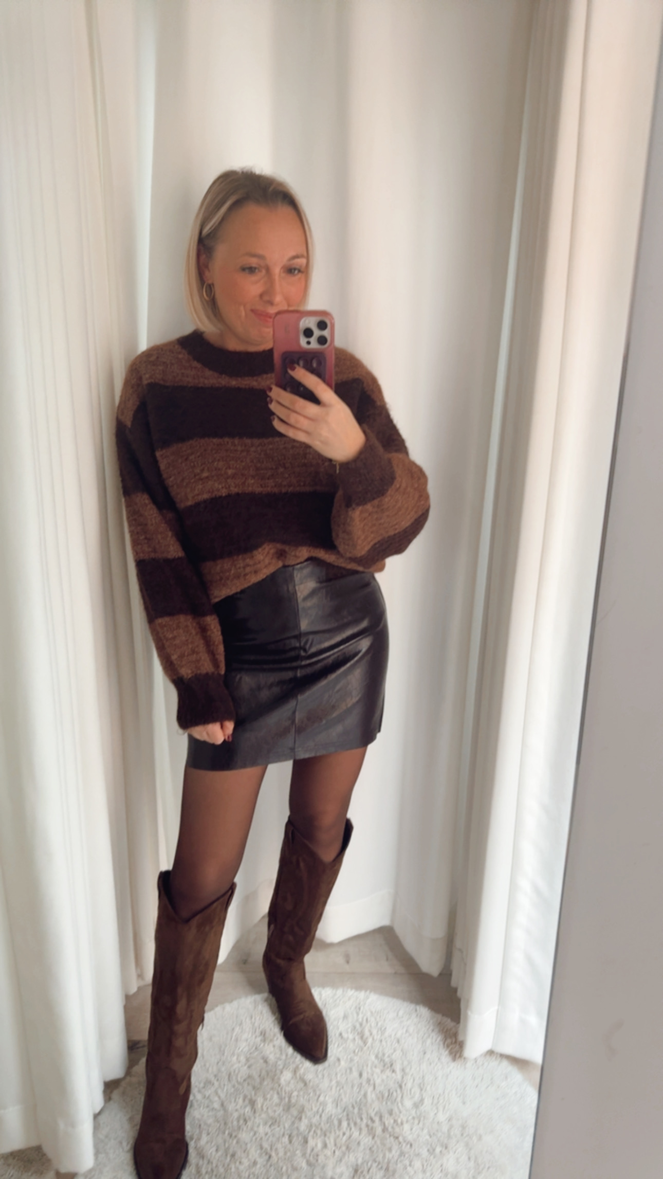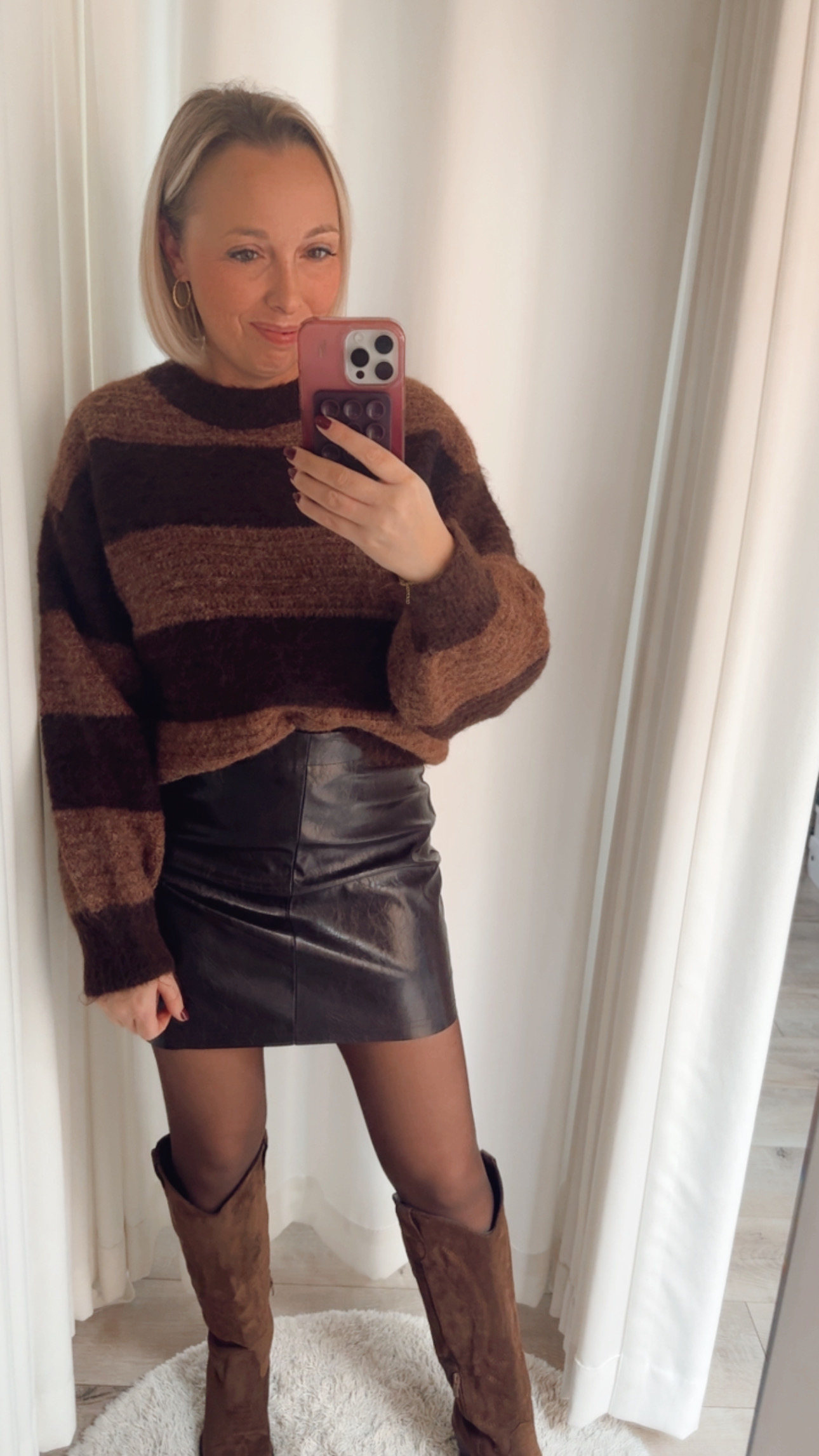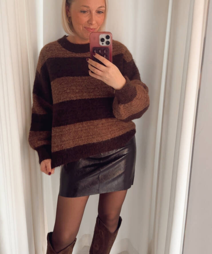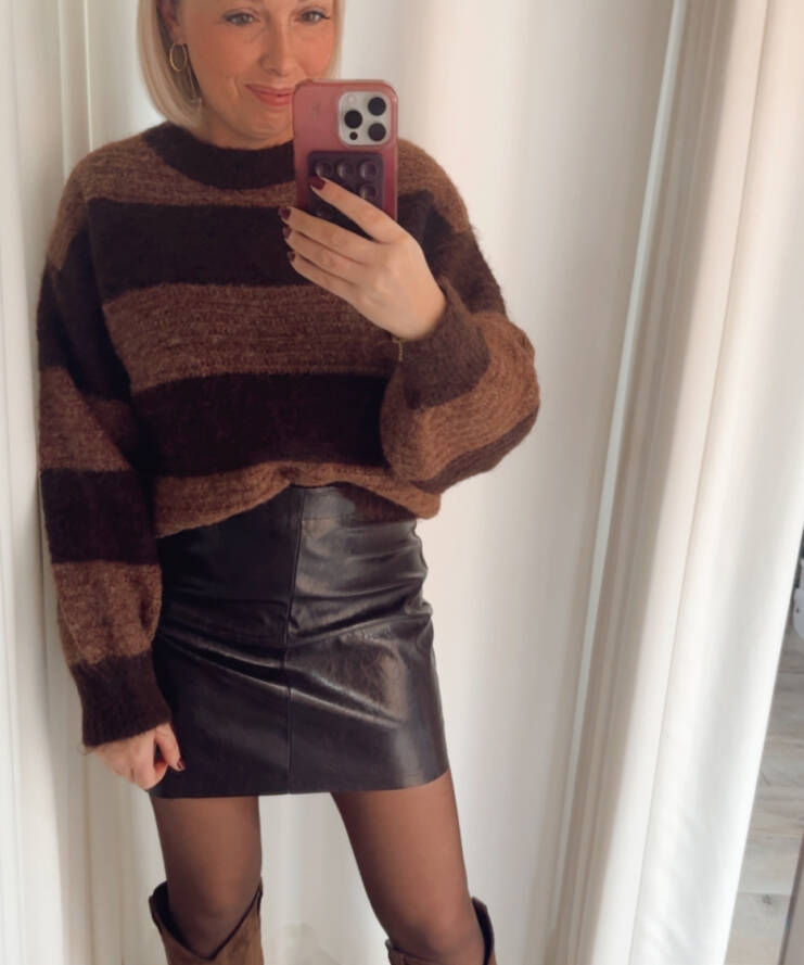 De brede strepen in chocoladekleurige tinten geven textuur aan je outfits, terwijl het zachte breisel je lichaam omhult met onweerstaanbaar comfort.