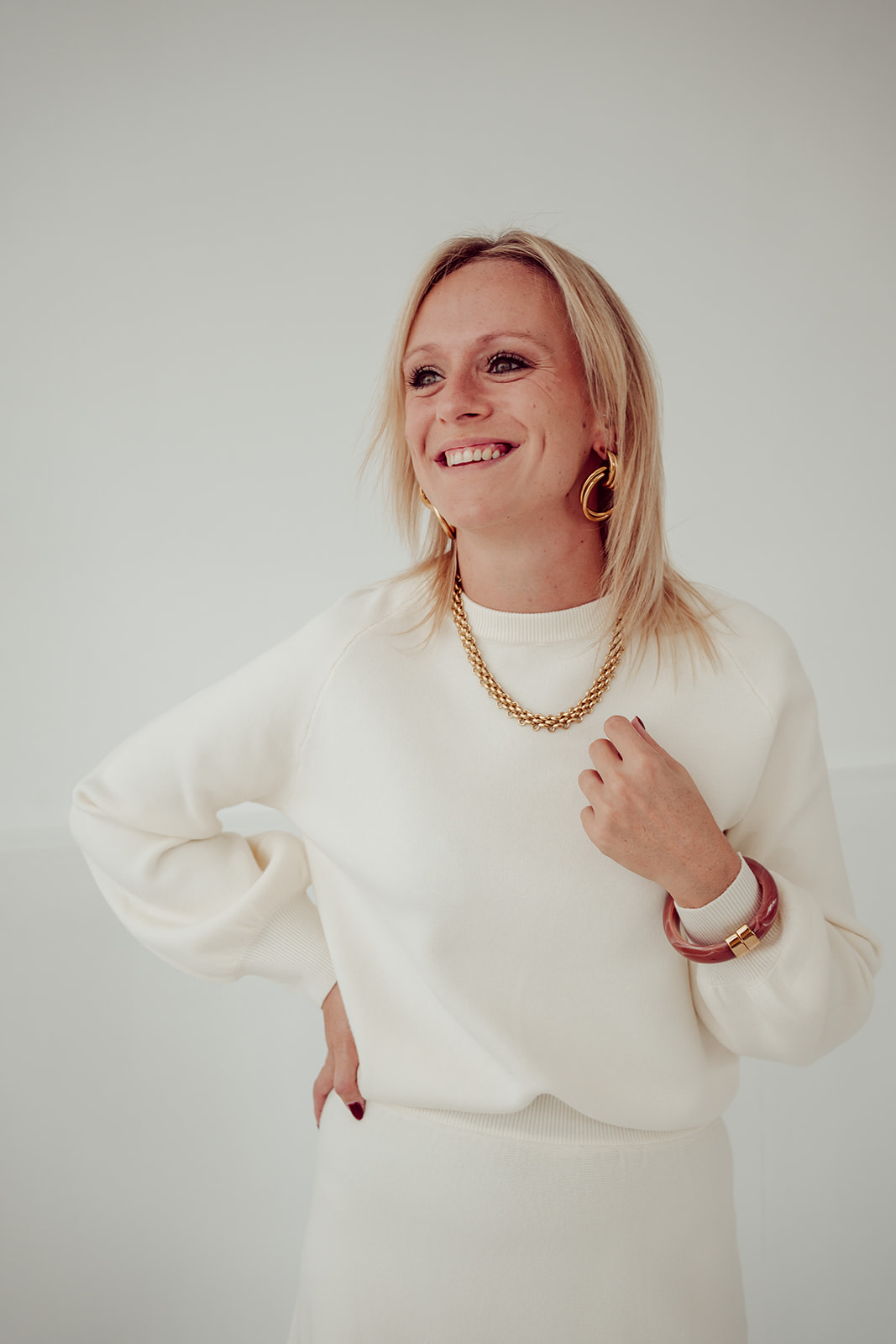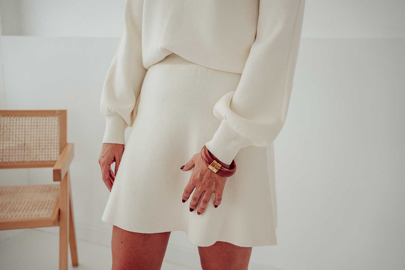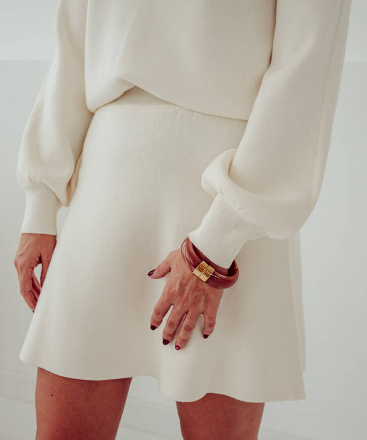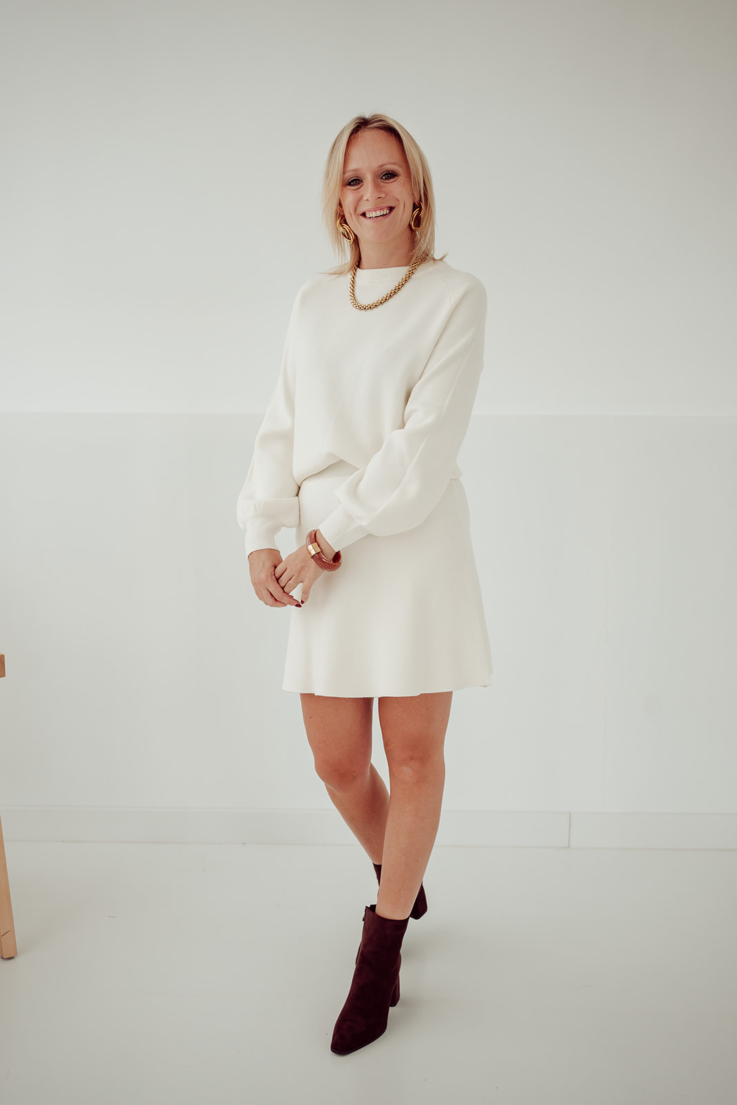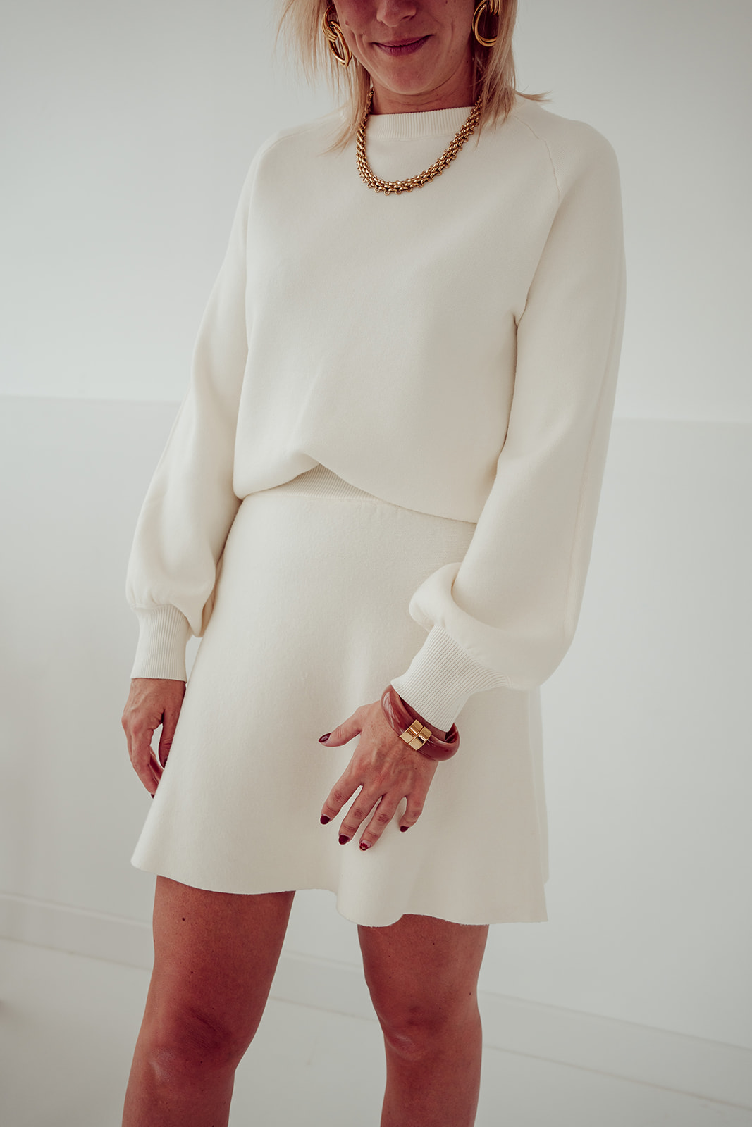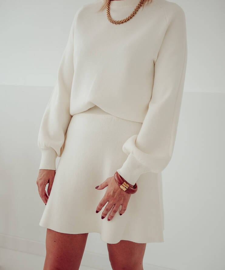 De zachte knitstof voelt aangenaam op je huid en beweegt mee met jouw ritme – van koffie to go tot avondplannen. Draag beide items samen als coördinerende look of combineer ze afzonderlijk: de trui met een jeans of de rok met een coltrui en laarzen.