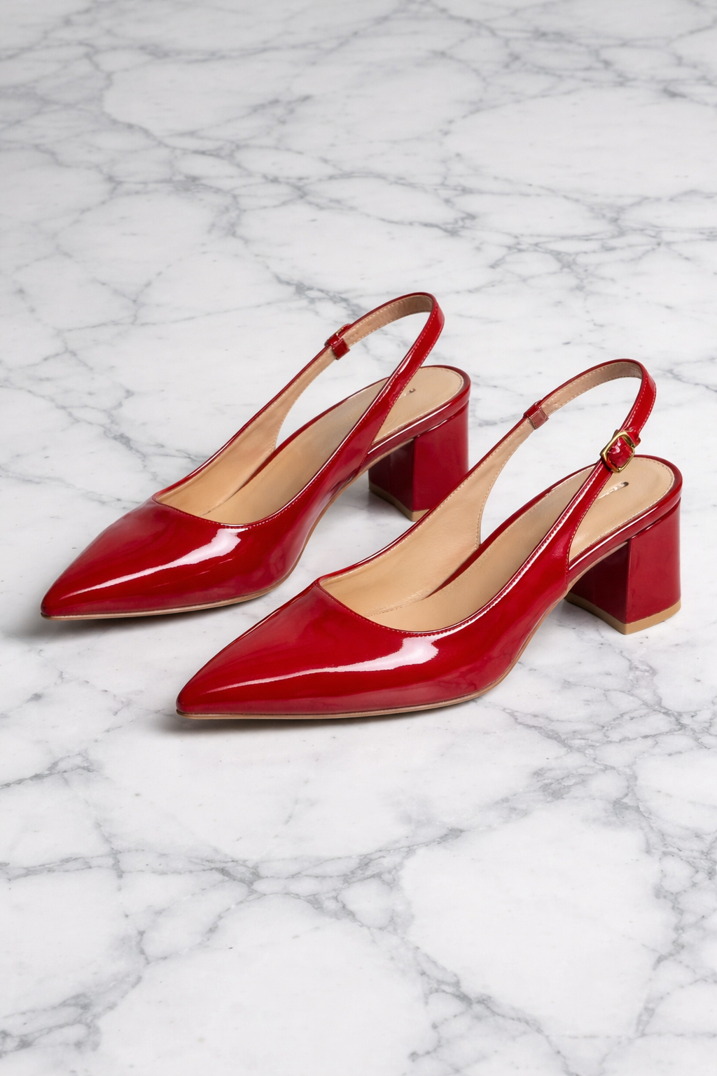 De verstelbare slingback-band met subtiele gesp zorgt voor een goede pasvorm en extra ondersteuning. De binnenzool is afgewerkt in een neutrale tint voor een stijlvol contrast met het opvallende rood.