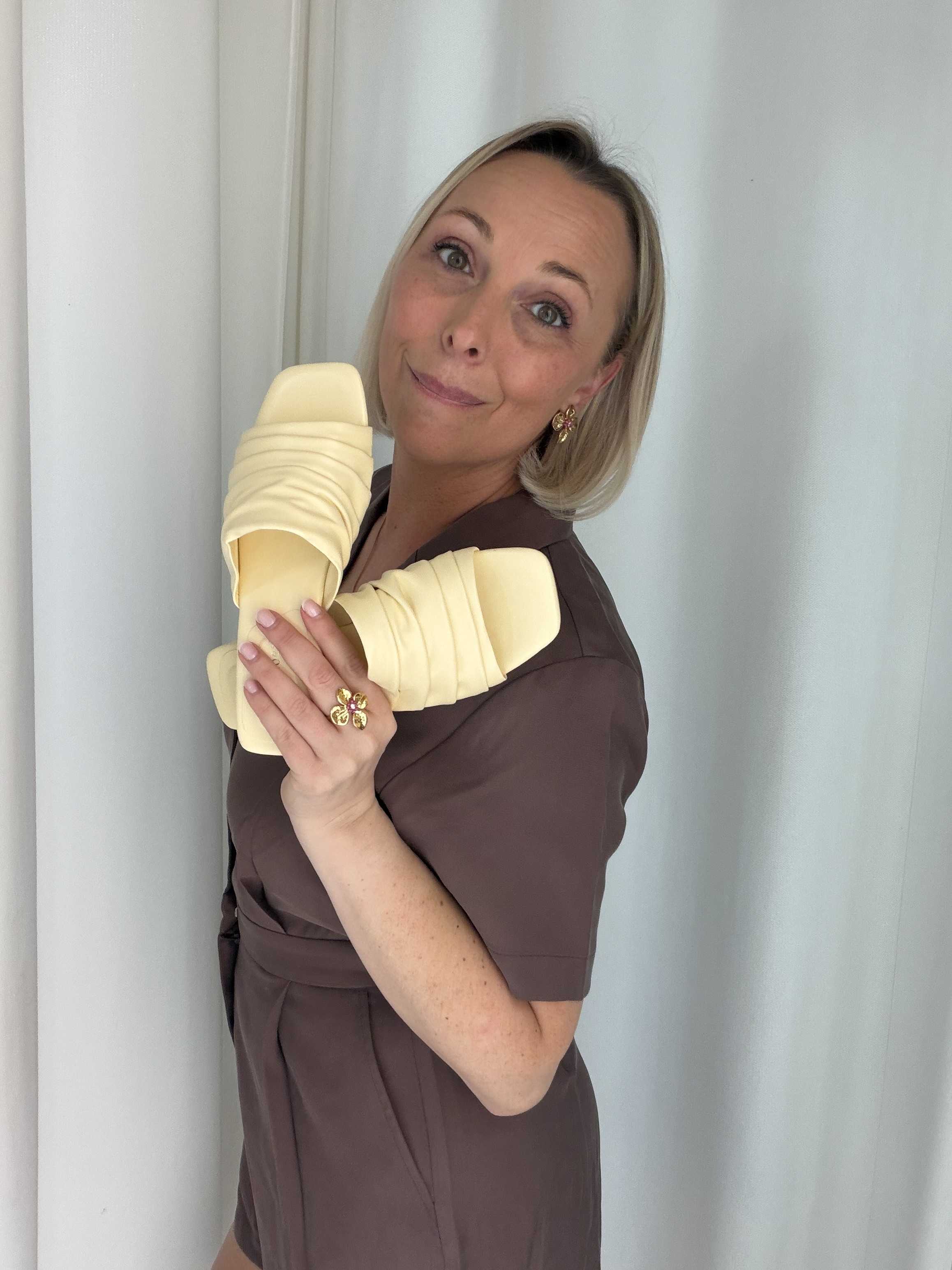 Less is more! Deze stijlvolle slippers in een zachte botergele tint zijn de perfecte basis voor elke zomerse outfit. Het moderne multi-band design geeft een subtiele, trendy uitstraling en zorgt tegelijkertijd voor een comfortabele pasvorm.