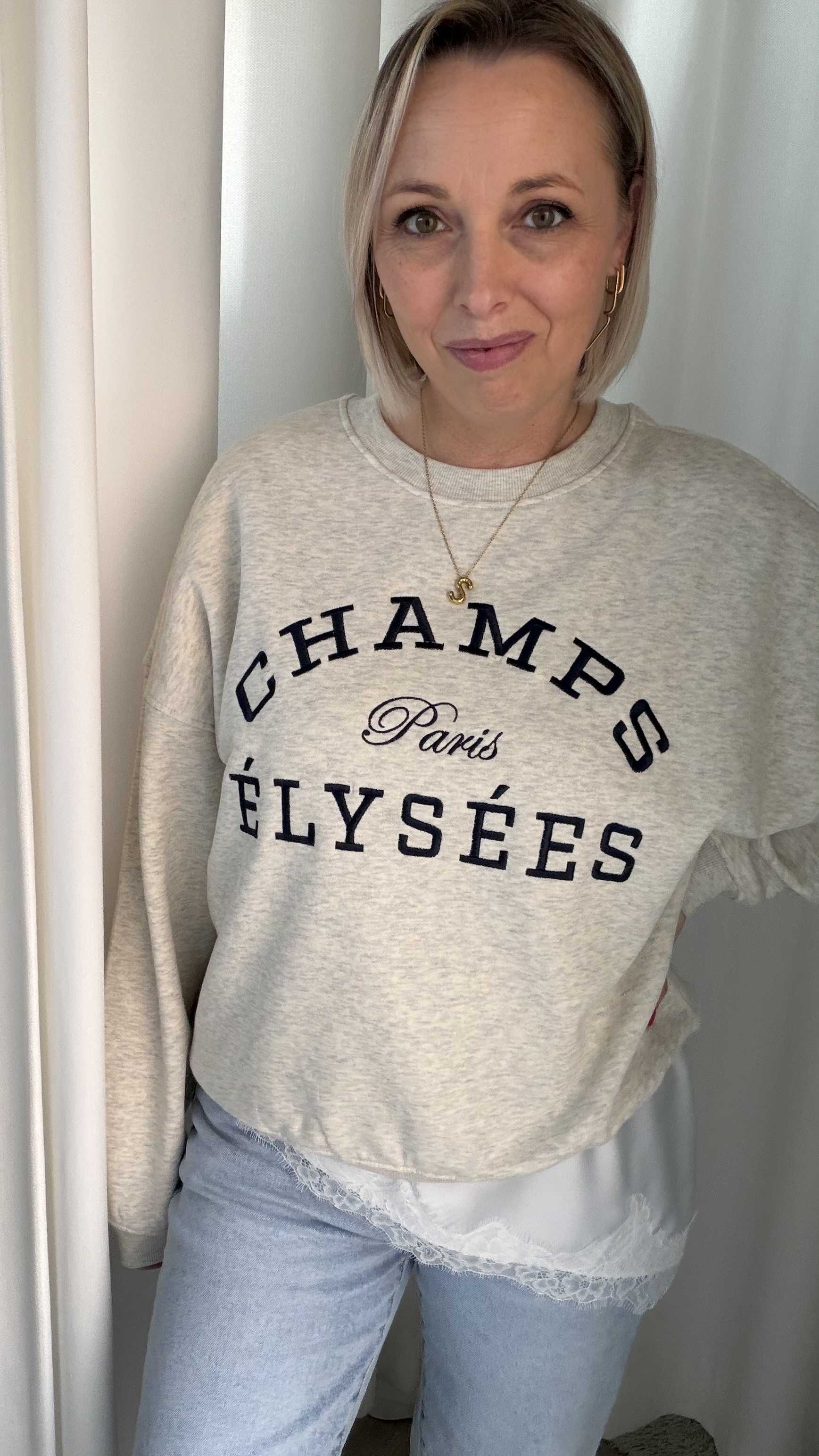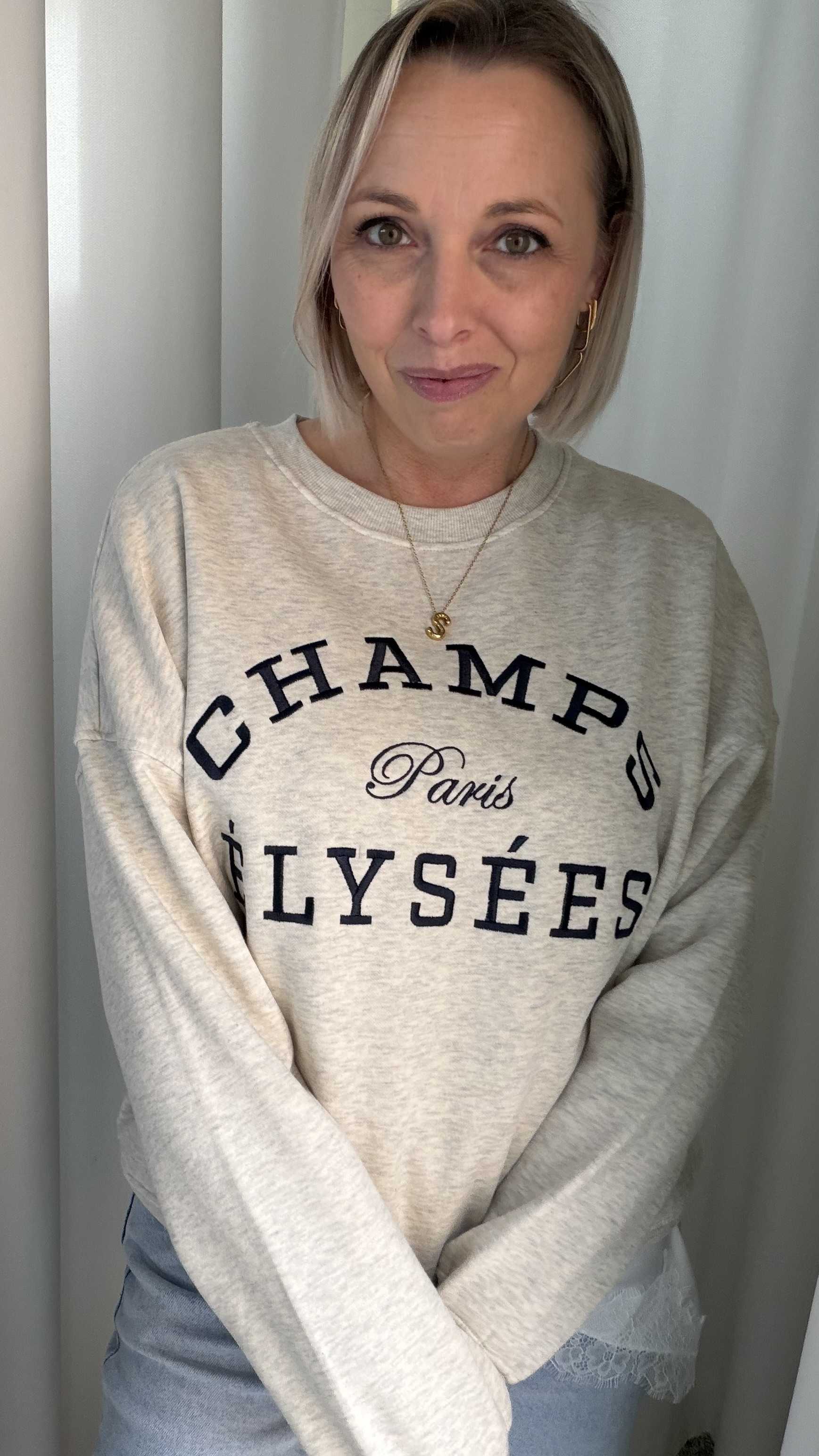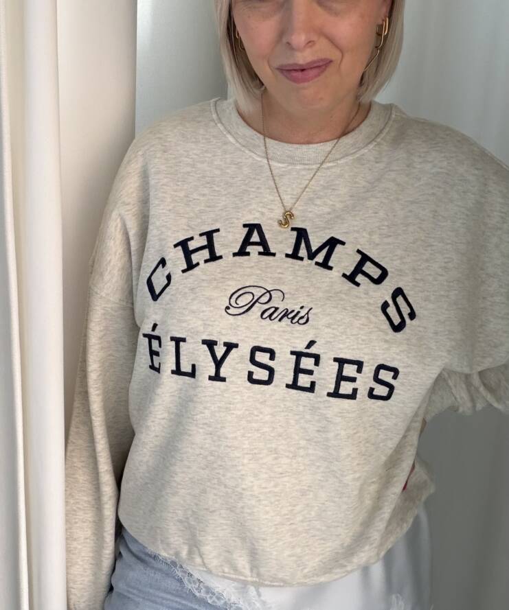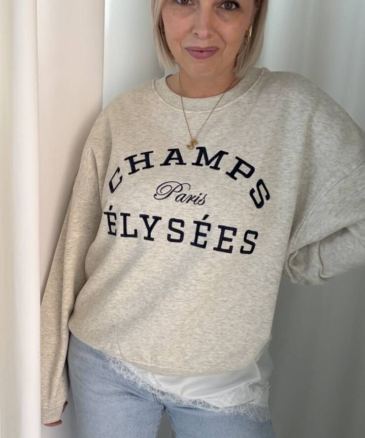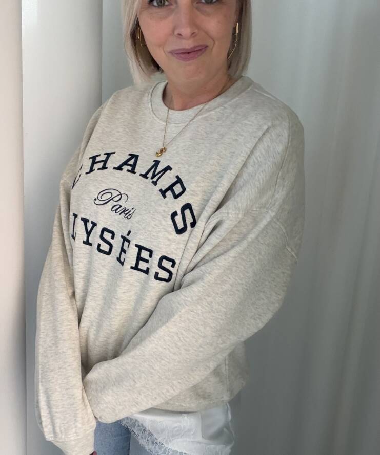 Deze stijlvolle sweater combineert comfort met een vleugje Parijse flair. De voorkant is voorzien van een opvallende “Champs Élysées – Paris” print in donkerblauw, wat zorgt voor een tijdloze en casual uitstraling. De zachte, lichtgemêleerde stof en de relaxte pasvorm maken dit een perfecte sweater voor elke dag.