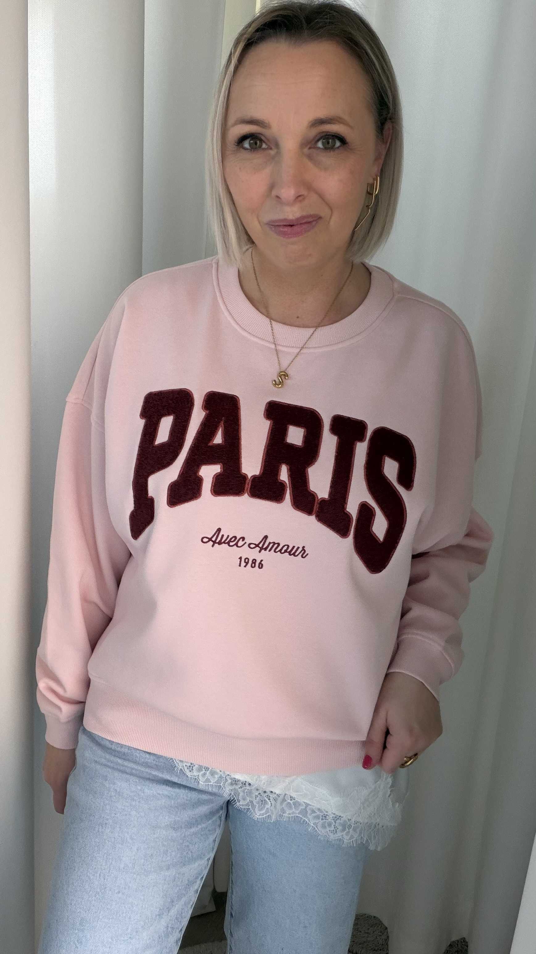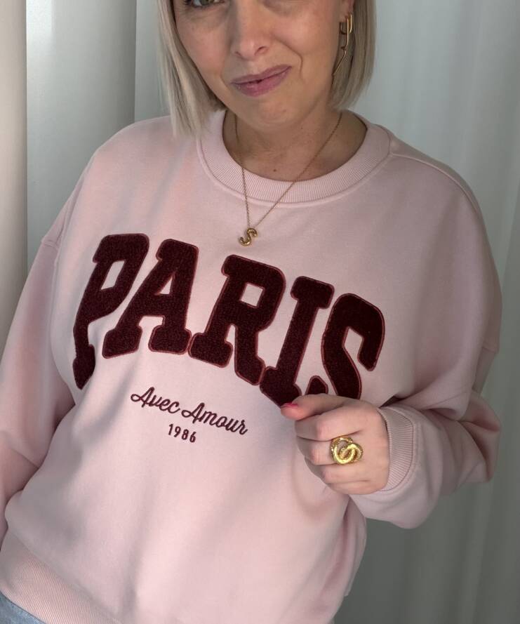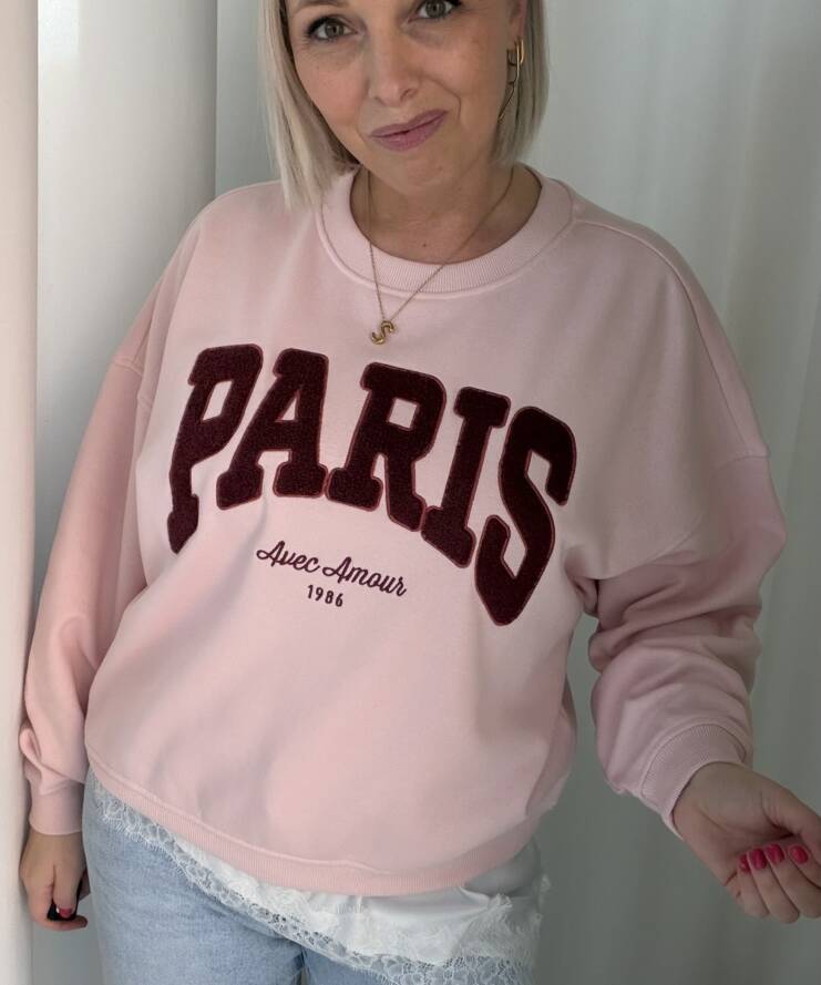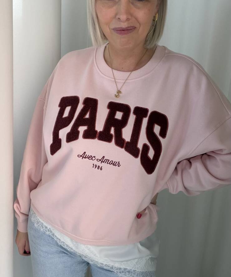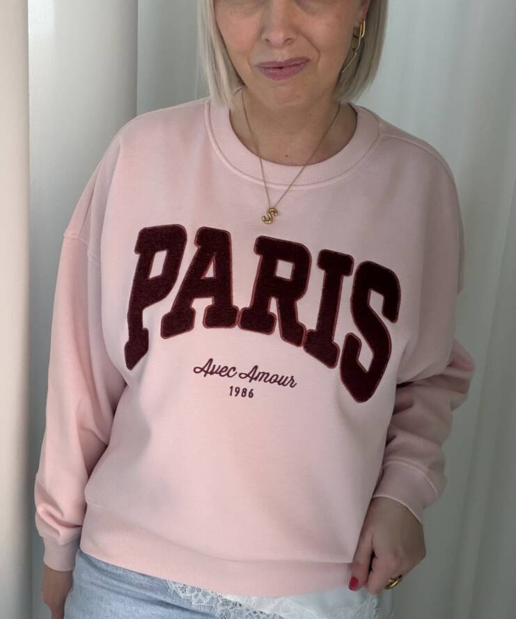 Deze sweater geeft je outfit een stijlvolle, Franse uitstraling. De zachte roze kleur vormt een mooie basis voor de opvallende “PARIS” print in diep rood, afgewerkt met de subtiele tekst “Avec Amour 1986”. Een echte eyecatcher met een romantische twist.