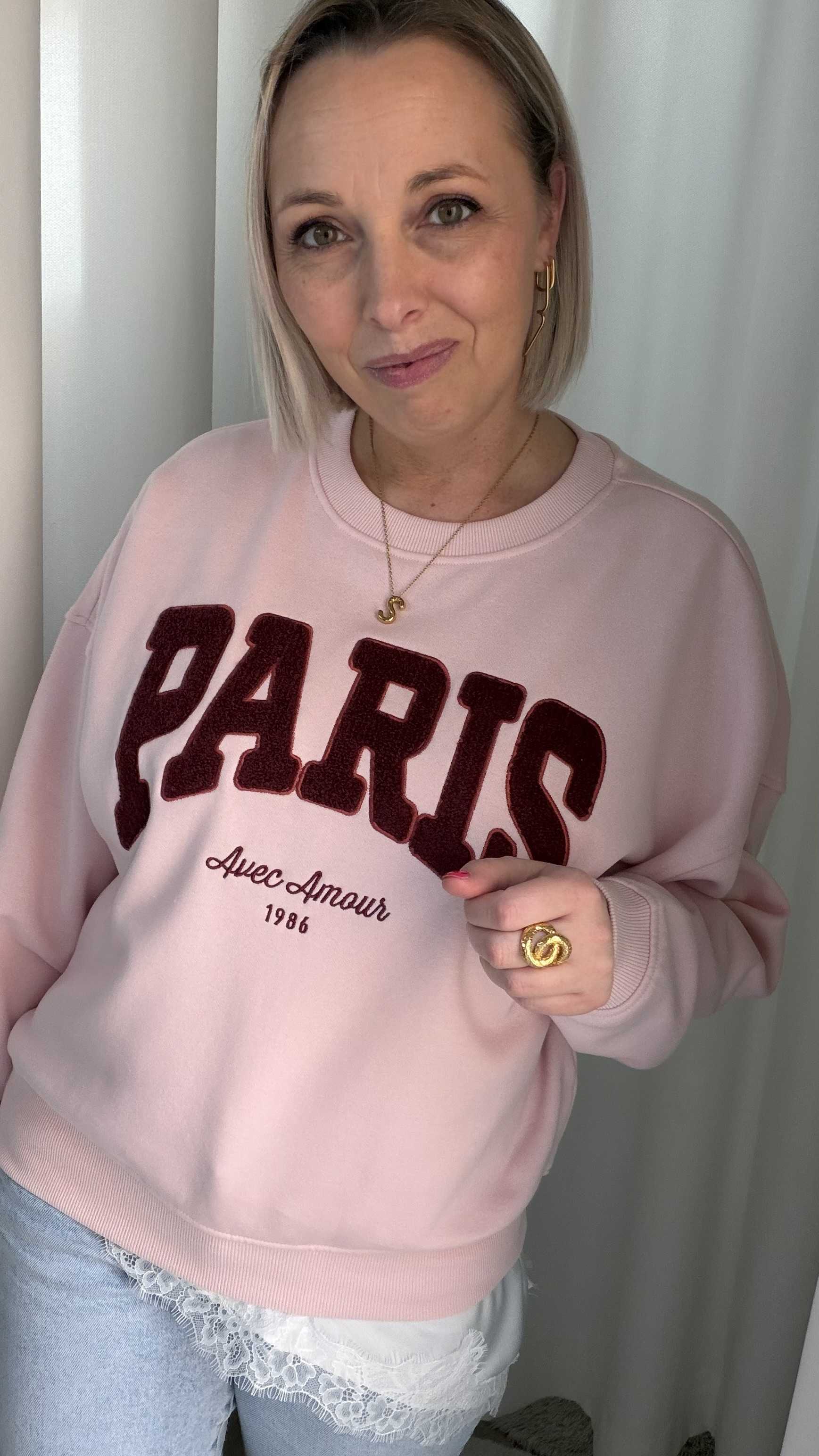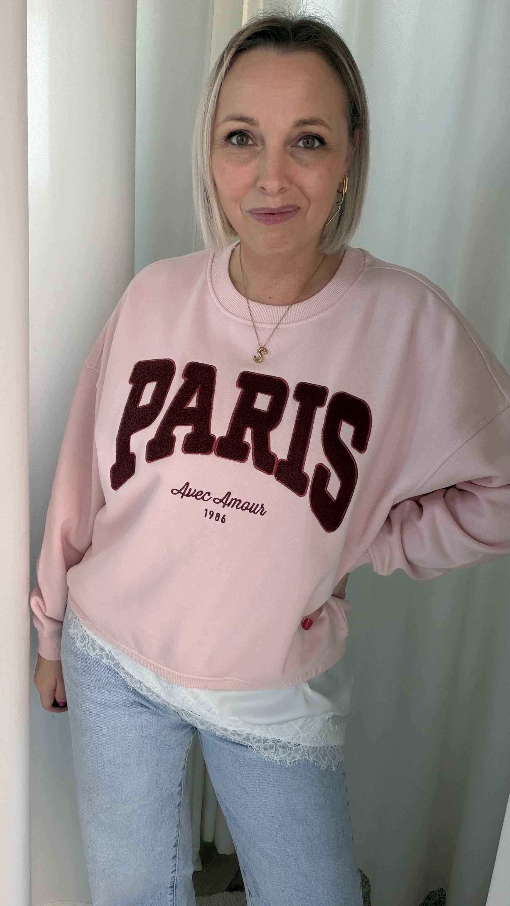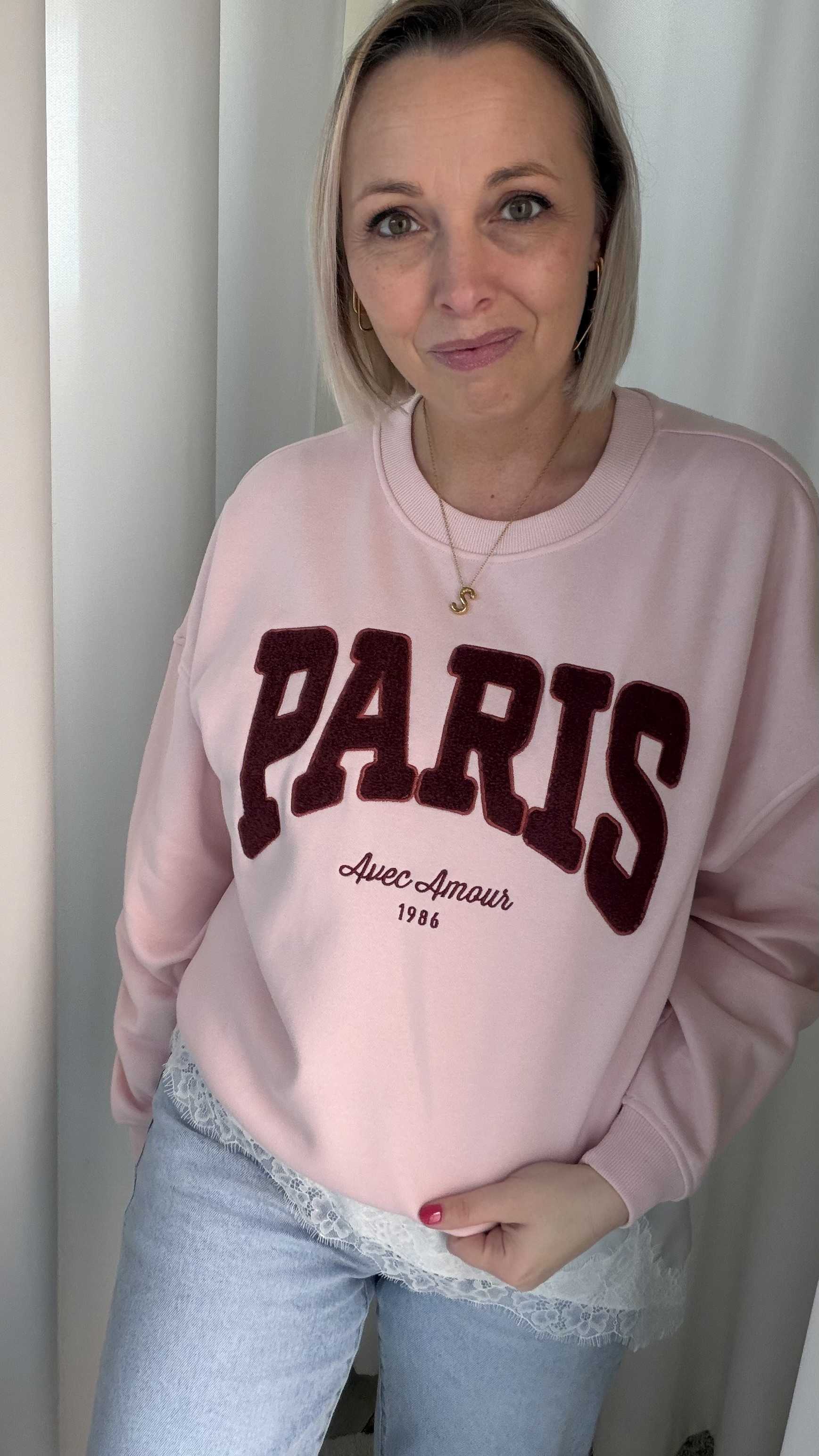 Deze sweater geeft je outfit een stijlvolle, Franse uitstraling. De zachte roze kleur vormt een mooie basis voor de opvallende “PARIS” print in diep rood, afgewerkt met de subtiele tekst “Avec Amour 1986”. Een echte eyecatcher met een romantische twist.
