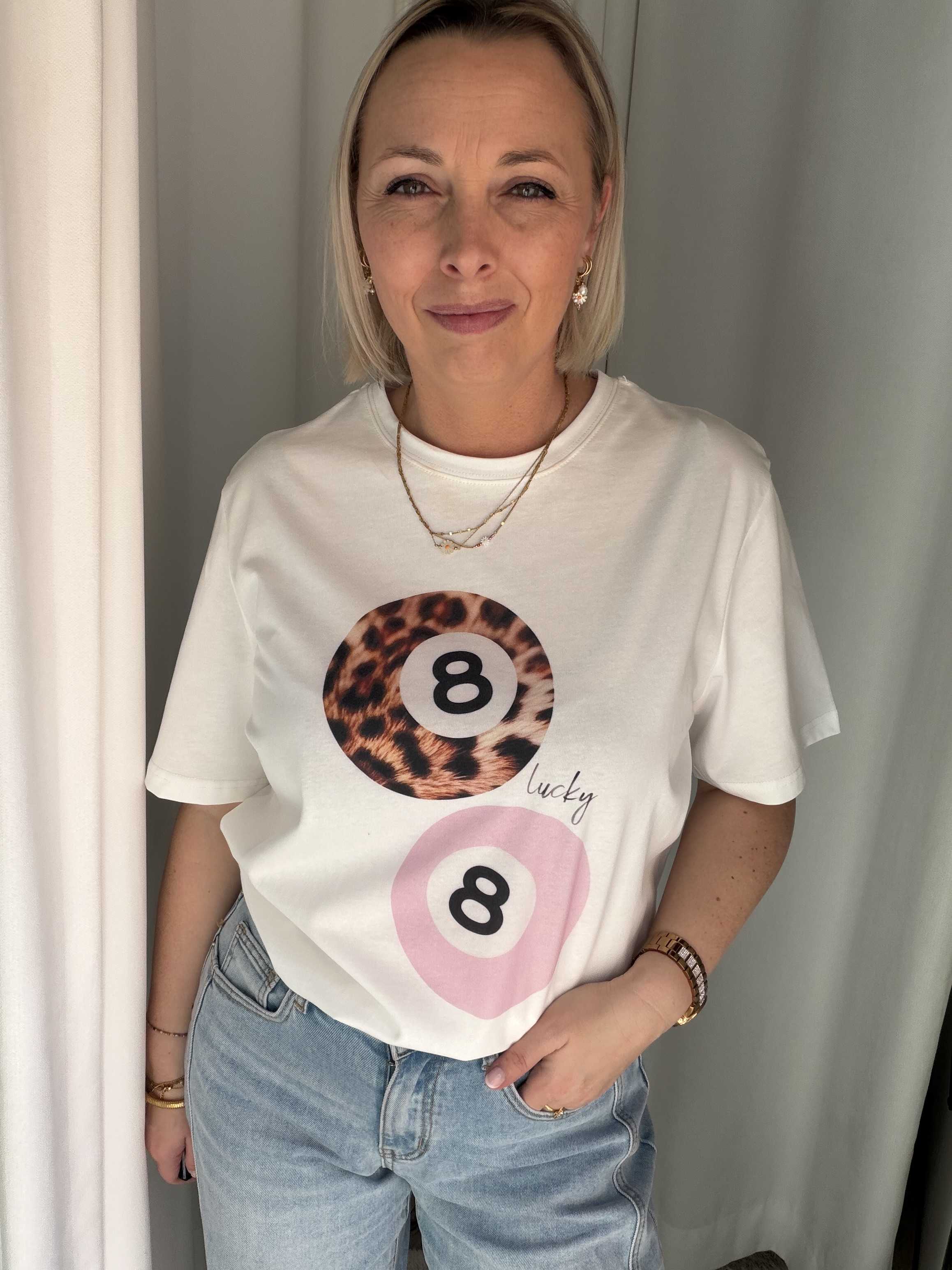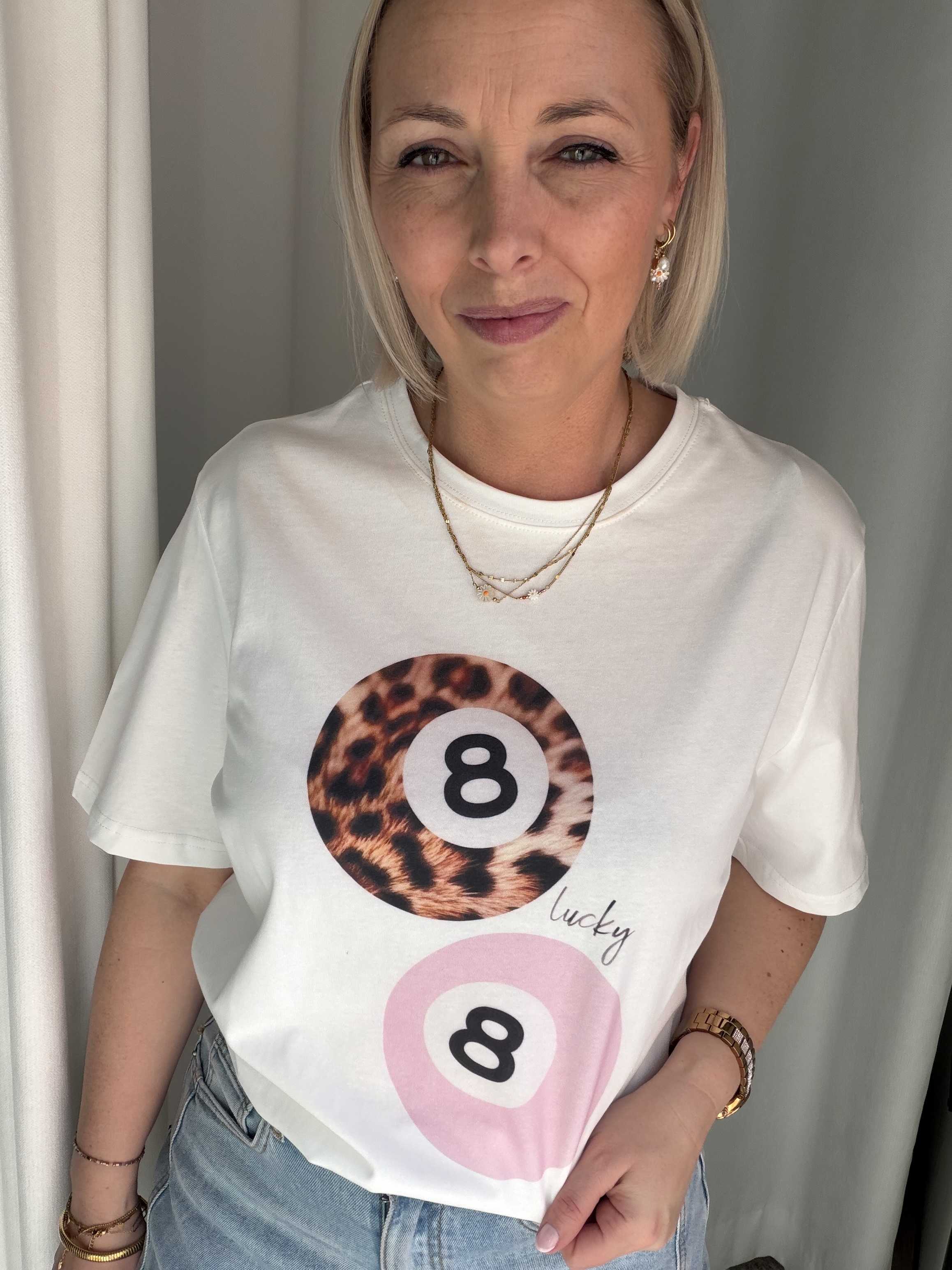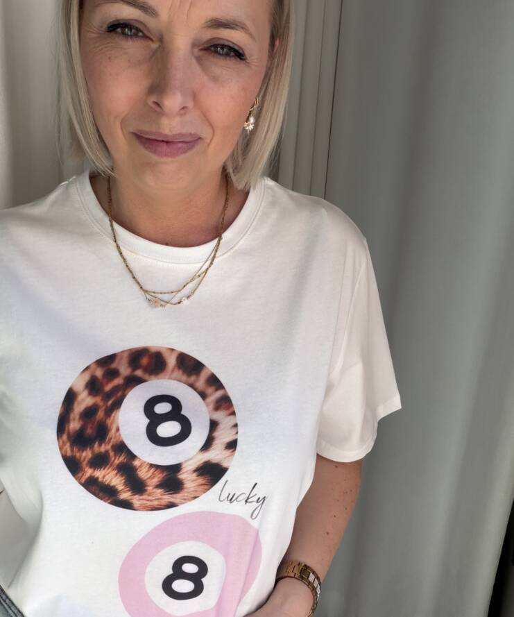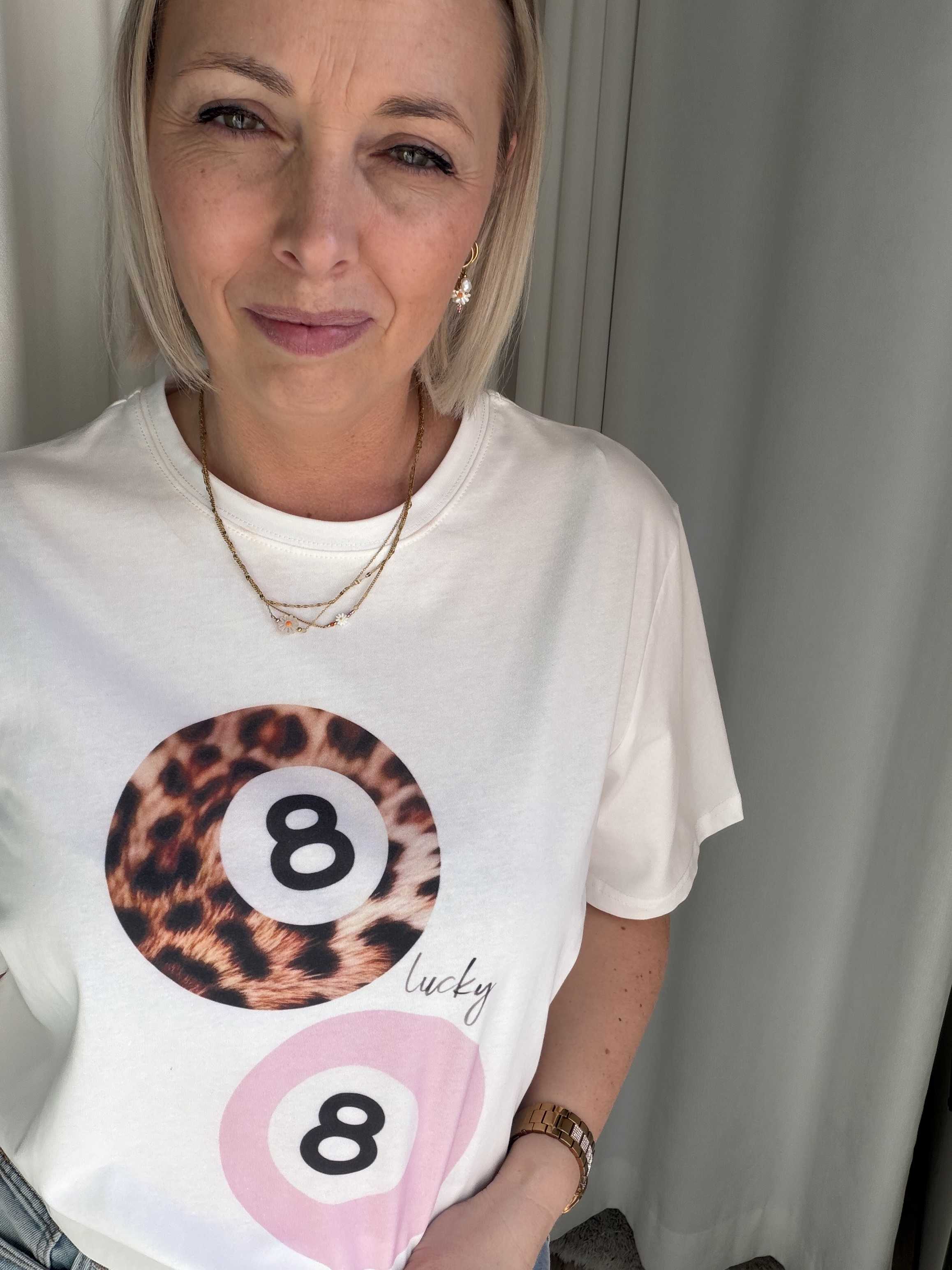 Deze stijlvolle oversized T-shirt is een echte must-have voor een casual, trendy look. De witte basis wordt speels gecombineerd met twee opvallende prints van het cijfer 8 – één in een stoere luipaardprint en één in zacht roze – met het subtiele woord “lucky” ertussen voor een vrouwelijke touch.