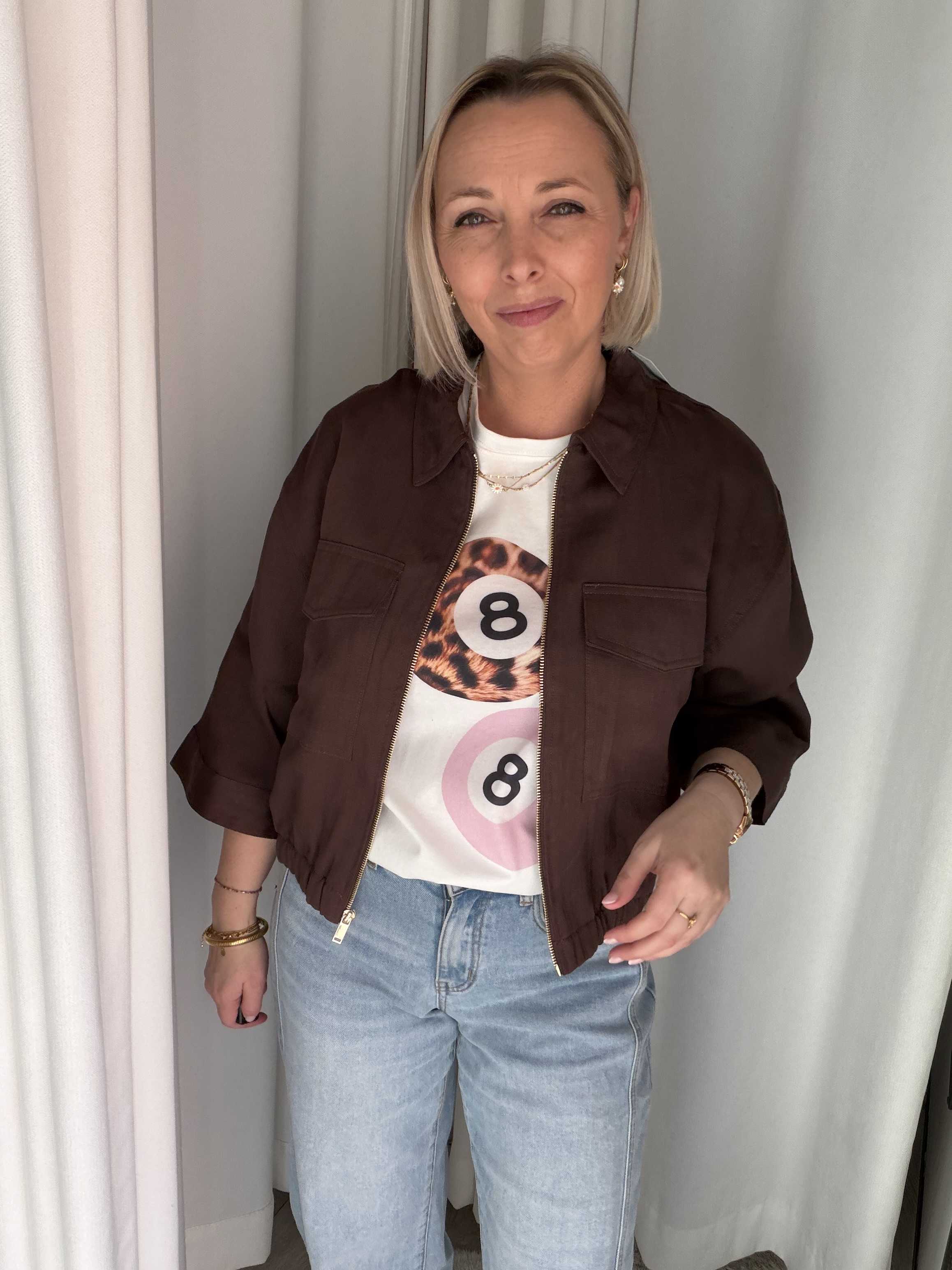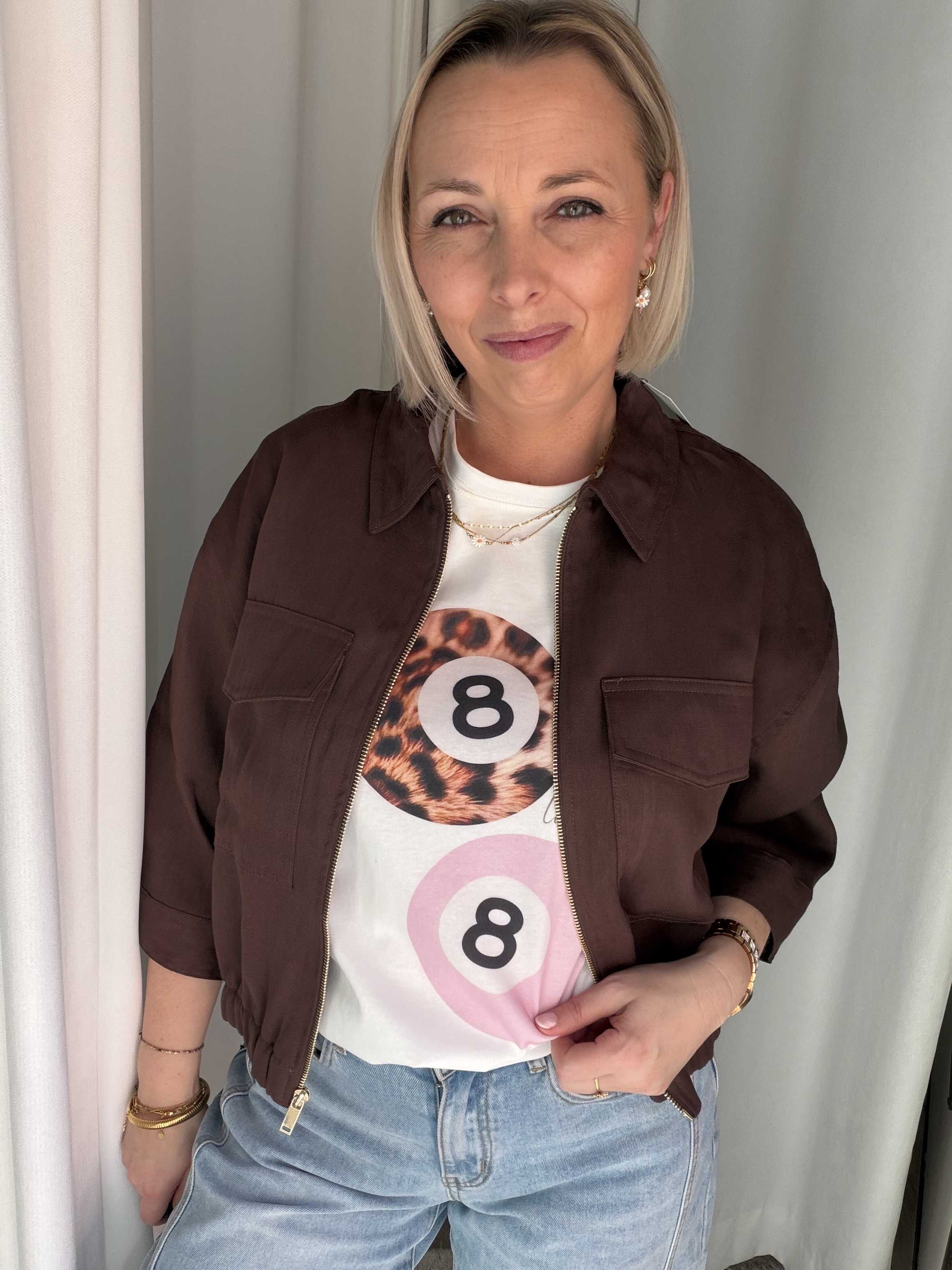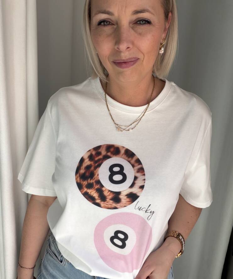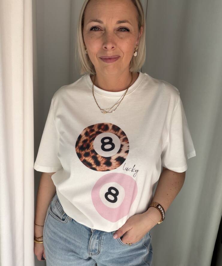 Deze stijlvolle oversized T-shirt is een echte must-have voor een casual, trendy look. De witte basis wordt speels gecombineerd met twee opvallende prints van het cijfer 8 – één in een stoere luipaardprint en één in zacht roze – met het subtiele woord “lucky” ertussen voor een vrouwelijke touch.
