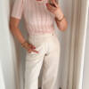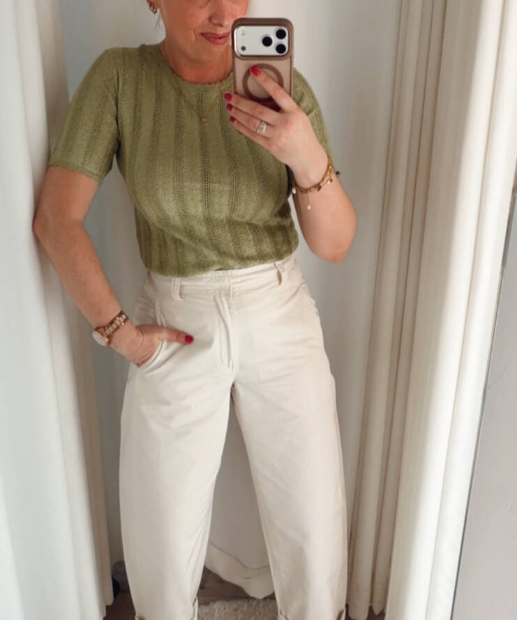 De top is gemaakt van een zachte, licht rekbare stof die comfortabel aanvoelt en mooi aansluit op het lichaam. De ronde halslijn en korte mouwen maken dit item ideaal voor zowel casual als meer geklede outfits. Draag hem op een jeans voor een relaxte look of combineer met een rok of pantalon voor een elegante uitstraling.