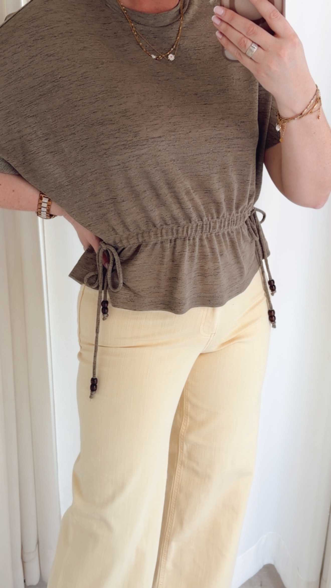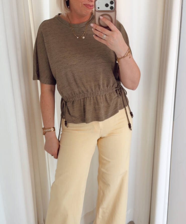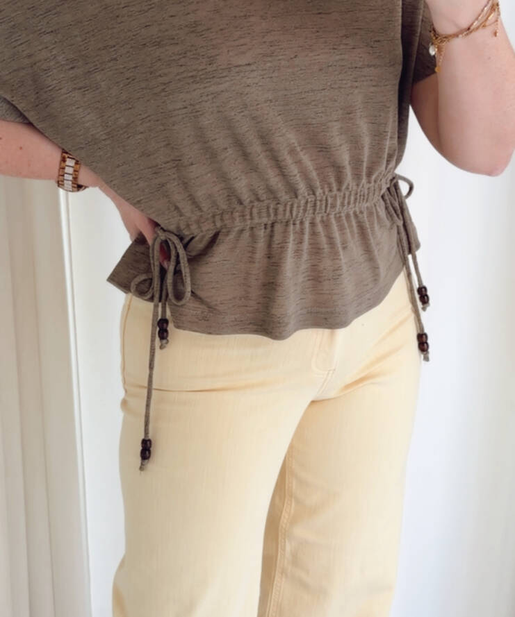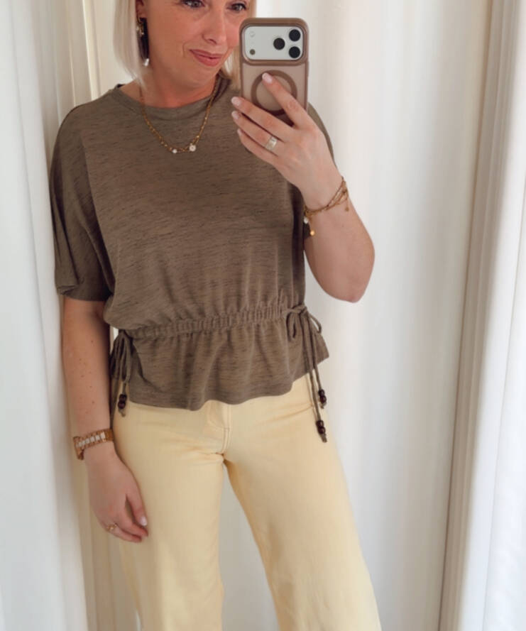 Het subtiele strikdetail in de taille geeft de top een speelse twist en maakt het mogelijk om de pasvorm naar wens te verstellen. Hierdoor creëer je eenvoudig een flatterend silhouet.