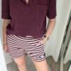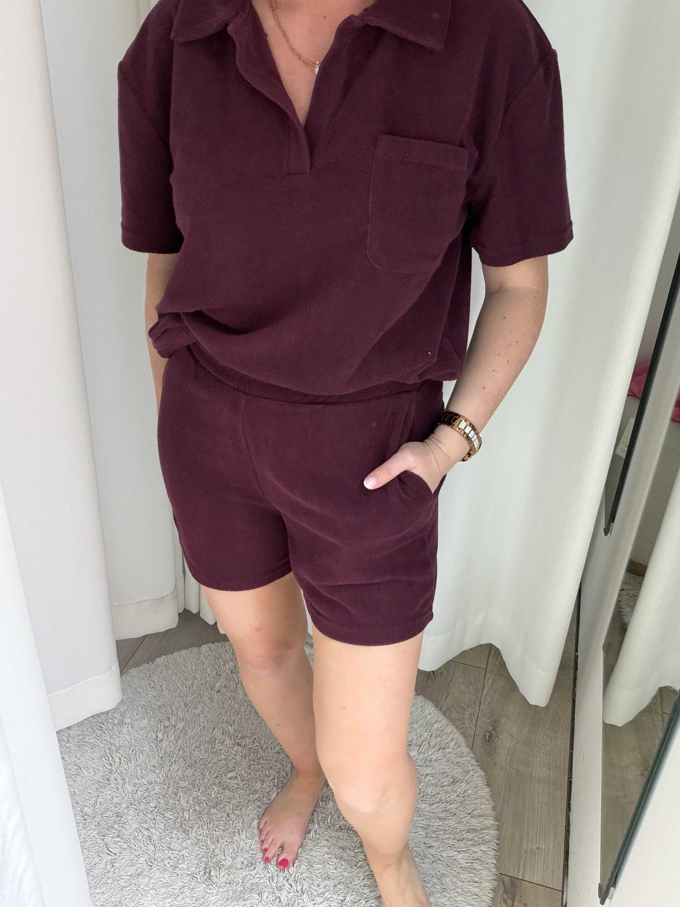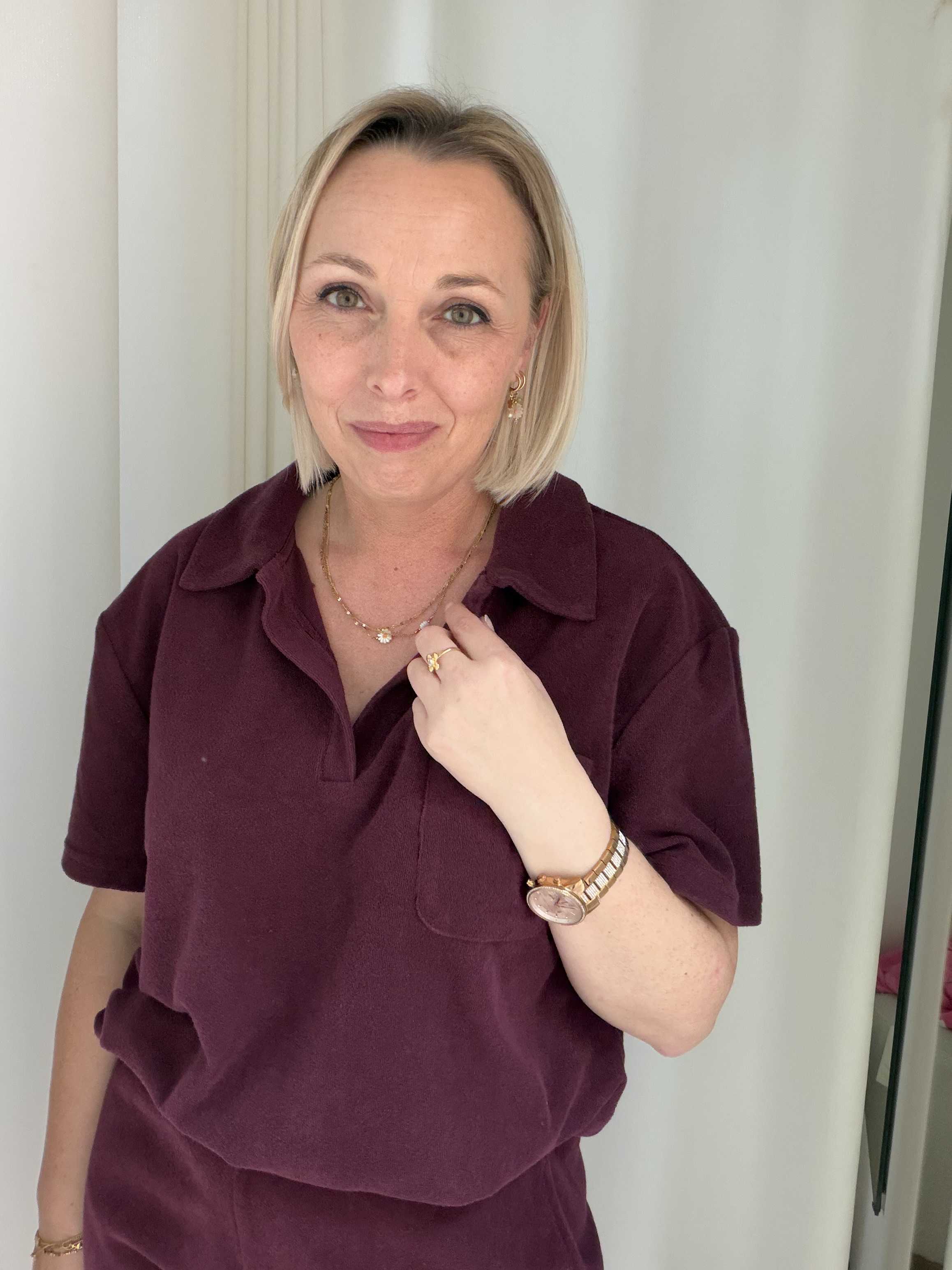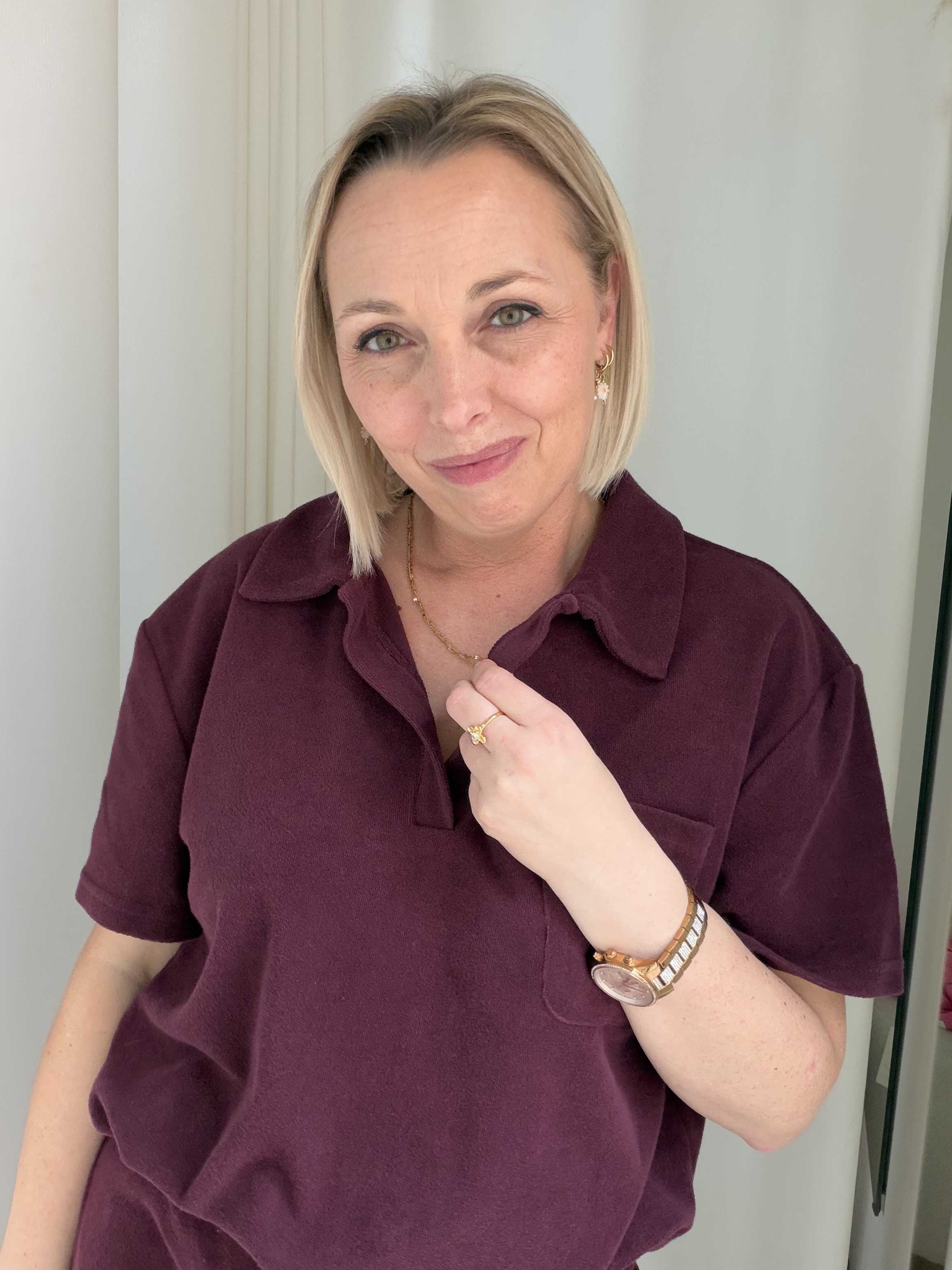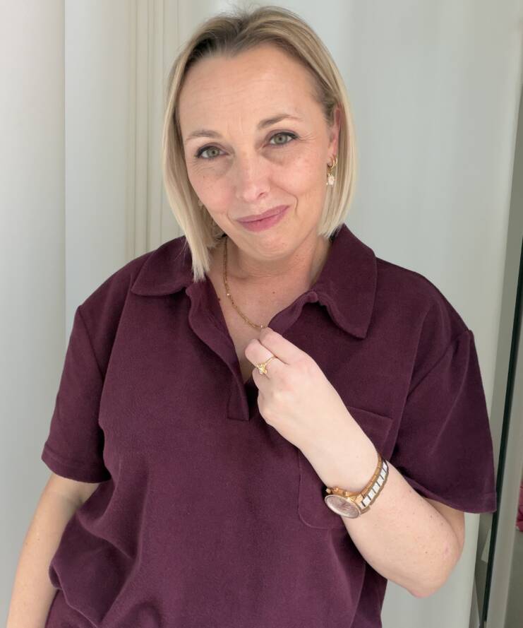 De top heeft een klassieke polokraag met een subtiele V-hals zonder knoopjes, wat zorgt voor een relaxte en vrouwelijke uitstraling. De diepe bordeauxkleur geeft het item een warme, elegante look die makkelijk te combineren is. Het borstzakje voegt een speels detail toe, terwijl de losse pasvorm zorgt voor extra draagcomfort.