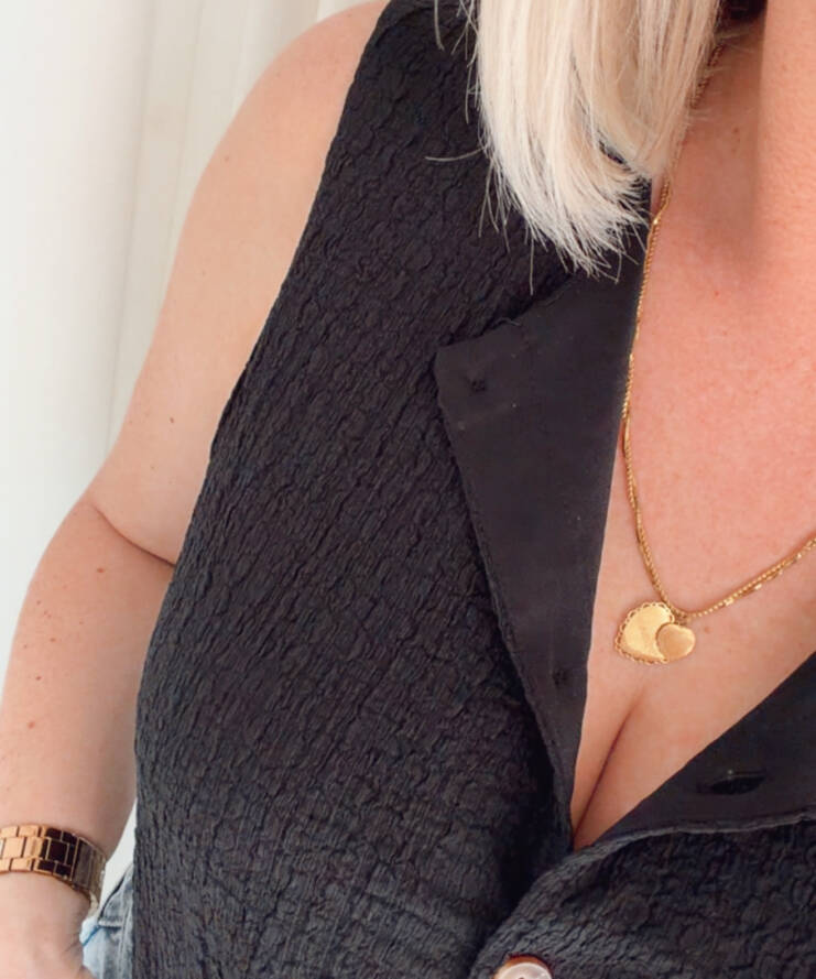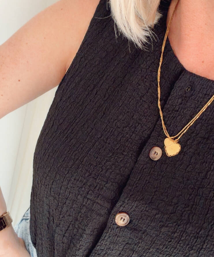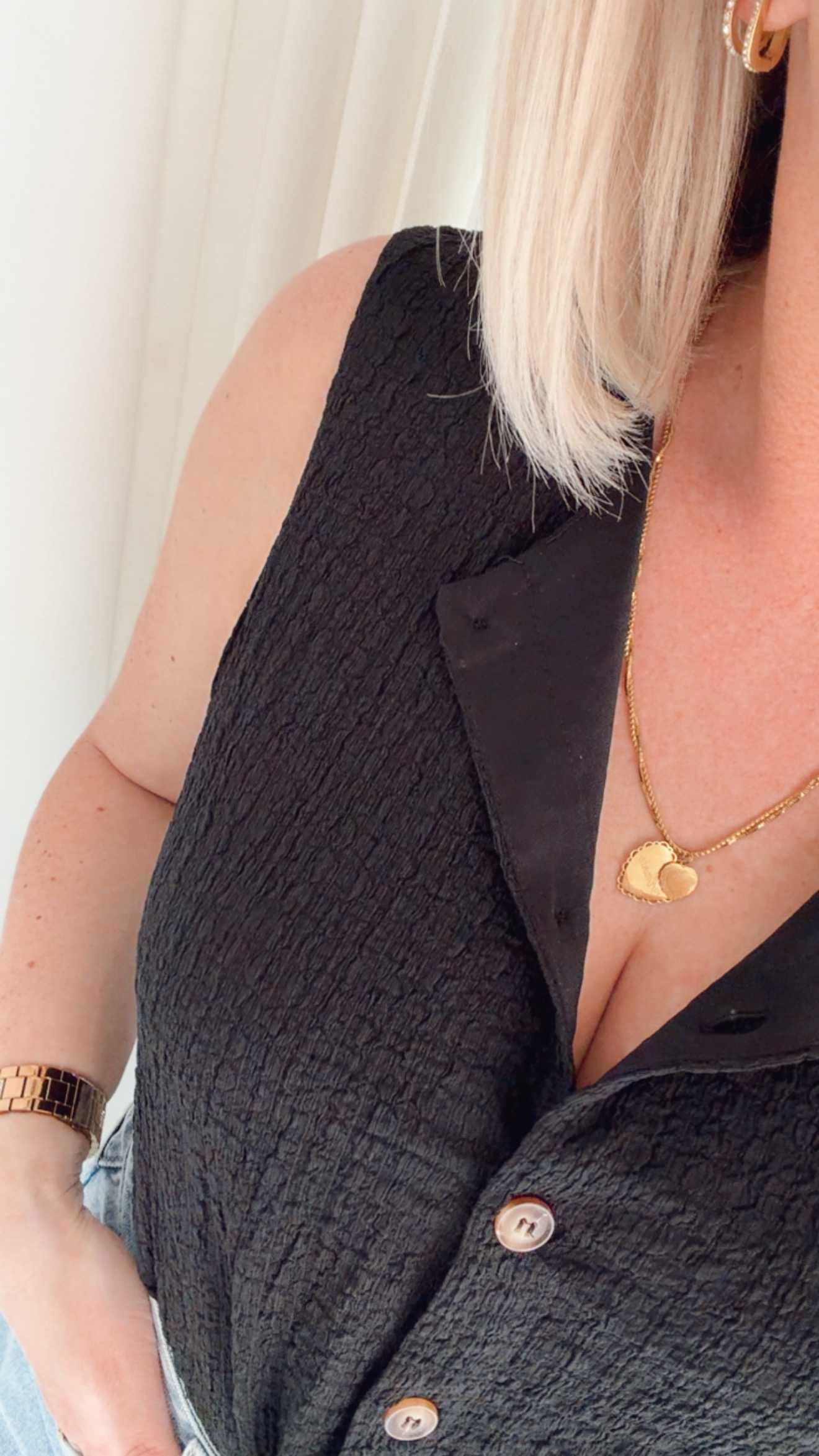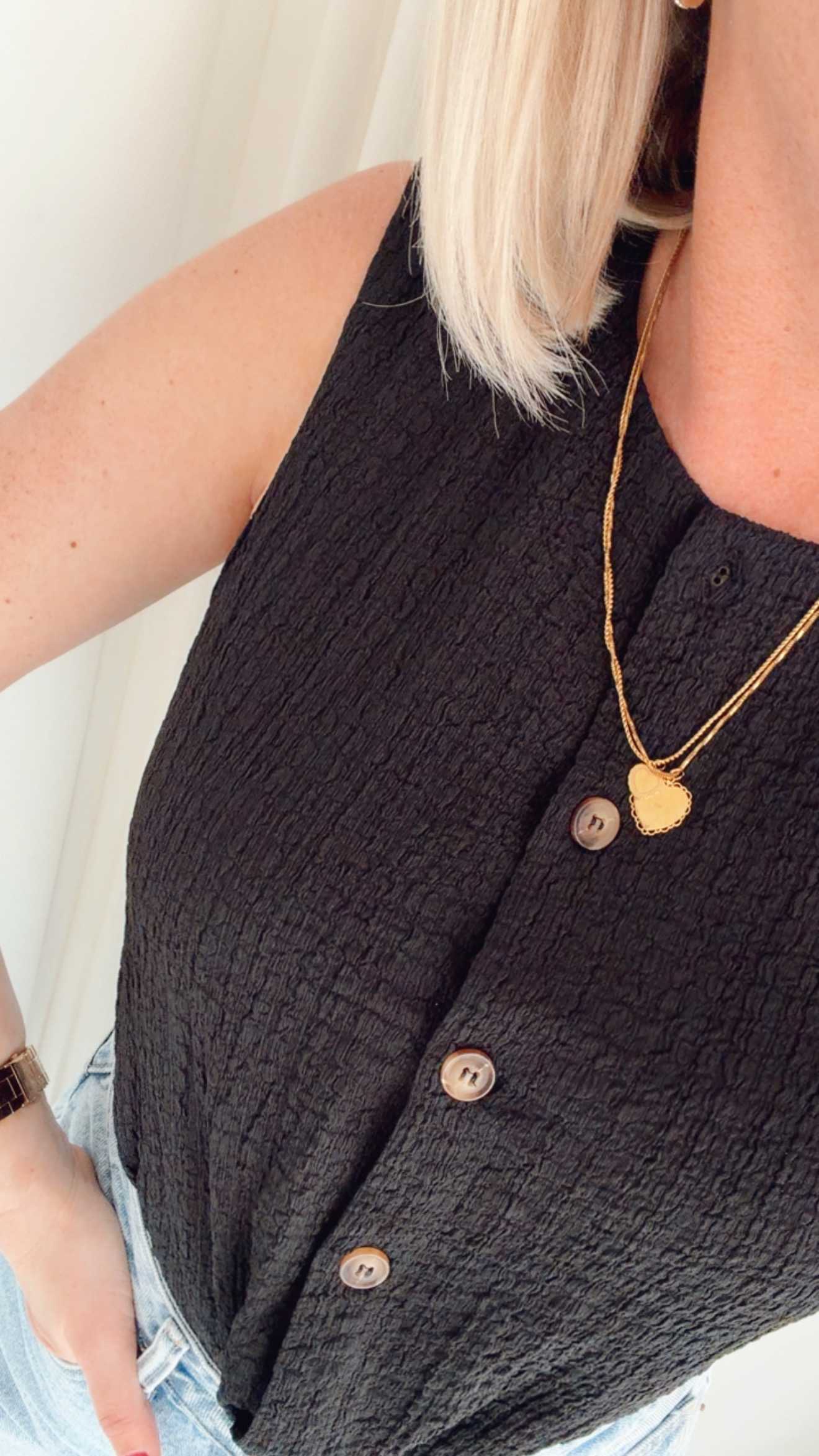 Terug naar de winkelDeze elegante mouwloze top in zwart is de perfecte combinatie van minimalisme en verfijning. De subtiele structuur in de stof geeft de top een luxe uitstraling, terwijl de decoratieve knopen aan de voorzijde zorgen voor een stijlvol en vrouwelijk accent.