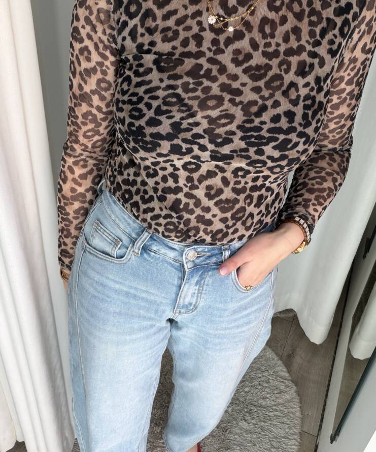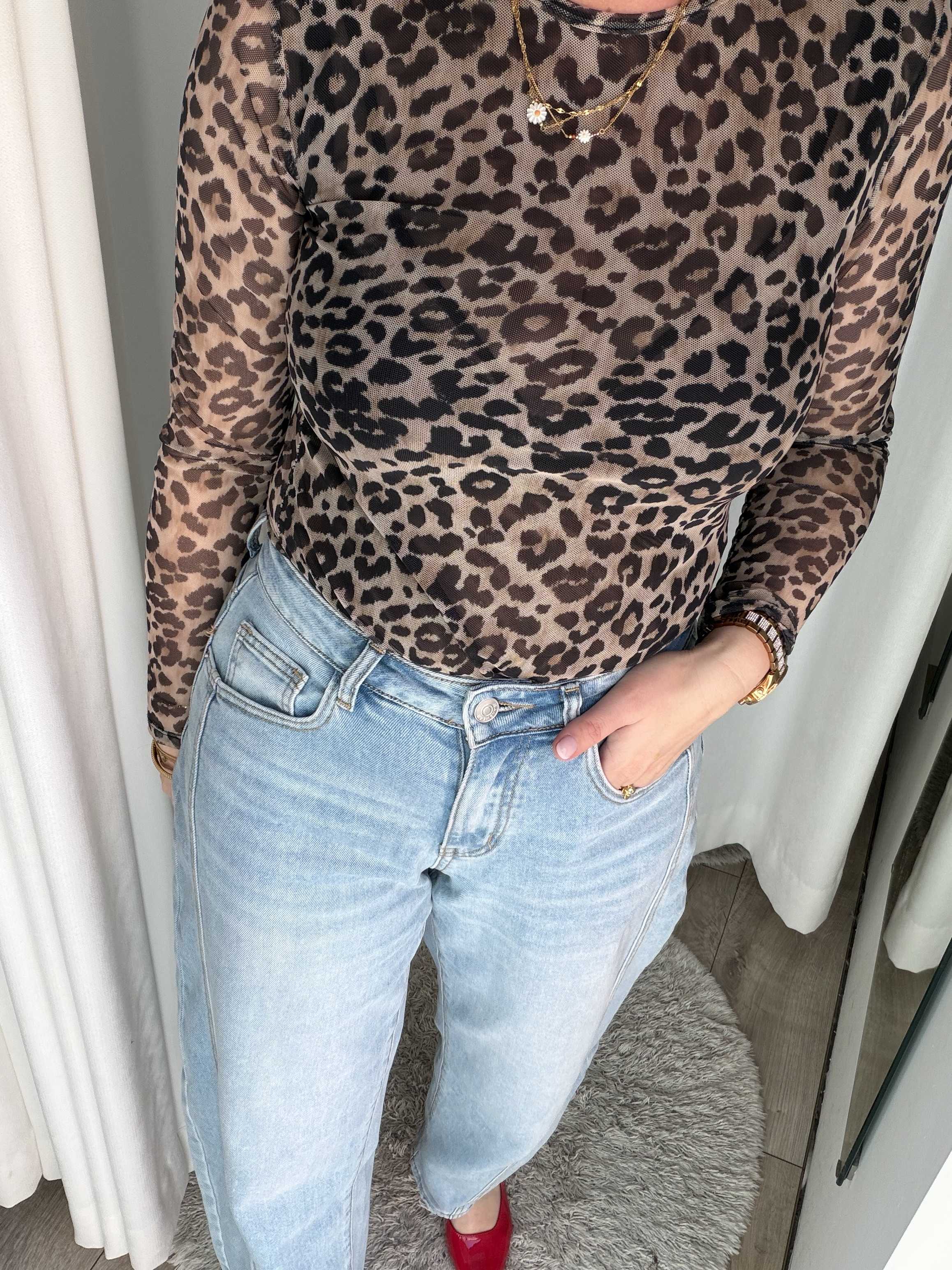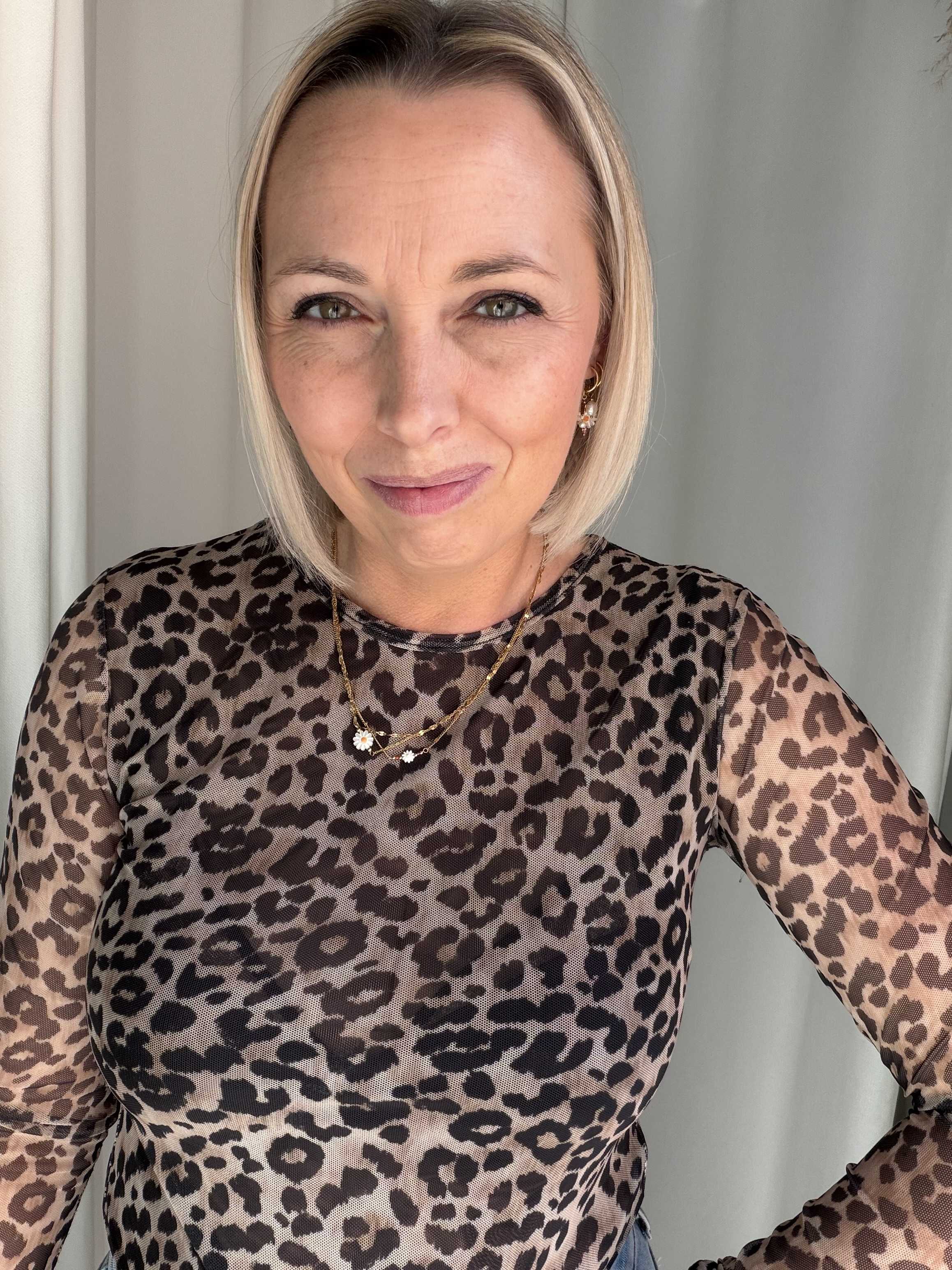 Ga voor een gedurfde en vrouwelijke look met de Wild Mesh Leopard Top. Deze trendy top met panterprint is gemaakt van een zachte, semi-transparante mesh stof die mooi aansluit op het lichaam en zorgt voor een speelse, elegante uitstraling. Perfect om zowel casual als chic te stylen.